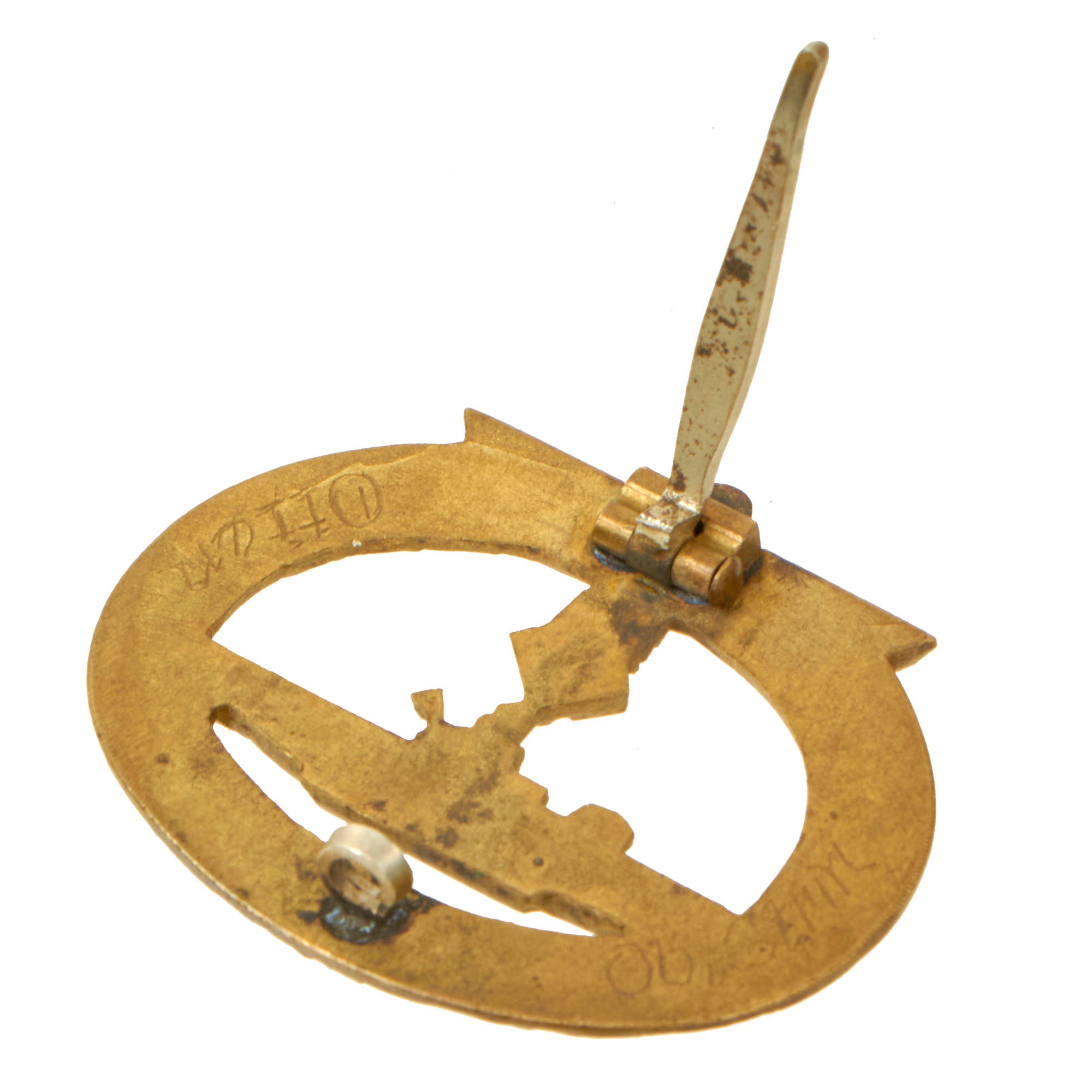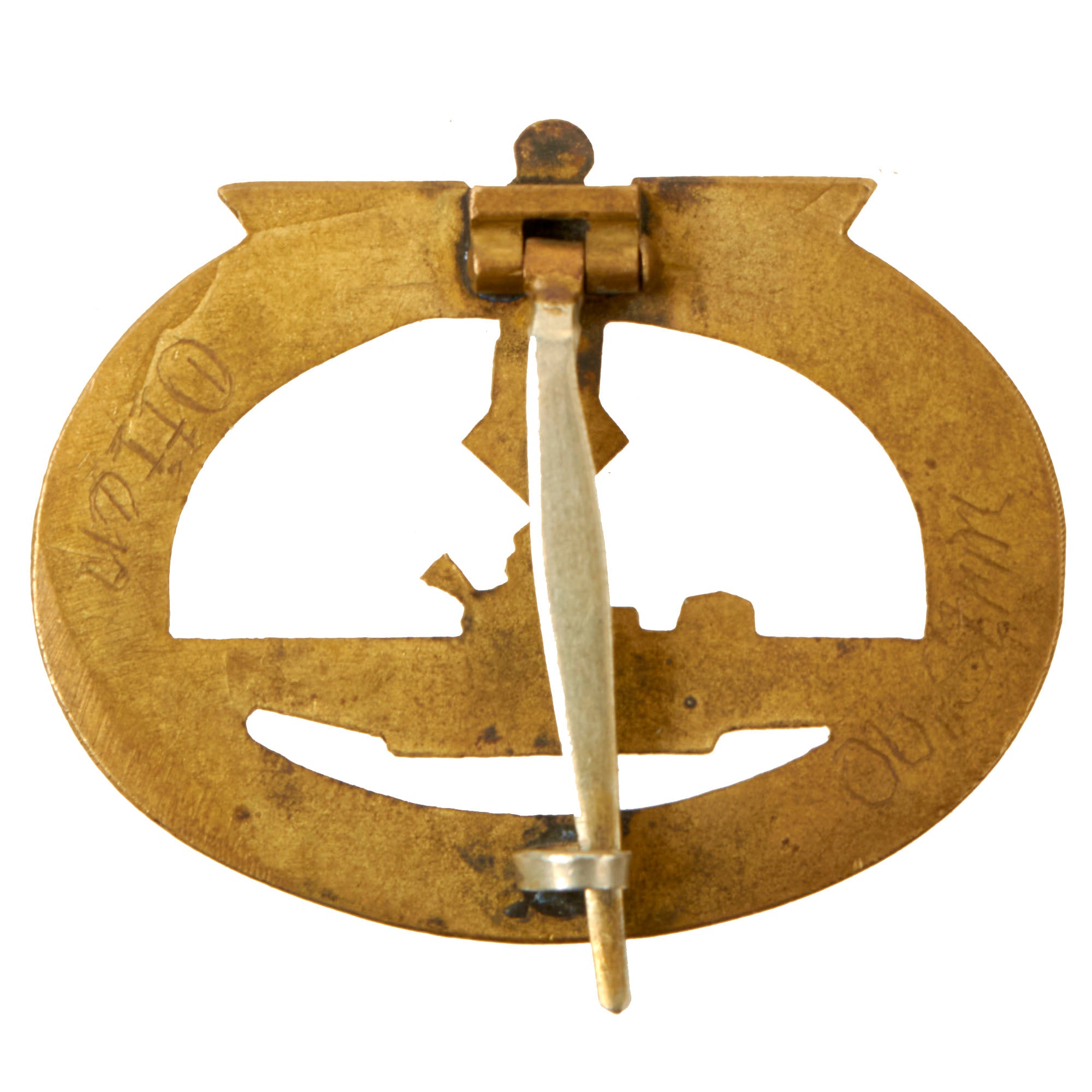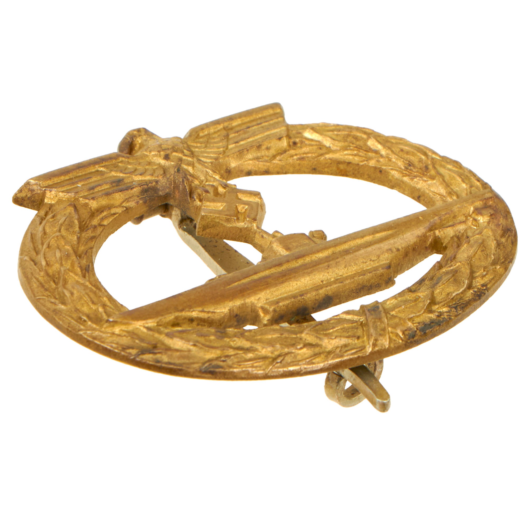 Original Item: Only One Available. Ever seen the film "Das Boot"? If so, you'll recognize this pin-backed badge. The U-boat War Badge (U-Boot-Kriegsabzeichen) was a German war badge that was awarded to U-boat crew members during World War I and World War II. This early pattern does not have any maker marking on the back, but the tombac construction, fire gilding, and tapered "German silver' pinback are textbook for unmarked examples made by the desirable C.E. Juncker of Berlin. We have compared it to other examples, and the hardware is identical, and as described in The Kriegsmarine Awards by Sascha Weber and Gerhard P. Skora, page 56.
