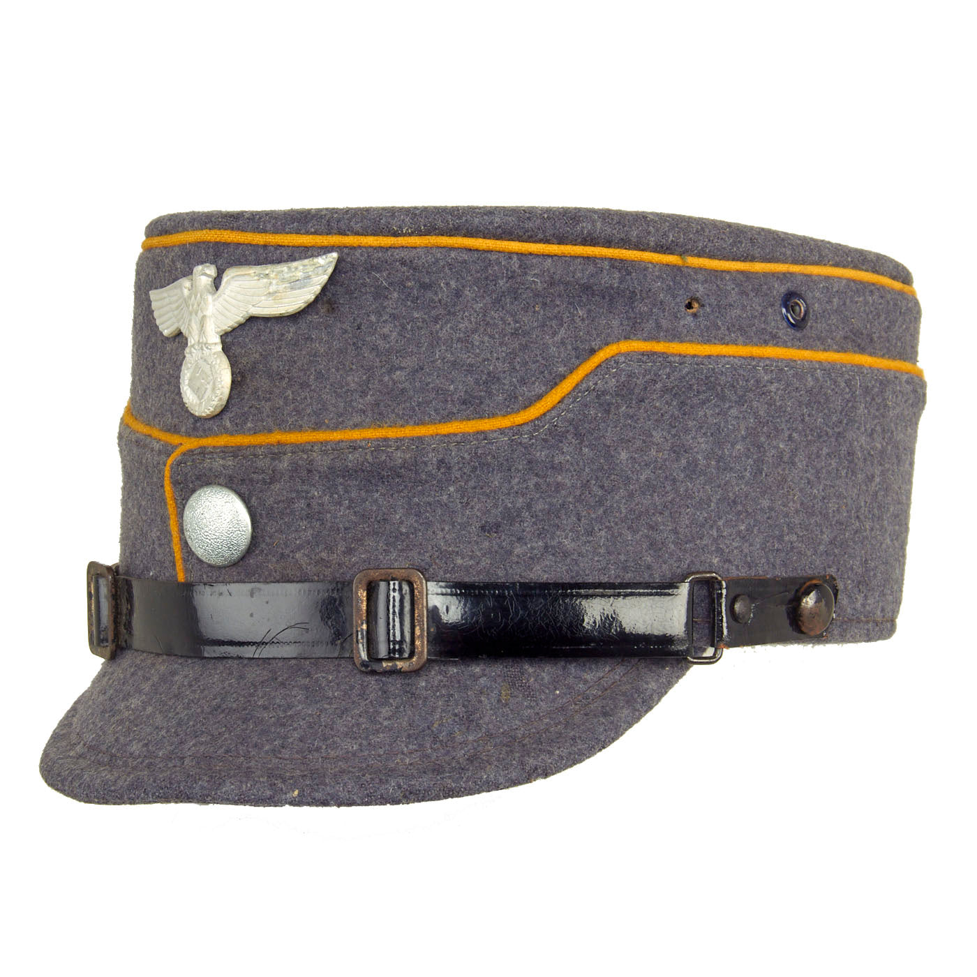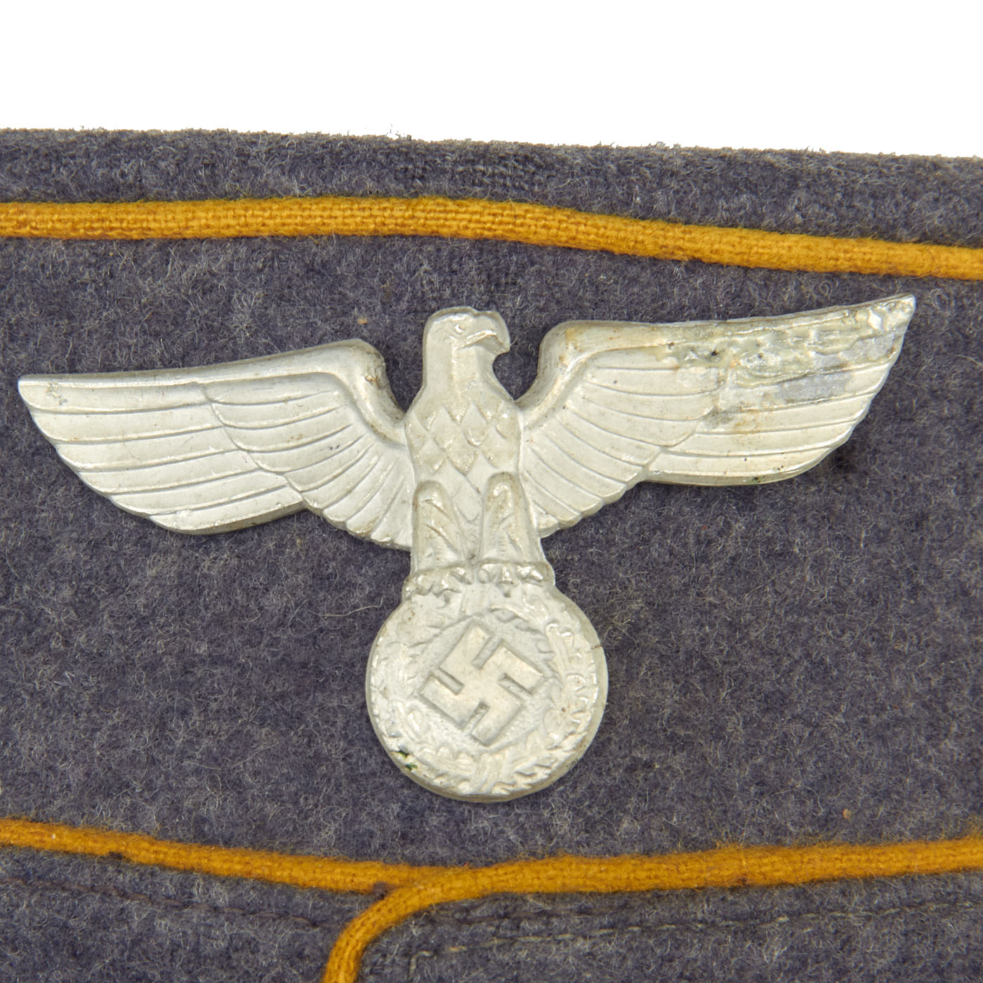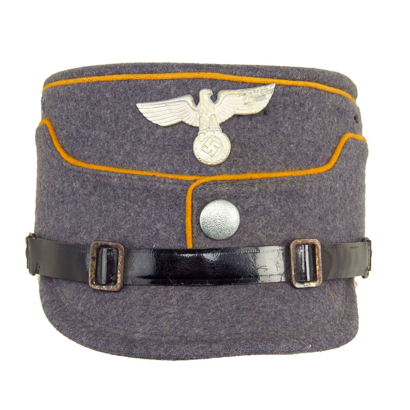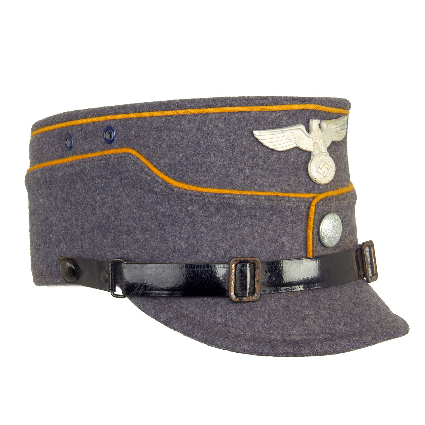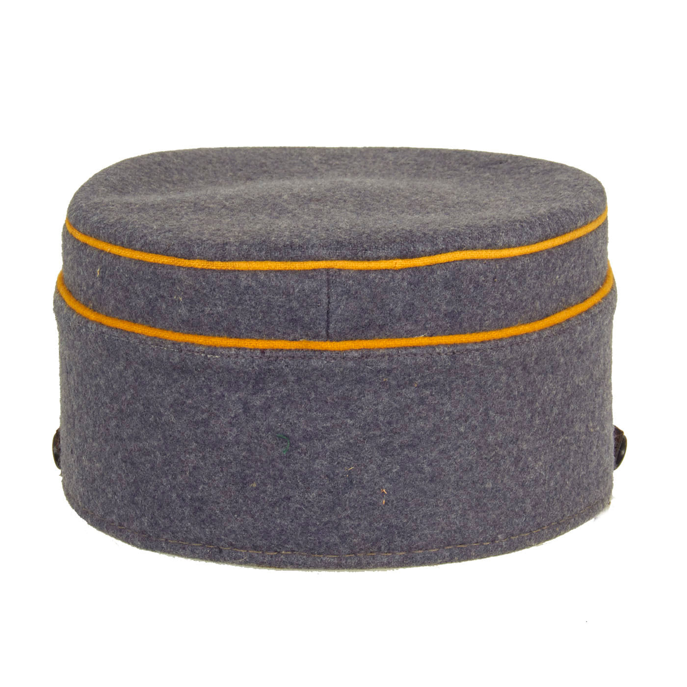 Original Item: Only One available. This is a very nice example of a rare German WWII NSFK Service Kepi, often called a "Coffee Can Hat." These were worn by NSFK members when in uniform, such as at meetings and recruiting events. It is made of Fliegerblau (Flyer's Blue) wool woven fabric, with a faux scalloped skirt, and very nice Goldgelb (gold-yellow) piping around the crown and scallop. The front crown has the correct early war NSFK Reichsadler above a silver button.
