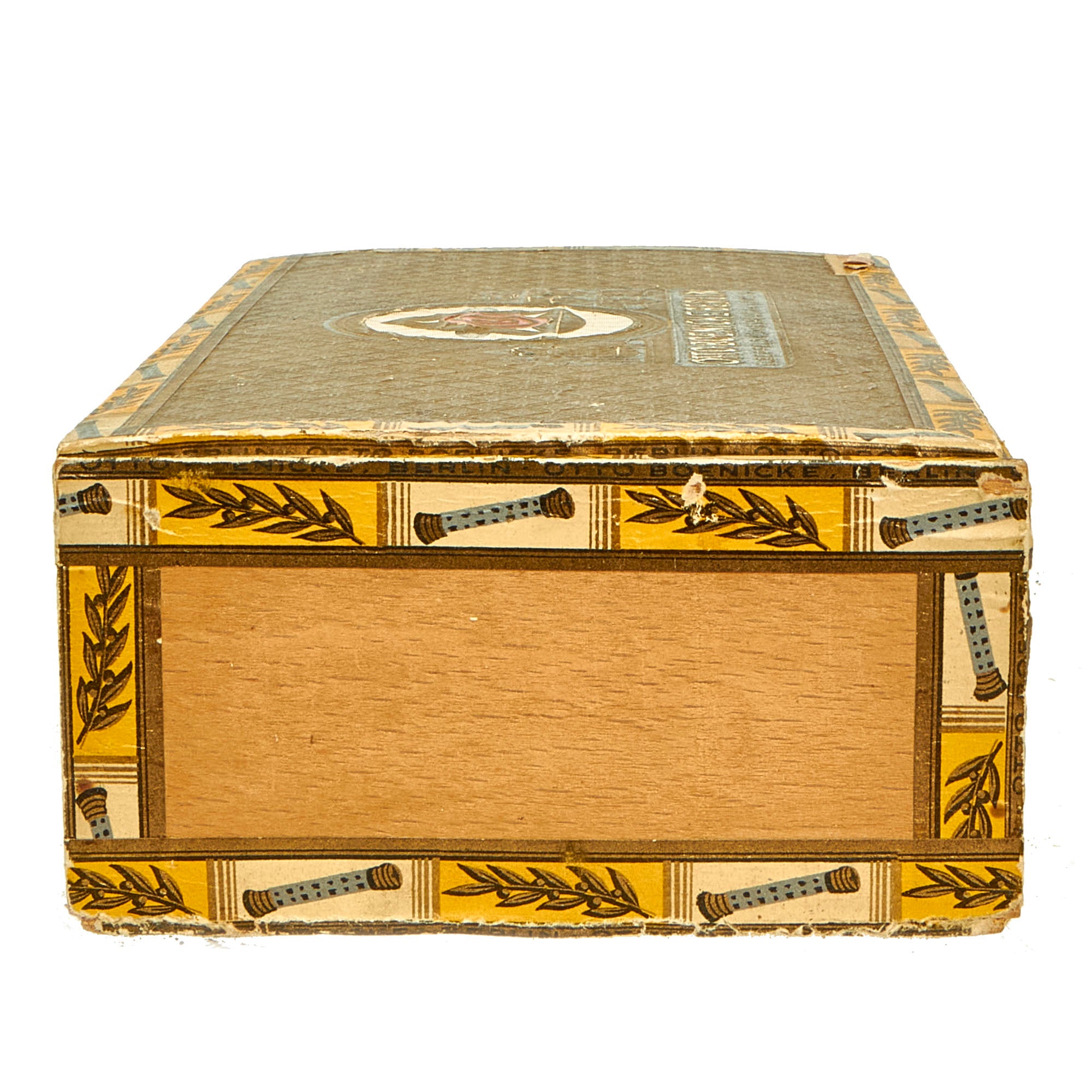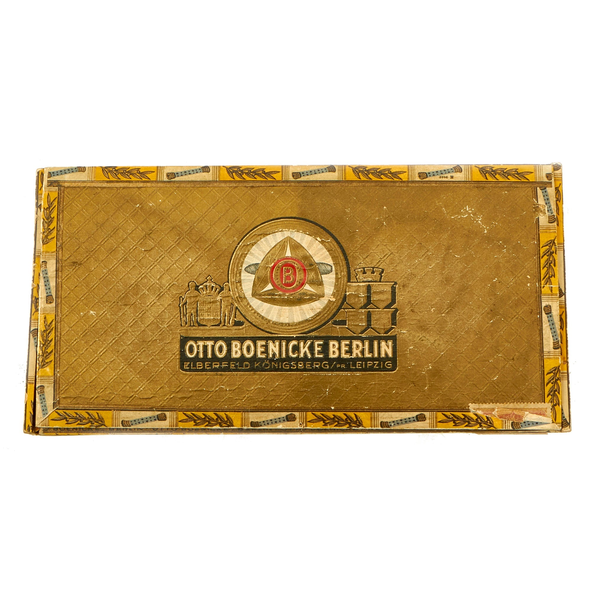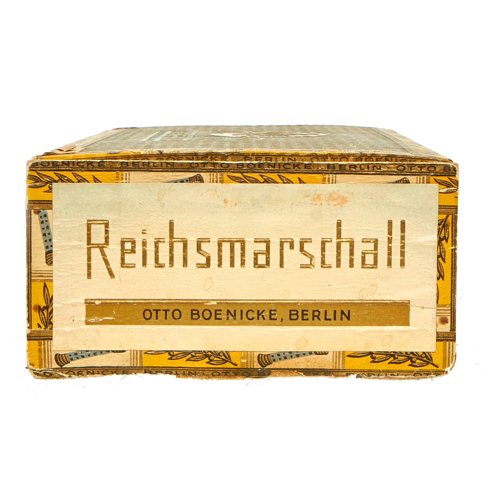 This box for cigars bears the maker logo OTTO BOENICKE BERLIN on the lid, and on the inside the lid is a print and signature of Hermann Göring. There are also numerous Reichsmarschall batons in a border around the entire box. The word Reichsmarschall is present on one of the smaller ends of the box, and there is the correct tax stamp with an NSDAP Reichsadler raised stamp. The front of the box is marked No. 20 Extra Sandblatt, indicating the type of cigars it contained. We have compared this box to other known examples, and it is definitely genuine. It measures 9 1/4" x 4 5/8" x 2 3/8", and looks to be made from wood covered with paper.