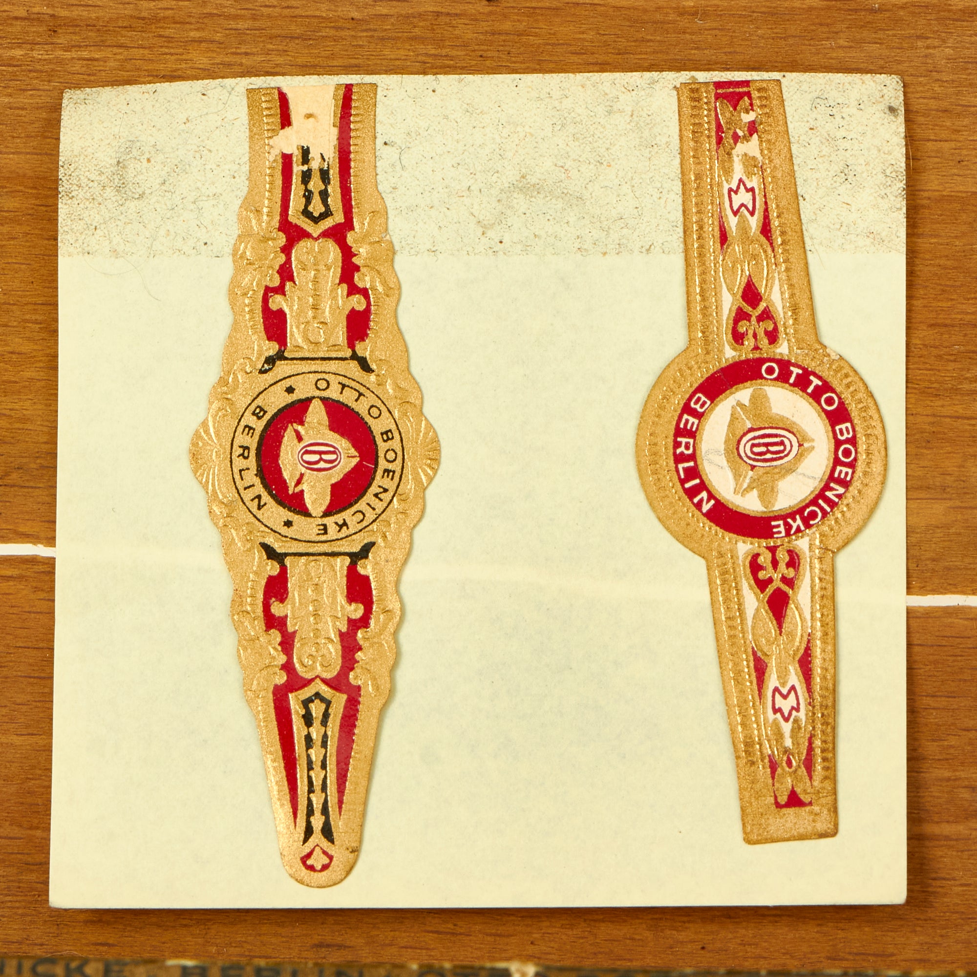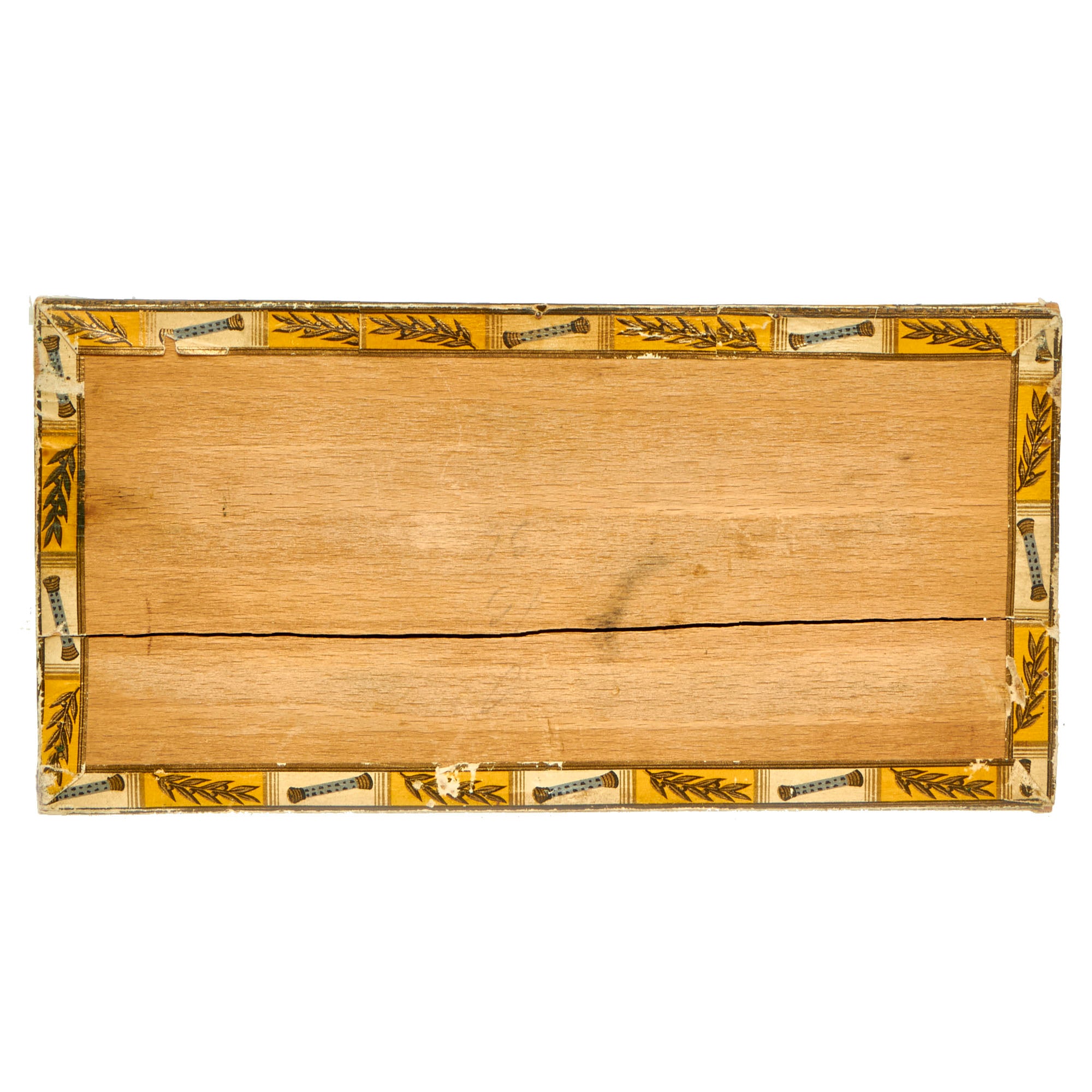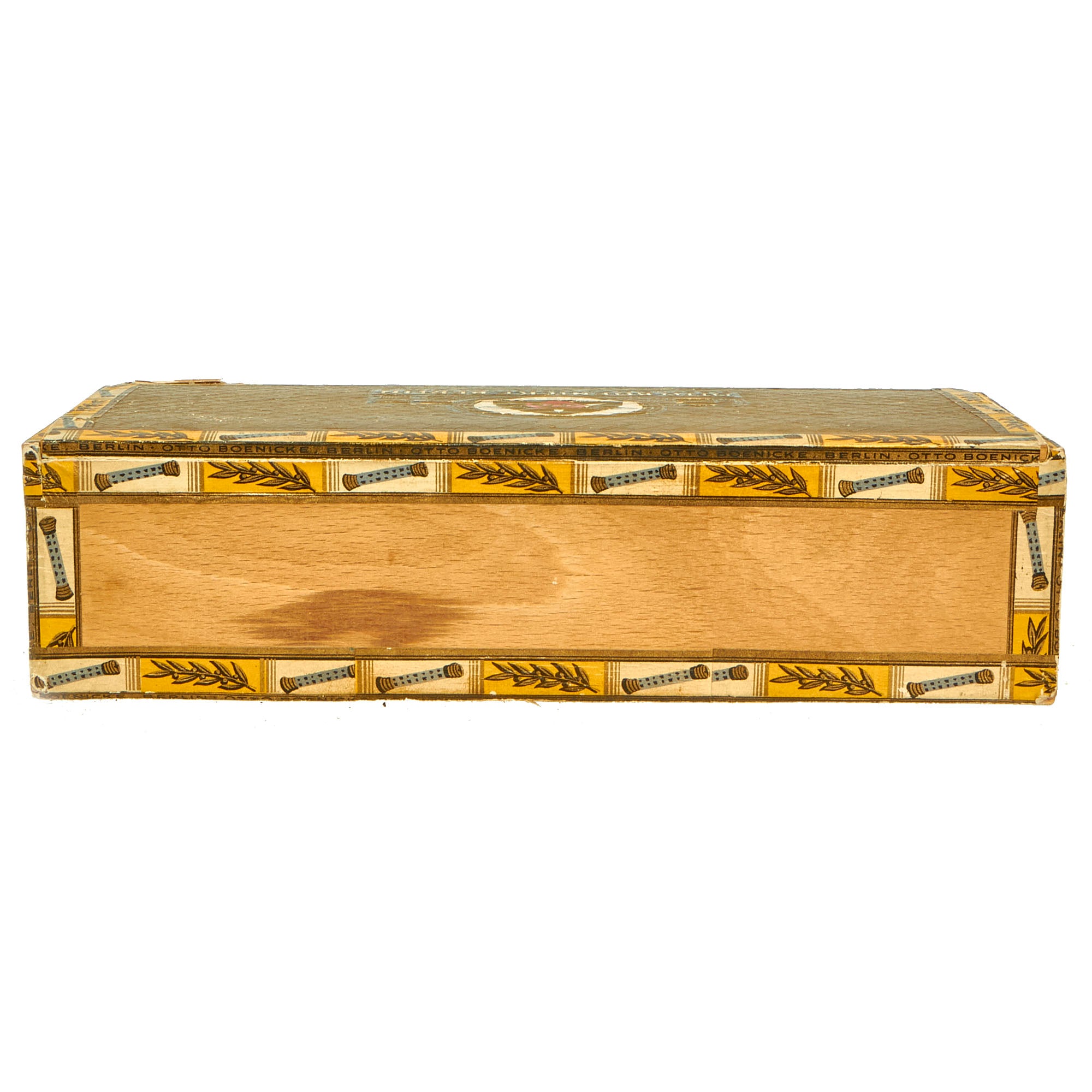 This box for cigars bears the maker logo OTTO BOENICKE BERLIN on the lid, and on the inside the lid is a print and signature of Hermann Göring. There are also numerous Reichsmarschall batons in a border around the entire box. The word Reichsmarschall is present on one of the smaller ends of the box, and there is the correct tax stamp with an NSDAP Reichsadler raised stamp. The front of the box is marked No. 20 Extra Sandblatt, indicating the type of cigars it contained. We have compared this box to other known examples, and it is definitely genuine. It measures 9 1/4" x 4 5/8" x 2 3/8", and looks to be made from wood covered with paper.