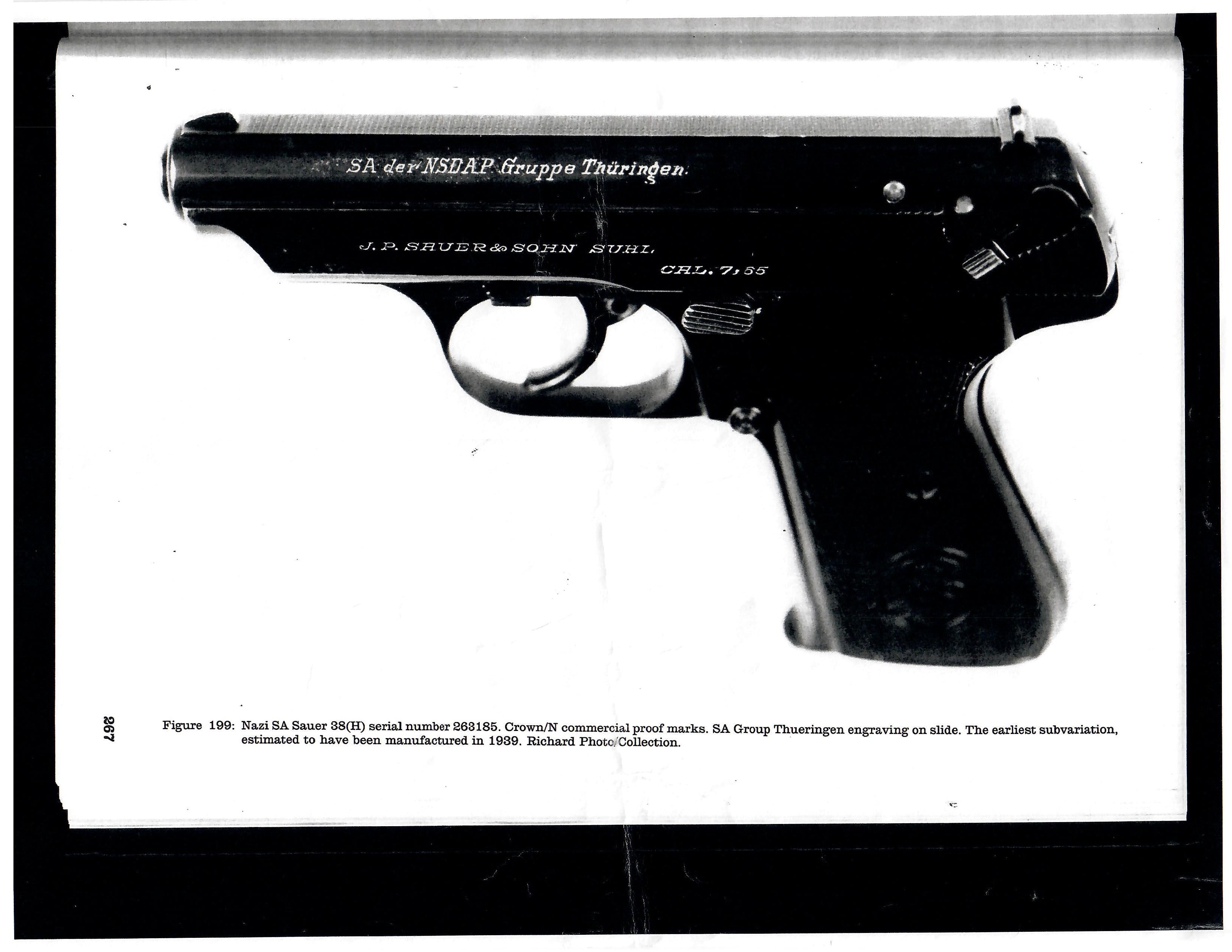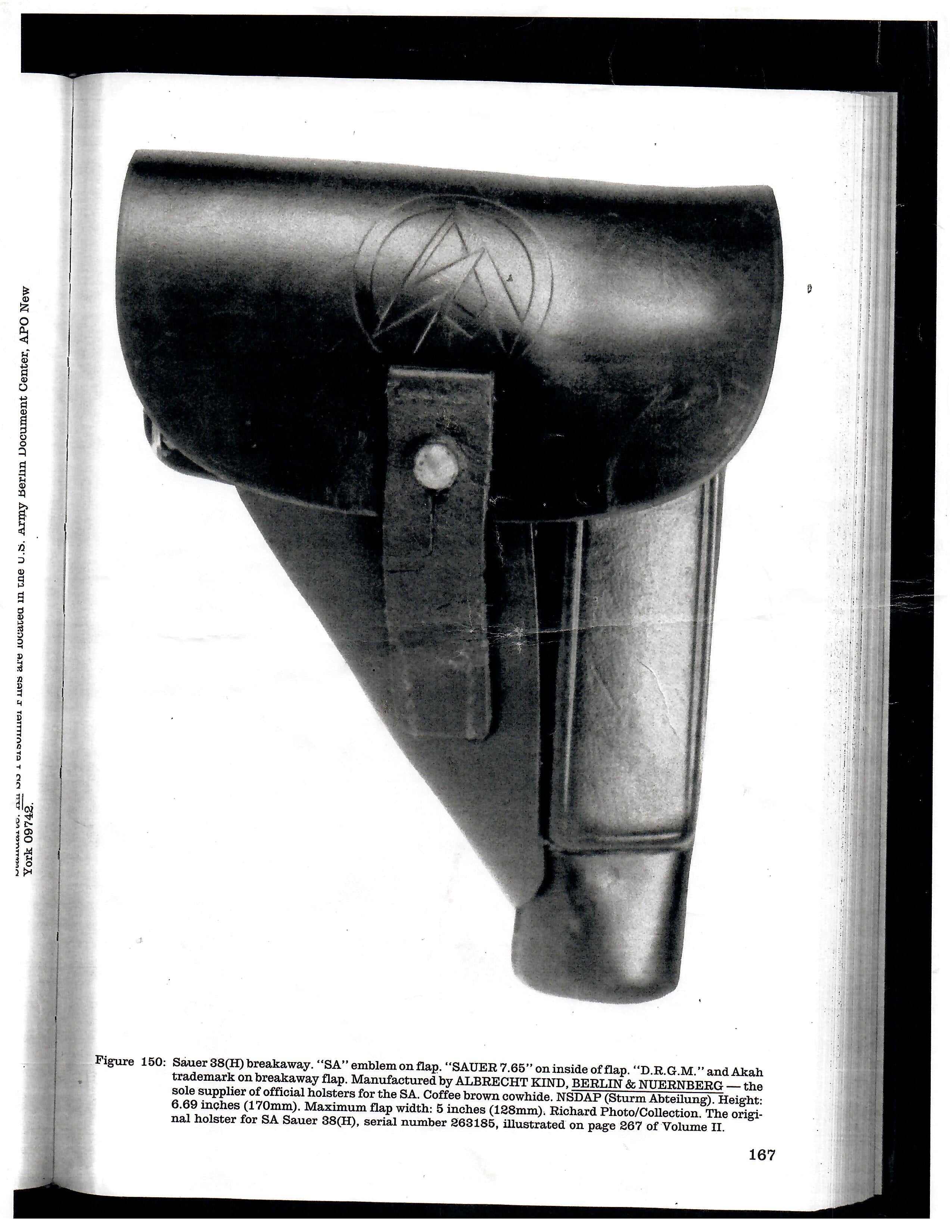 Original Item: One-of-a-Kind. This is a fantastic find! Here we have a very rare German WWII leather breakaway holster for the Sauer 38H pistol, marked on the top flap with the emblem of the Sturmabteilung (Storm Detachment or SA)! 7.65 / .32ACP caliber "pocket" pistols were very popular sidearms for members of the SA and other political organizations.