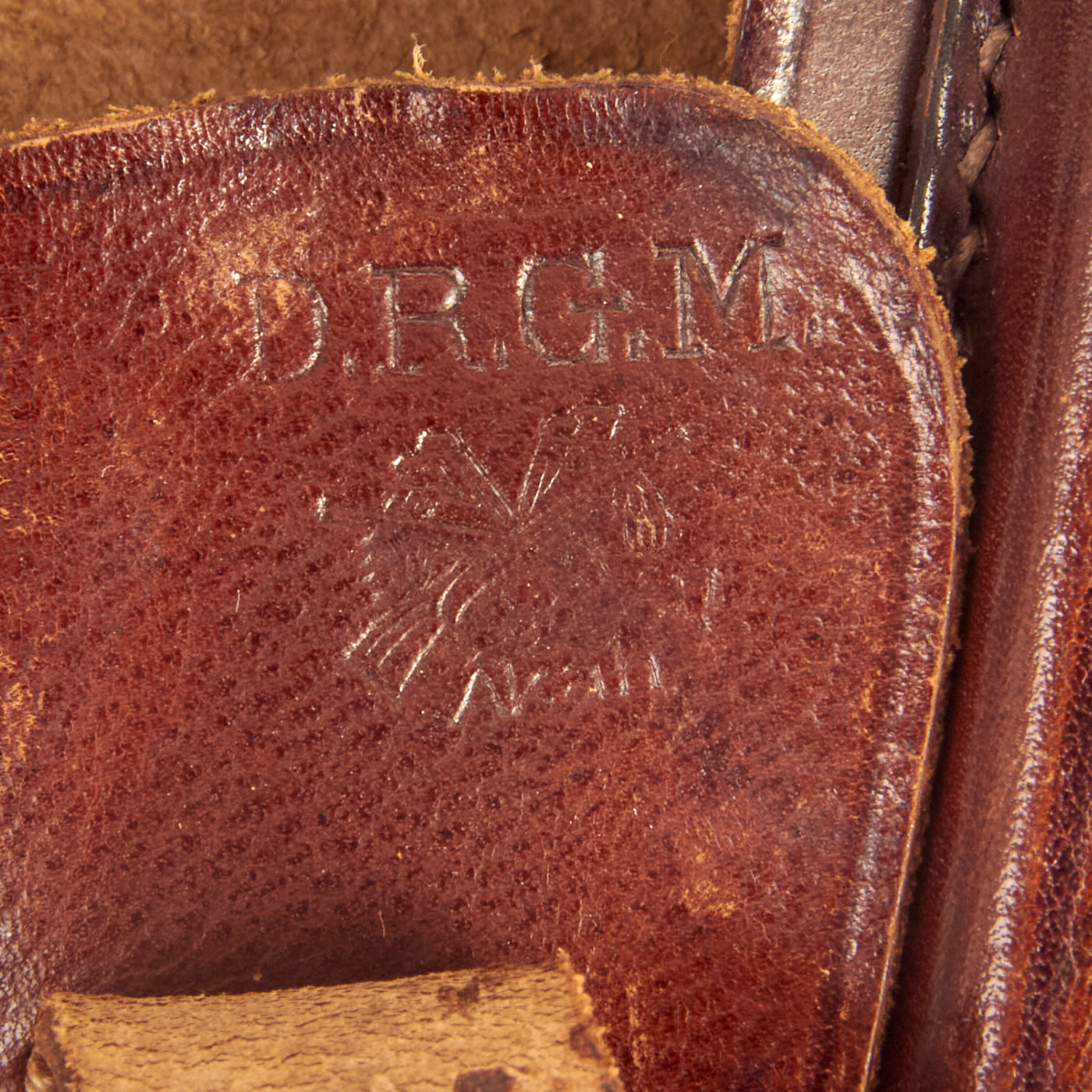The top of the breakaway flap under the securing strap is embossed with the AKAH trademark logo: a wreath of Oak and Olive branches overlaid with crossed Rifles, surmounted by a pistol and a revolver with their muzzles pointed downwards. Underneath is AKah, for Albrecht Kind aus (from) Hunstig, a company that operated in Berlin and Nürnberg. D.R.G.M. is embossed above the logo, for Deutsches Reich Gebrauchs Muster (Registered Design of the German Reich), indicating that the holster is a protected design.