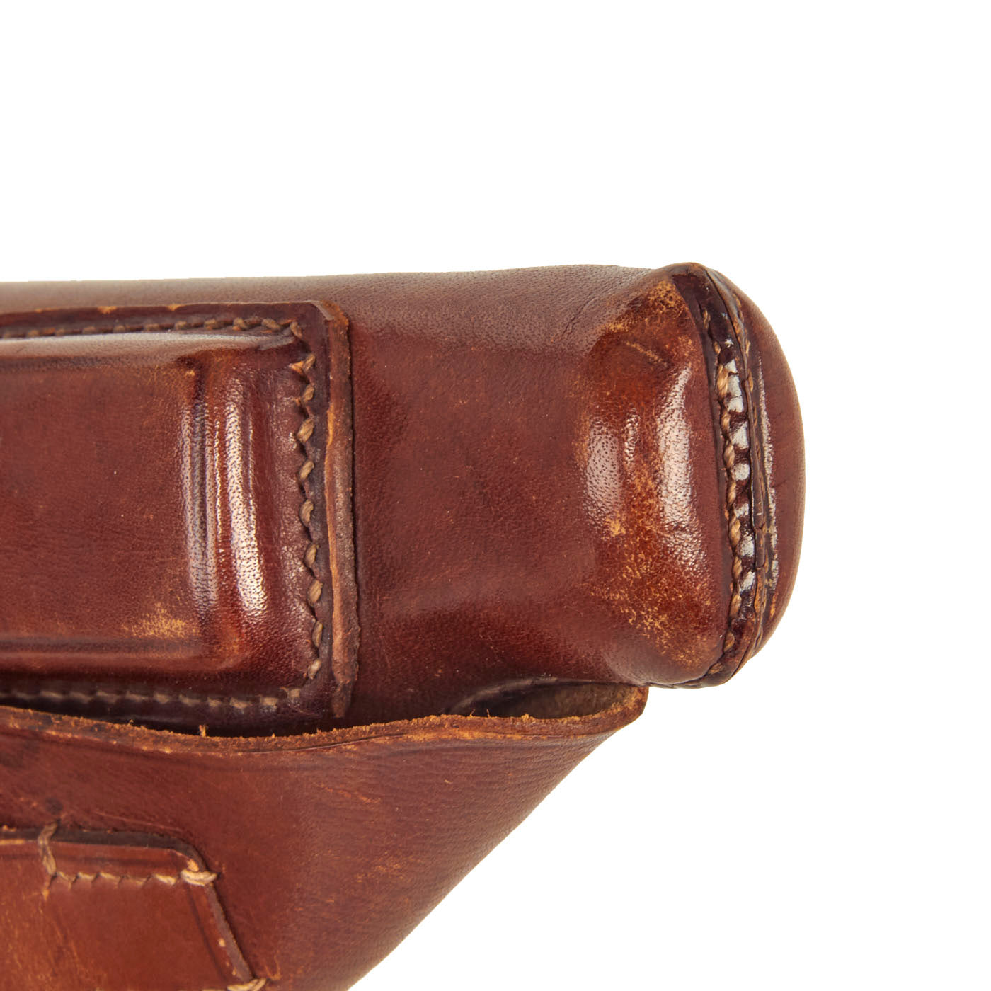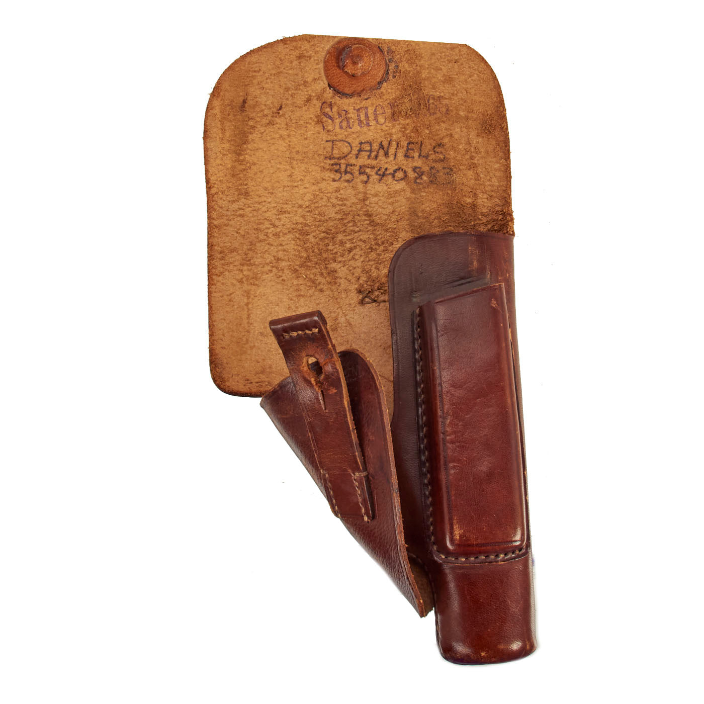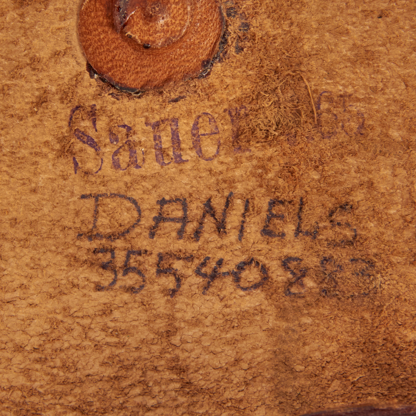 The design follows the standard breakaway "high-front" design of the period. Some holsters were made to fit a variety of the various pistols in this chambering, however this one was made specifically to fit the Sauer 38H, as indicated by the faint Sauer 7.65 marking stamped under the top flap. There is also the name DANIELS and number 35540883, which could be the serial number and owner of the pistol. We assume that this was added post war, but it could be a wartime marking.