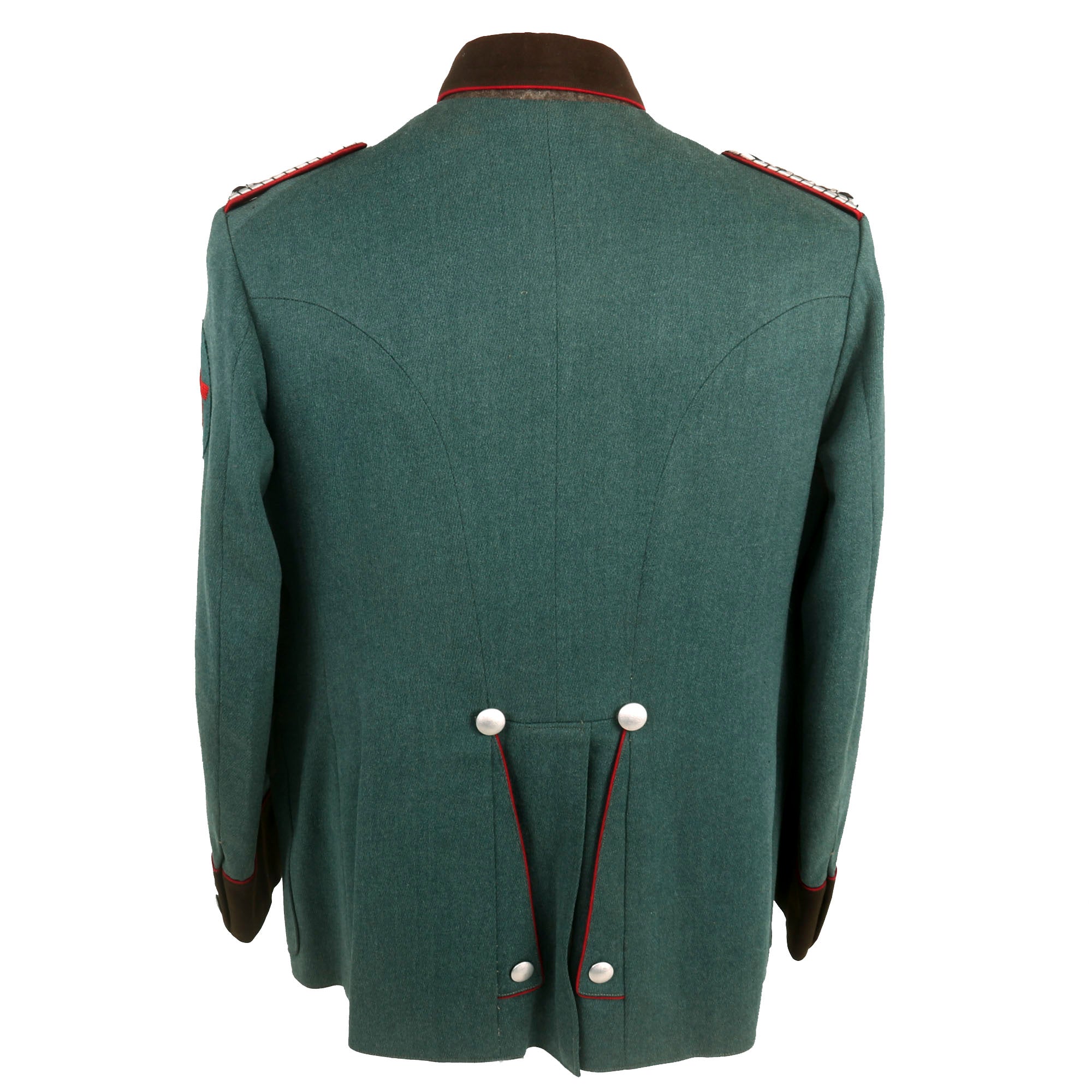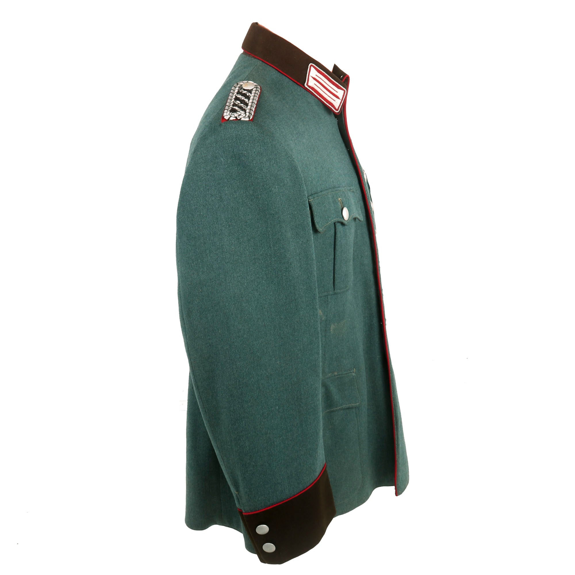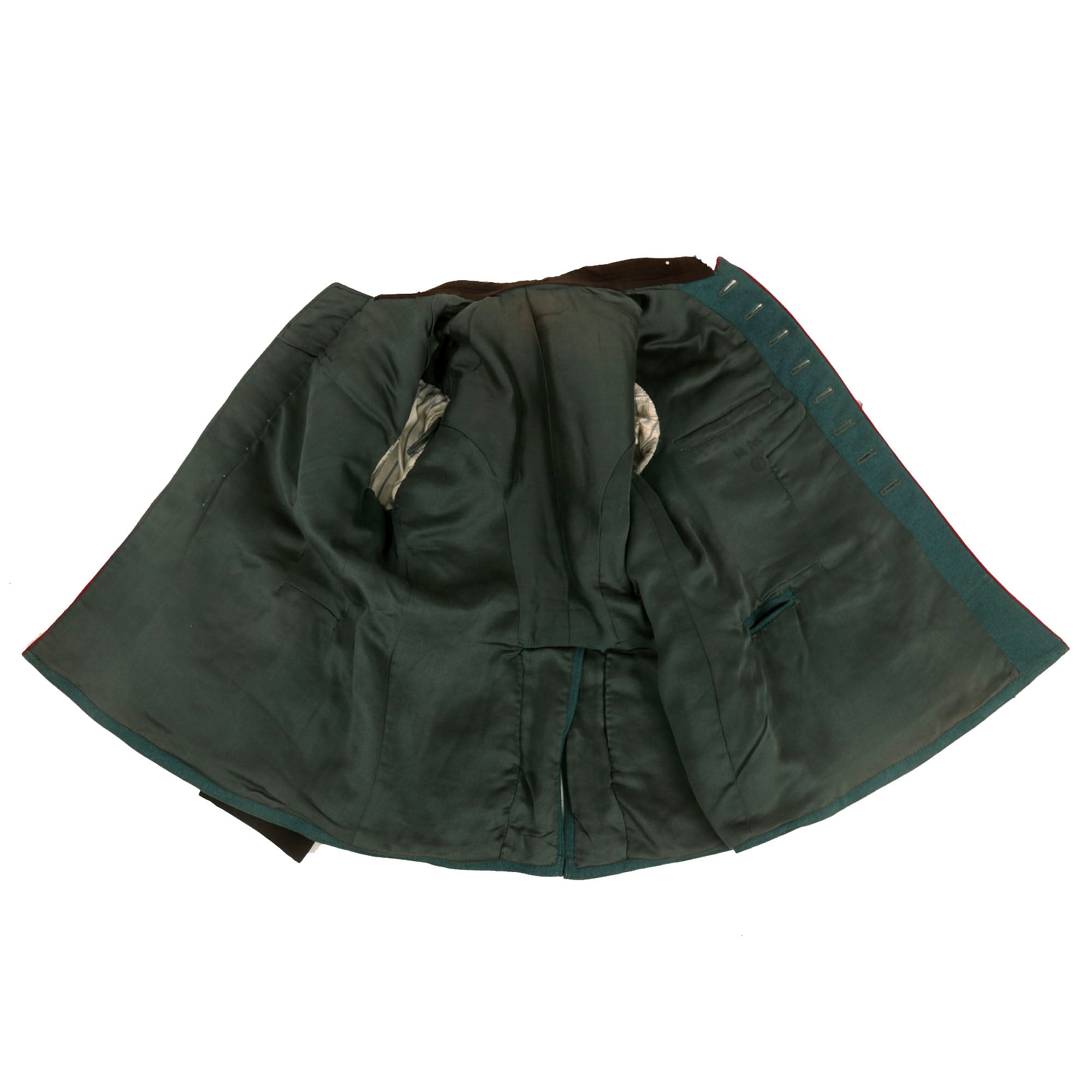 This is a lovely example of a rare Schutzpolizei des Gemeinden Meister NCO's M-36 tunic, made of fine quality police-green wool "whipcord weave" gabardine twill. In form these tunics are more or less identical to the Army Heer tunic except for the colors used. They may also have some additional ornamentation when compared to the standard Army issue. The tunic features two pleated breast pockets with scalloped flaps over two large flat waist pockets, which also feature scalloped flaps. These are secured with pebbled aluminum buttons, and the tunic has an eight button front closure, with three "hook and loop" fasteners for the collar. The rear of the tunic features an overlapping rear vent with ornamental buttons. The buttons on the tunic are sewn directly to the fabric, not attached with metal circlips, and all are in great shape. They all look to have maker markings stamped onto the back.