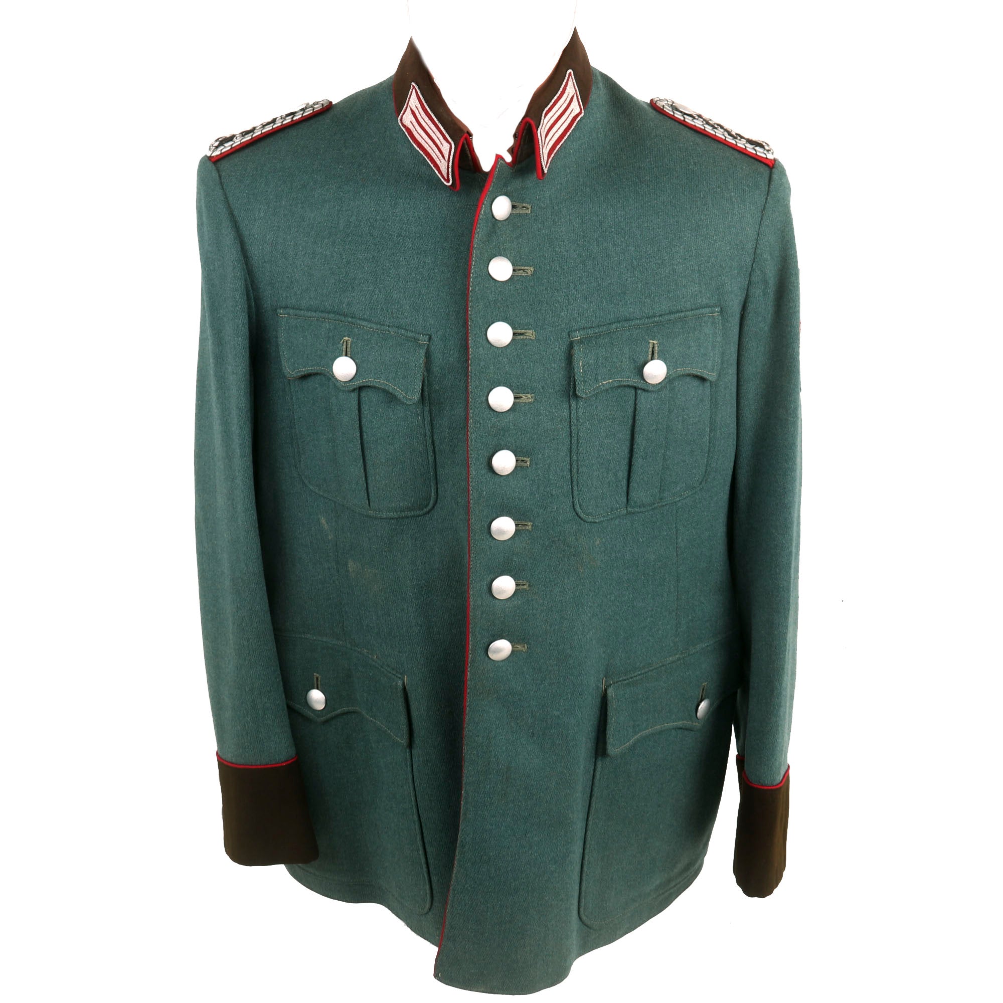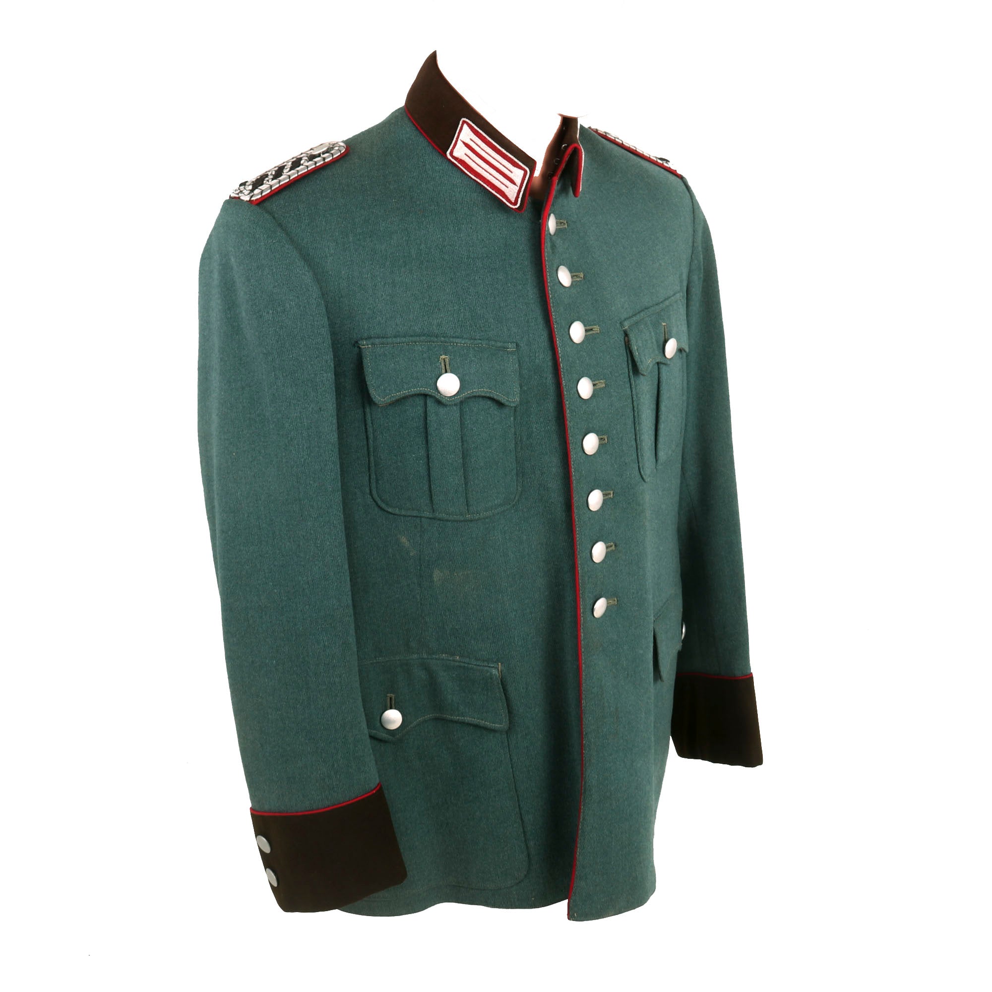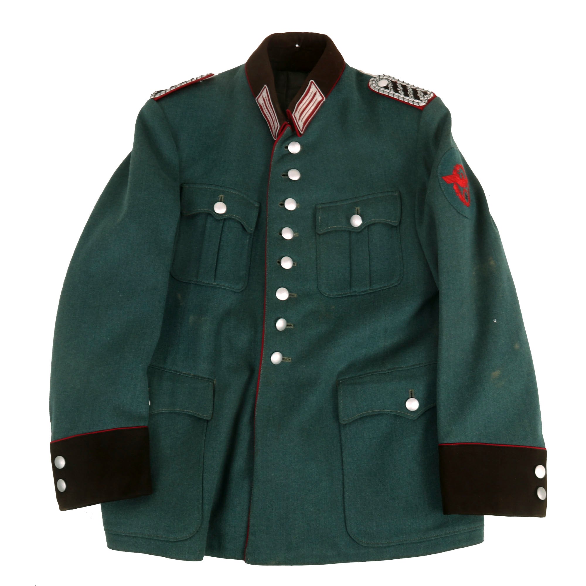 This is a lovely example of a rare Schutzpolizei des Gemeinden Meister NCO's M-36 tunic, made of fine quality police-green wool "whipcord weave" gabardine twill. In form these tunics are more or less identical to the Army Heer tunic except for the colors used. They may also have some additional ornamentation when compared to the standard Army issue. The tunic features two pleated breast pockets with scalloped flaps over two large flat waist pockets, which also feature scalloped flaps. These are secured with pebbled aluminum buttons, and the tunic has an eight button front closure, with three "hook and loop" fasteners for the collar. The rear of the tunic features an overlapping rear vent with ornamental buttons. The buttons on the tunic are sewn directly to the fabric, not attached with metal circlips, and all are in great shape. They all look to have maker markings stamped onto the back.