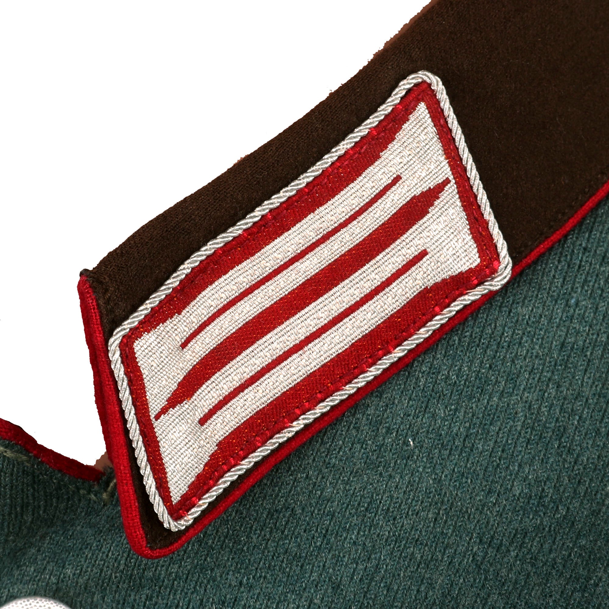 The collar is wrapped in a brown "badge cloth" wool, has police NCO's litzen collar patches on each side, which are machine woven from silver bullion thread with a Police bordeauxrot (Bordeaux or Wine Red) background, the Truppenfarbe (Troop Color) of the Schutzpolizei des Gemeinden. The collar is in very good shape, showing only minor areas of wear, and has wine red piping around the edge. This would usually be the first place on the uniform to show wear, so it definitely does not look to have seen extensive use. The sleeve cuffs are covered with the same brown cloth as the collar, and the cuffs, front closure, and rear vent are piped in wine red as well.