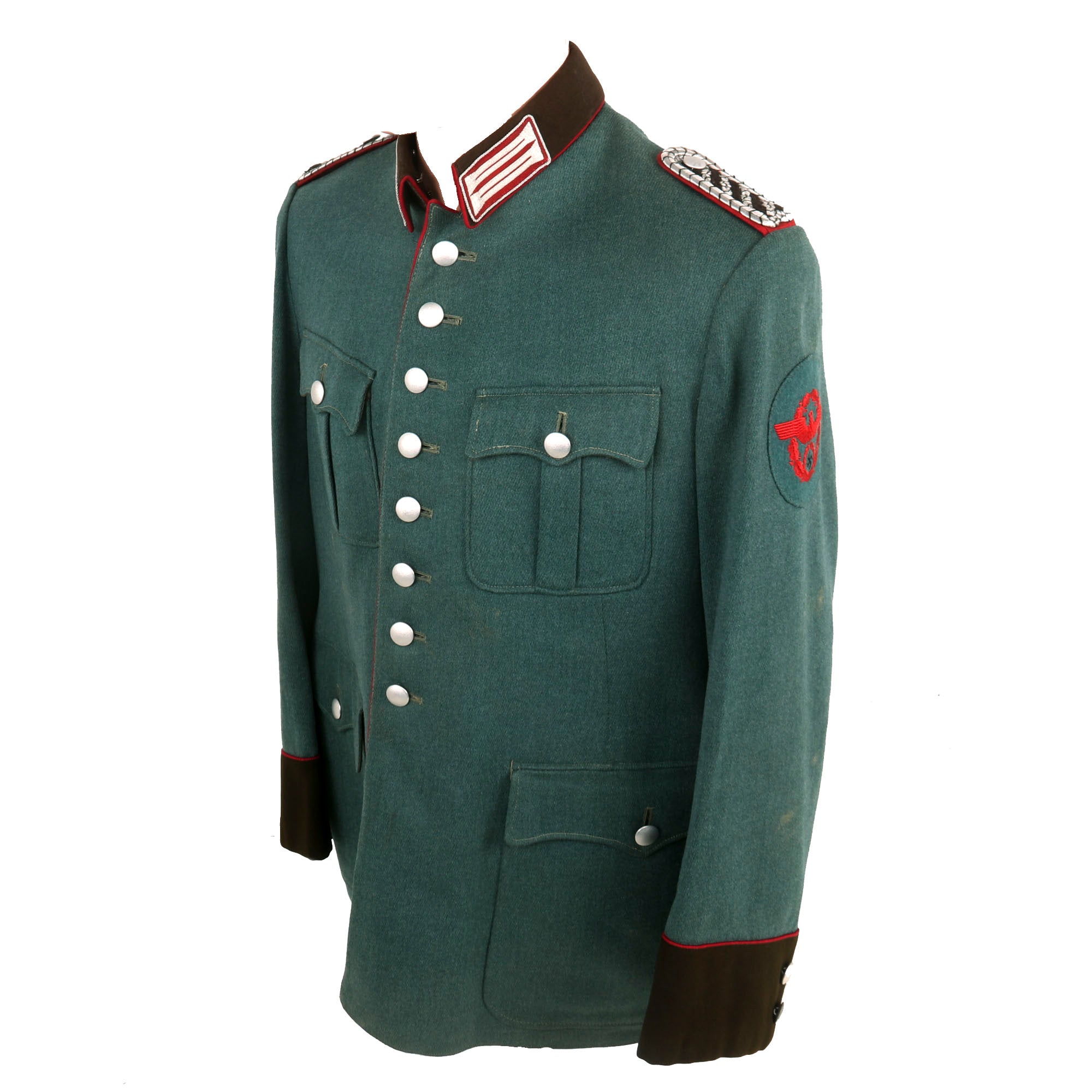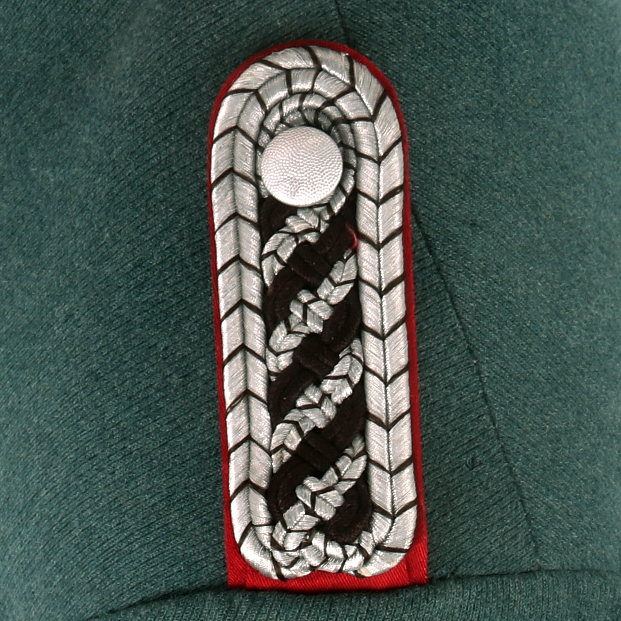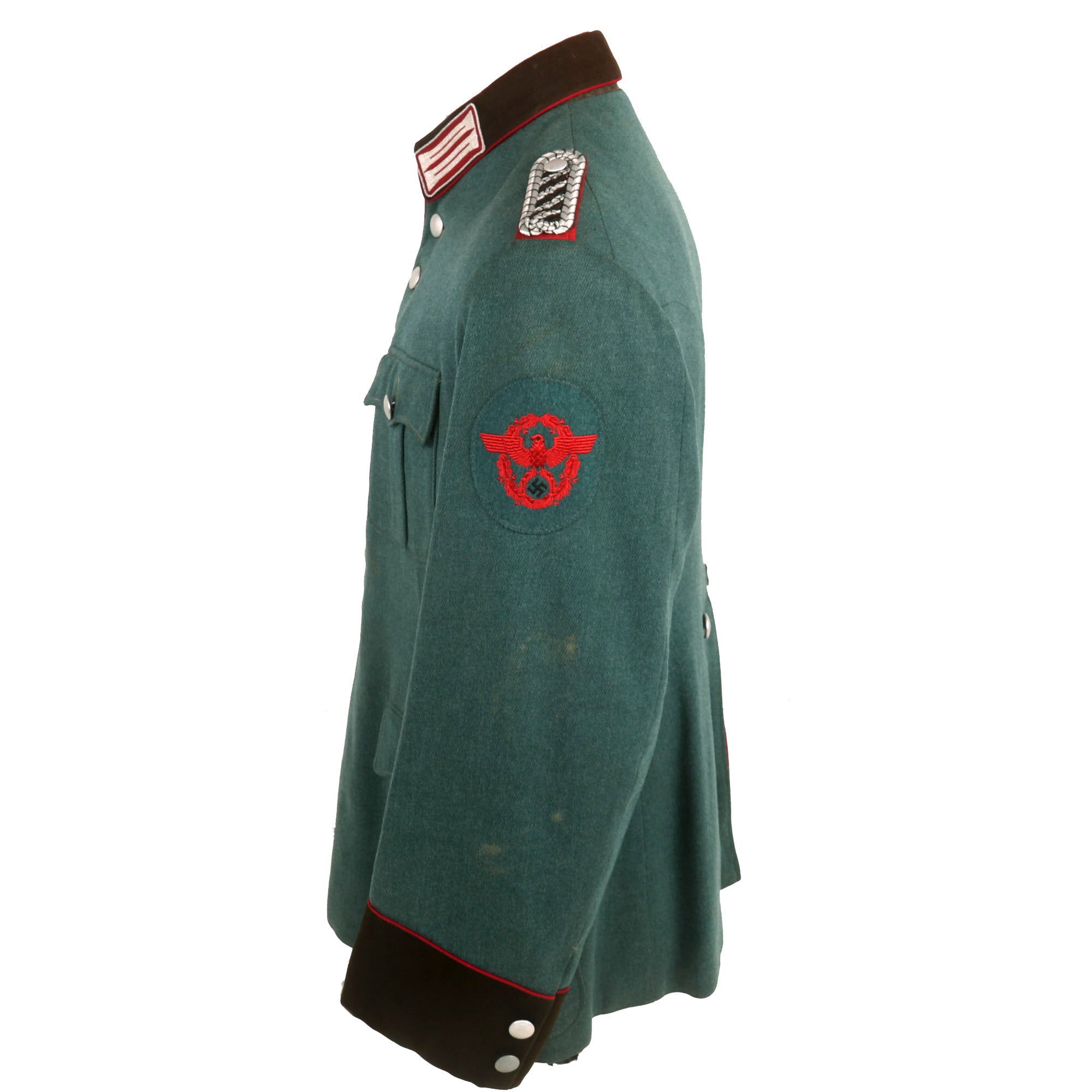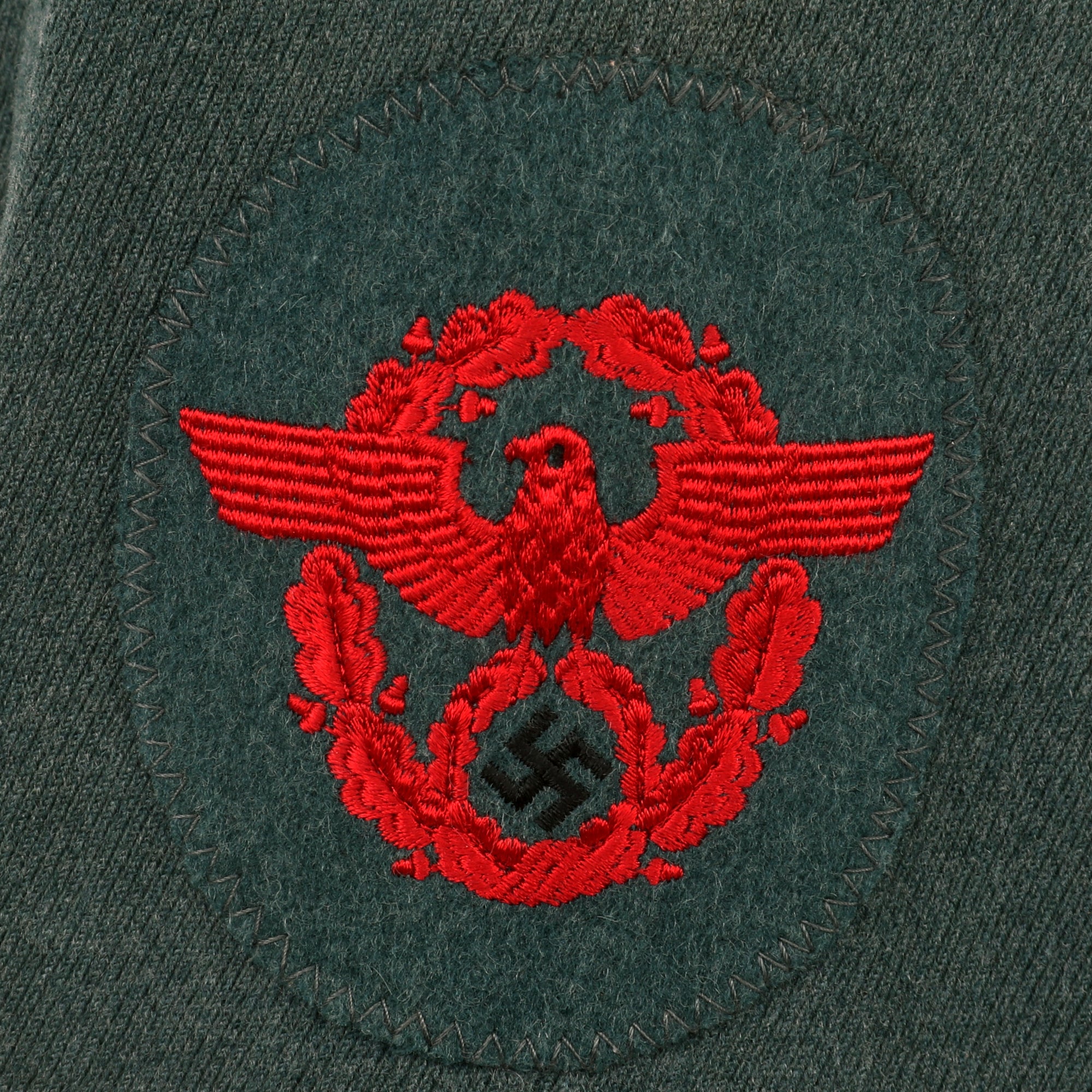 Up until 1941, members of the Ordnungspolizei often had names of the location they served on the left sleeve eagle, which was embroidered to match the truppenfarbe, however this was discontinued. Then in 1942 the Schupo des Gemeinden was absorbed into the Schupo des Reiches, effectively ending the branch's existence. All members were then considered part of the Schutzpolizei des Reiches and utilized the light green troop colors. This also means that any officer who continued service would have to get the piping and insignia changed on their uniform, so it is quite rare to find a Schutzpolizei des Gemeinden tunic like this, which still has all of the correct insignia in place.