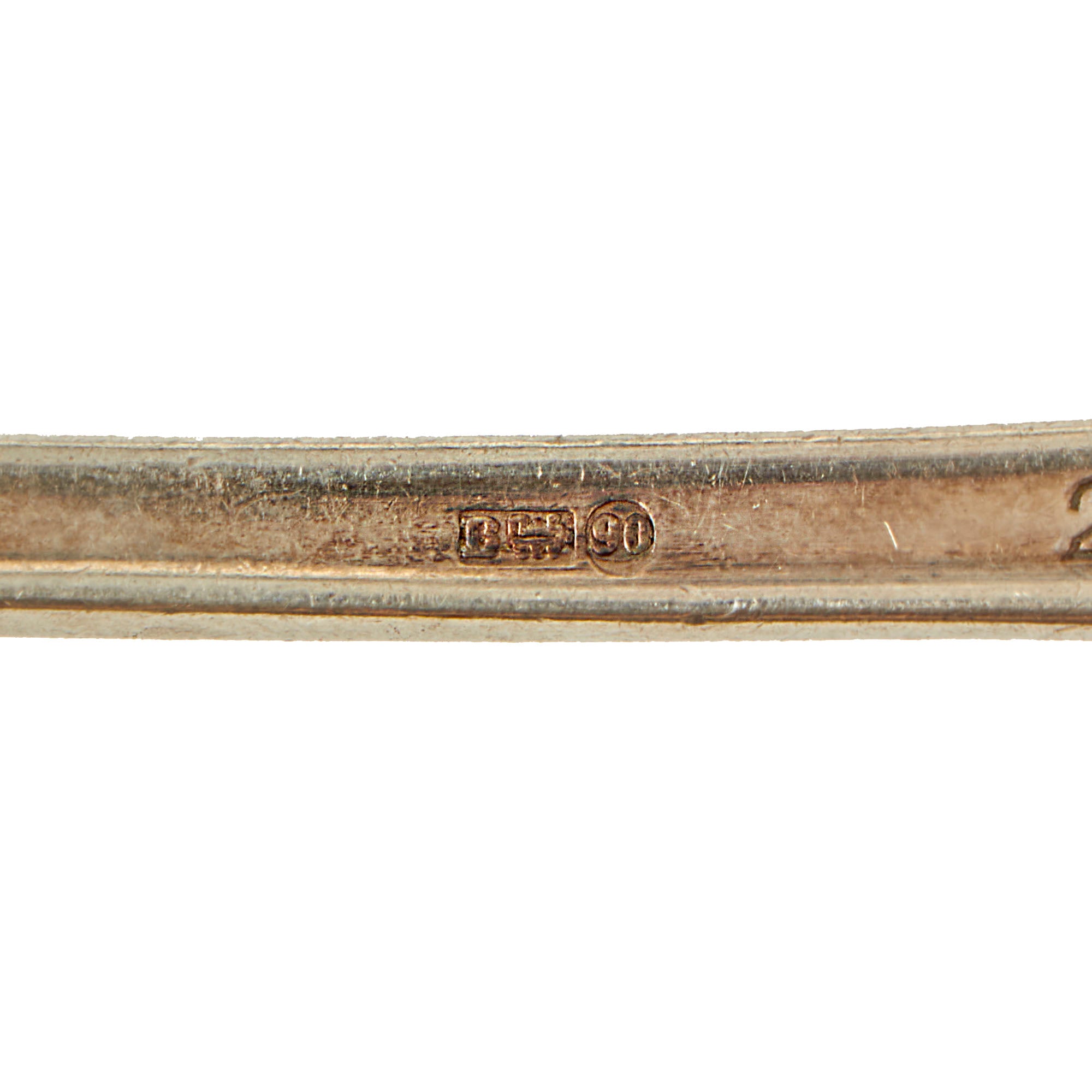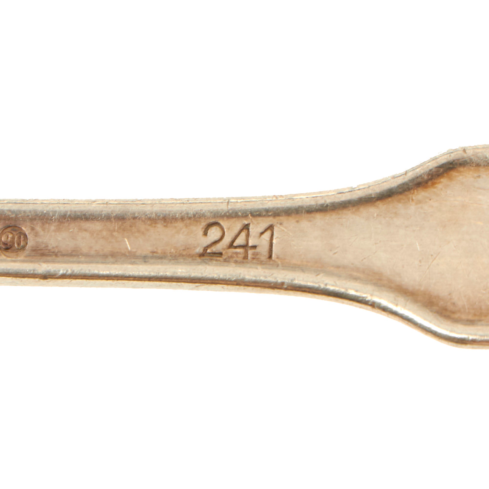 The spoon itself measures 5 3/4 inches in overall length, which is about the standard length of a teaspoon from the era. It is marked at the end of the flared handle with the Deutsches Reichsbahn insignia, a raised Reichsadler eagle insignia, flanked by the initials D R. The underside of the handle is marked with a hallmark depicting the letter B beside a locomotive, with the silver content 90. Next to this is the number 241, indicating that it was carried in the inventory of the Sonderzug (Special train) of Luftwaffe chief Hermann Goering, and was used in car 10241, the main dining car.