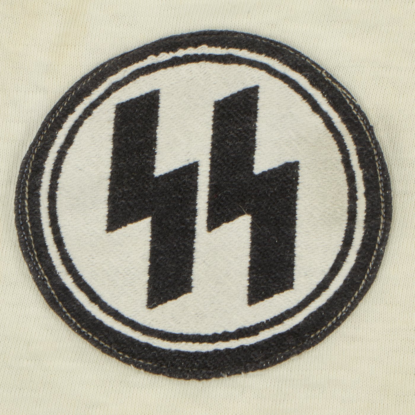 Embroidery was not easily accomplished on shirts, and it was much more economical to produce the insignia separately, and sew them on later as a completed patch. The center of the chest on this example has an ᛋᛋ doppelte Siegrune (Double Sig/Victory Rune) machine embroidered insignia sewn in place. Proper training was paramount to the SS, who were supposed to be the pinnacle of the NSDAP German armed forces.