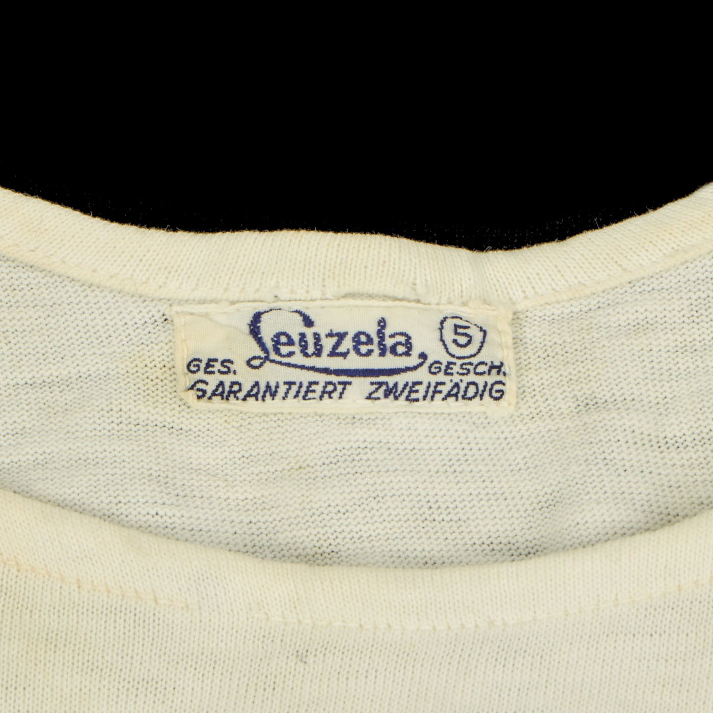 Leuzela is a known maker of German WWII era shirts such as these, and "Ges. Gesch." indicates that it is a patented design. The last line translates to "Garanteed Two Thread", referring to the construction method and quality of the shirt. The shirt measures 23" in length by 17" width, which we assume is a size "5" as marked on the tag.