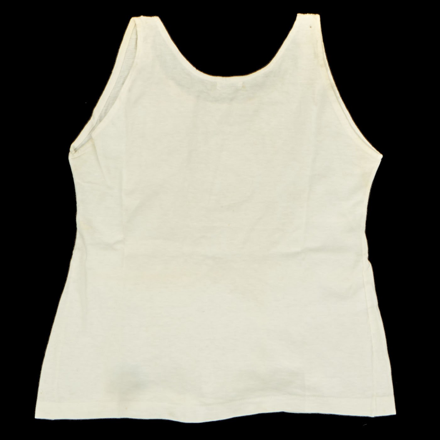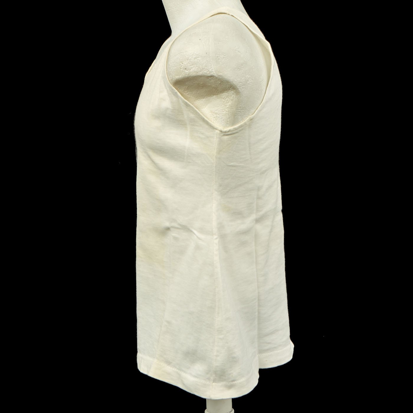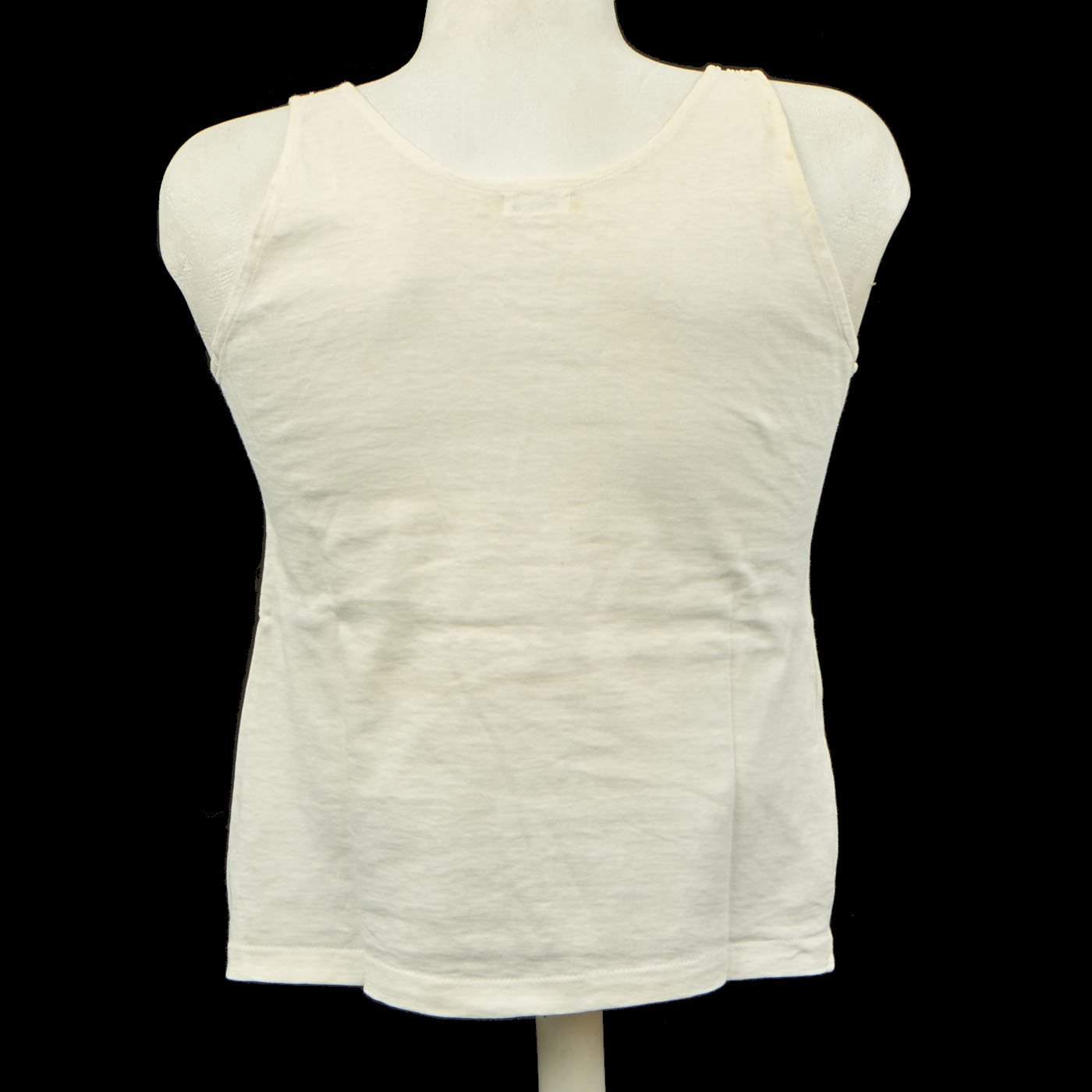 This example is in very good lightly used condition, with a bit of age toning and some small holes around the top. There are a few small stains scattered around the shirt.