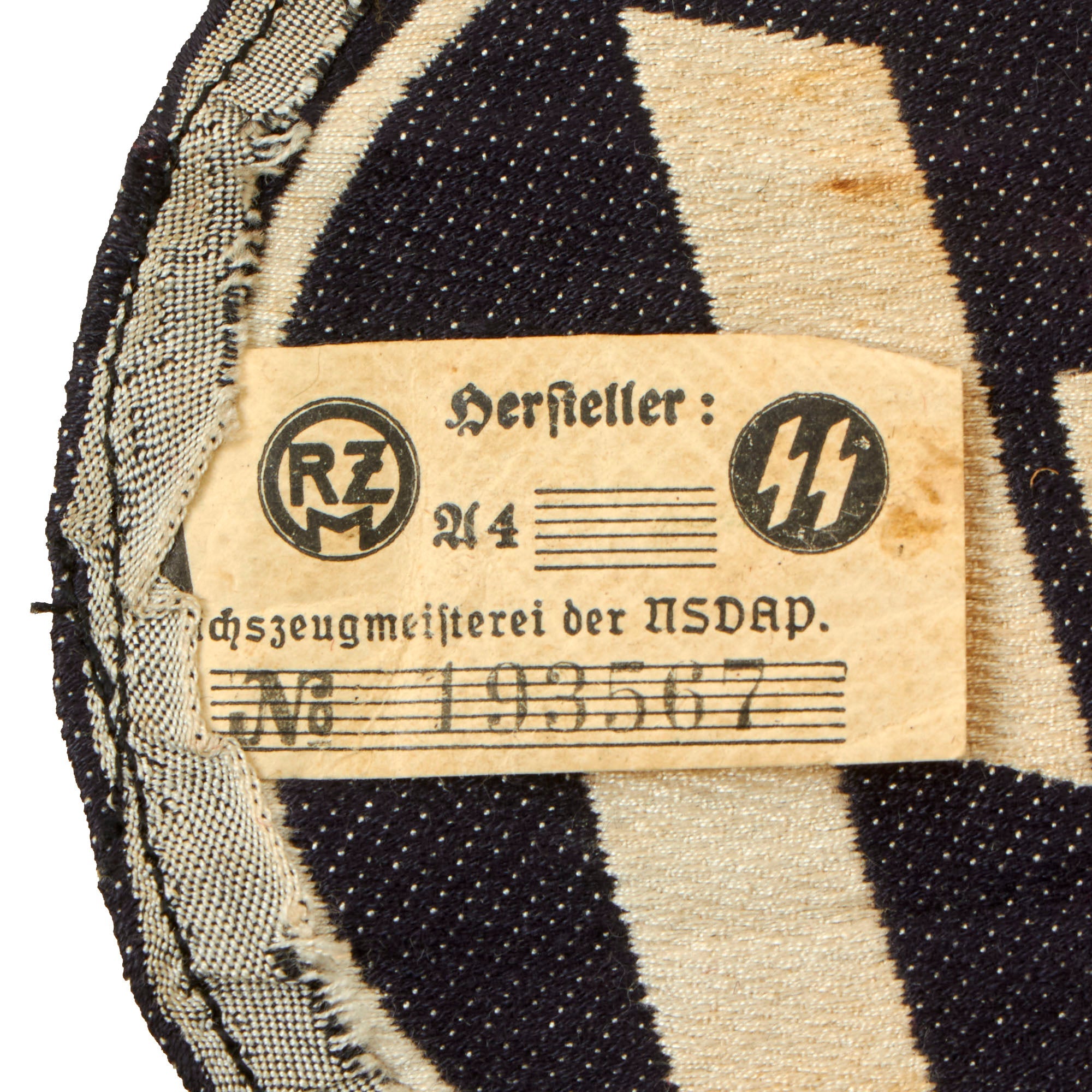 The patch still features the original RZM tag, which is a complete example! The tag features a ((RZM)) logo as well as the ((ᛋᛋ)) Doppelte Siegrune (Double Sig/Victory Rune) insignia. There is no ink stamped numerical designation of the Hersteller (manufacturer). The tag has the lot No 193567.