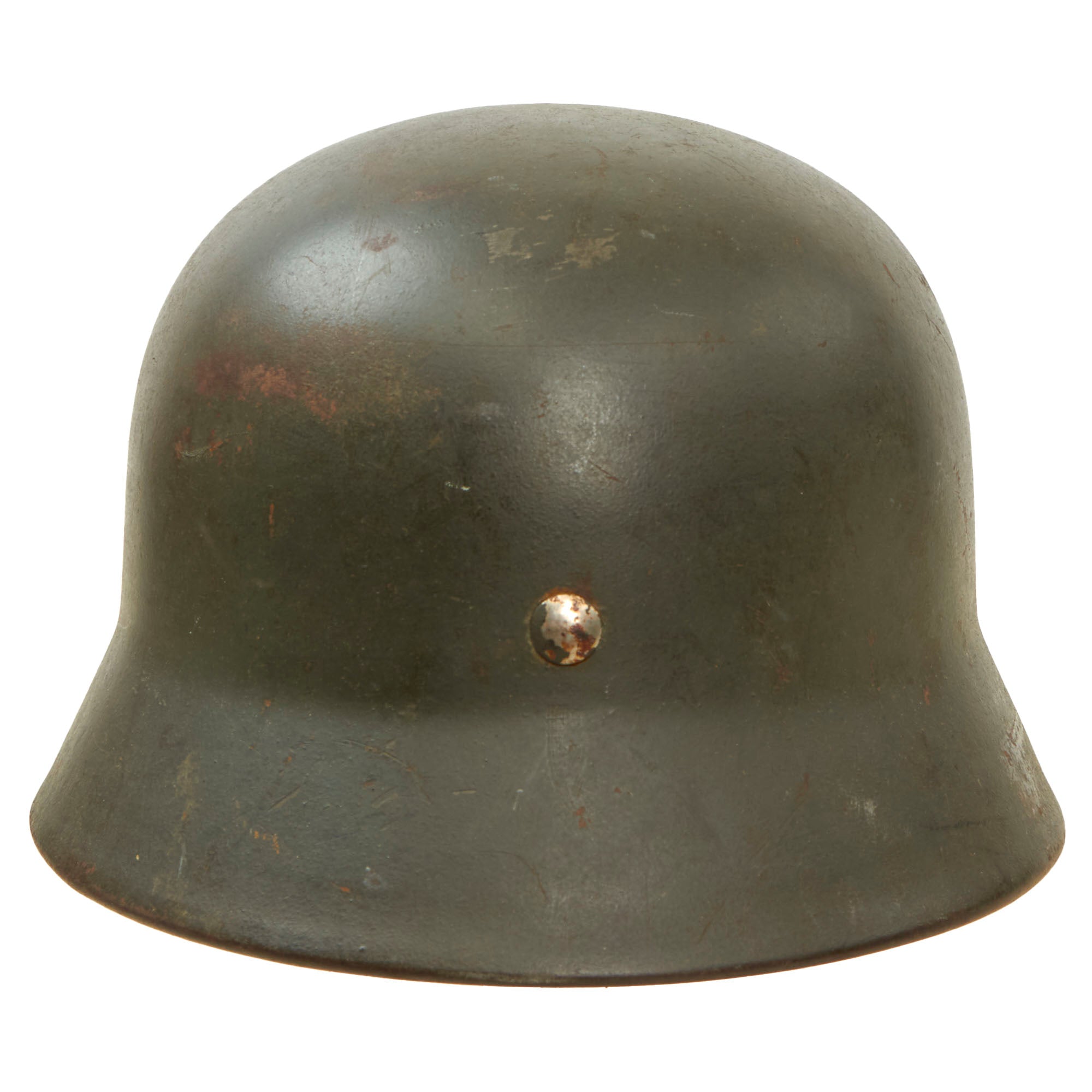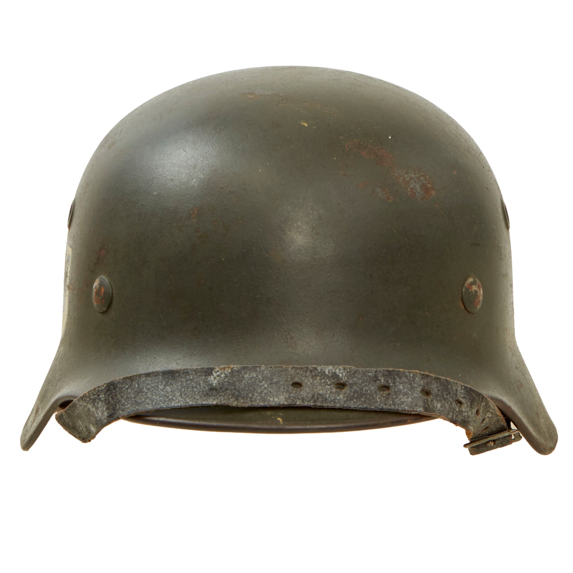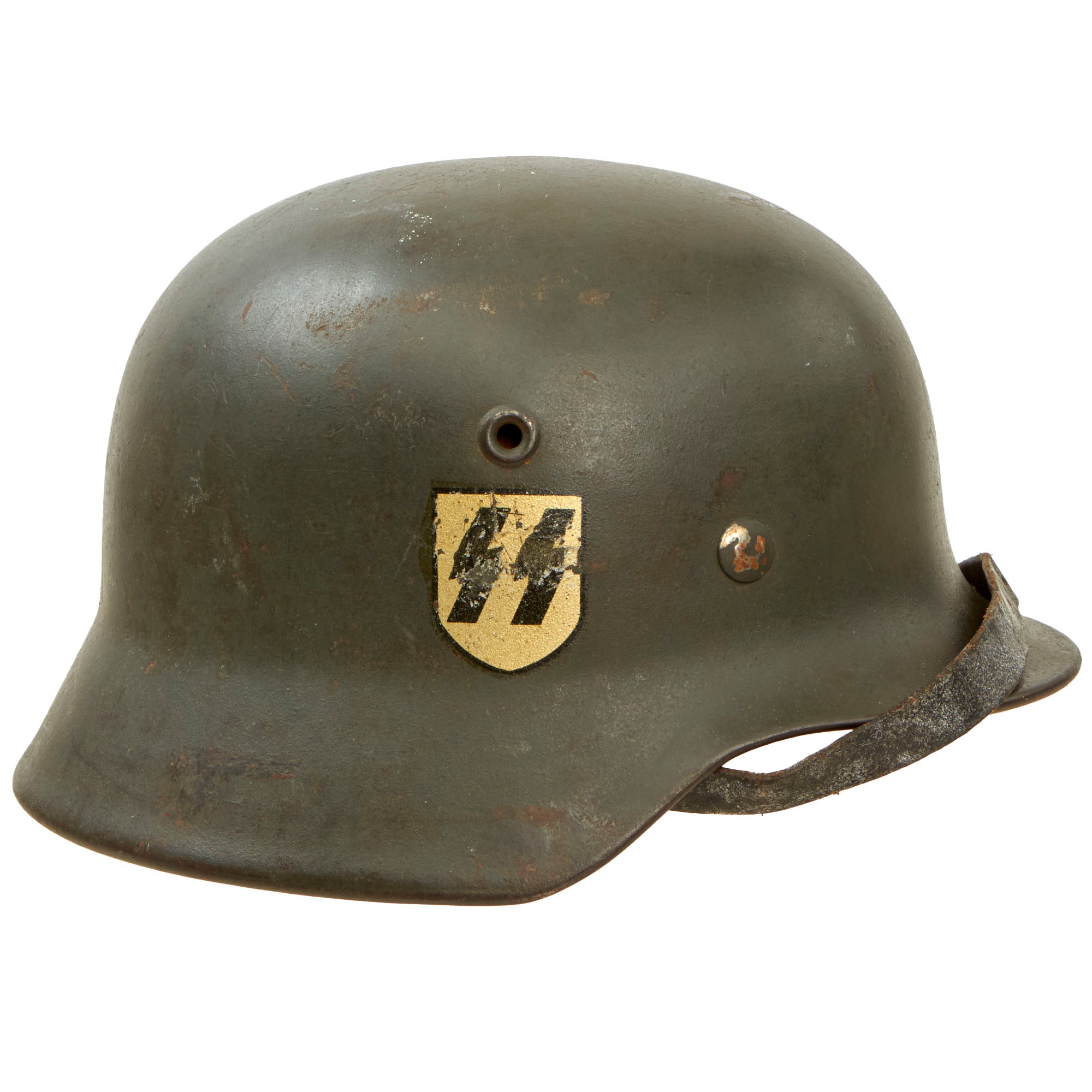 This is an incredible ultra rare all original example of a Model 1940 M42 German WWII helmet, with a single ᛋᛋ Doppelte Siegrune (Double Sig/Victory Rune) decal on the right side of the helmet. This was the symbol used by the SS throughout their existence, and many of the SS units also utilized the old Germanic Runic alphabets as a source of insignia. Earlier in the war the Waffen SS used two decals, with an NSDAP party shield on the left side, however this was dropped as the war progressed. Unlike the other armed branches, the Waffen SS had their branch insignia on the right side of the helmet.