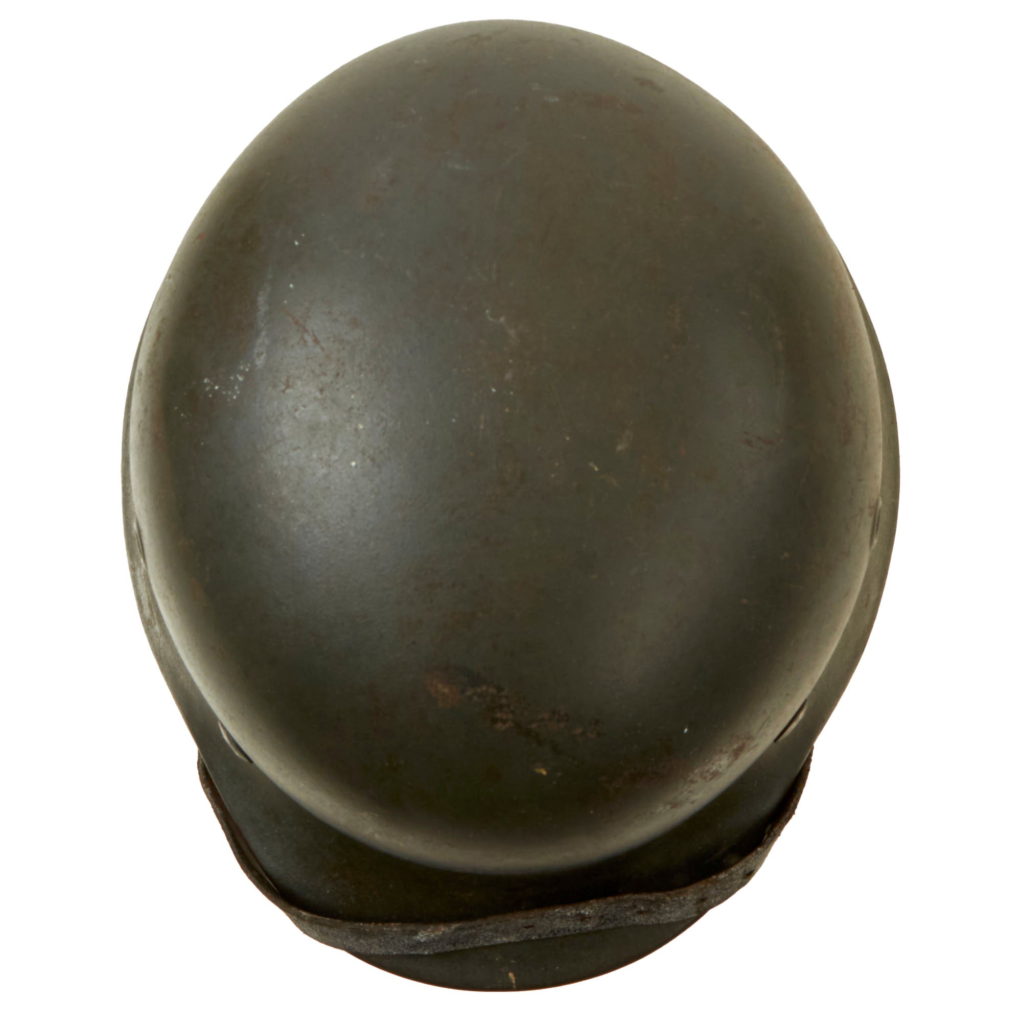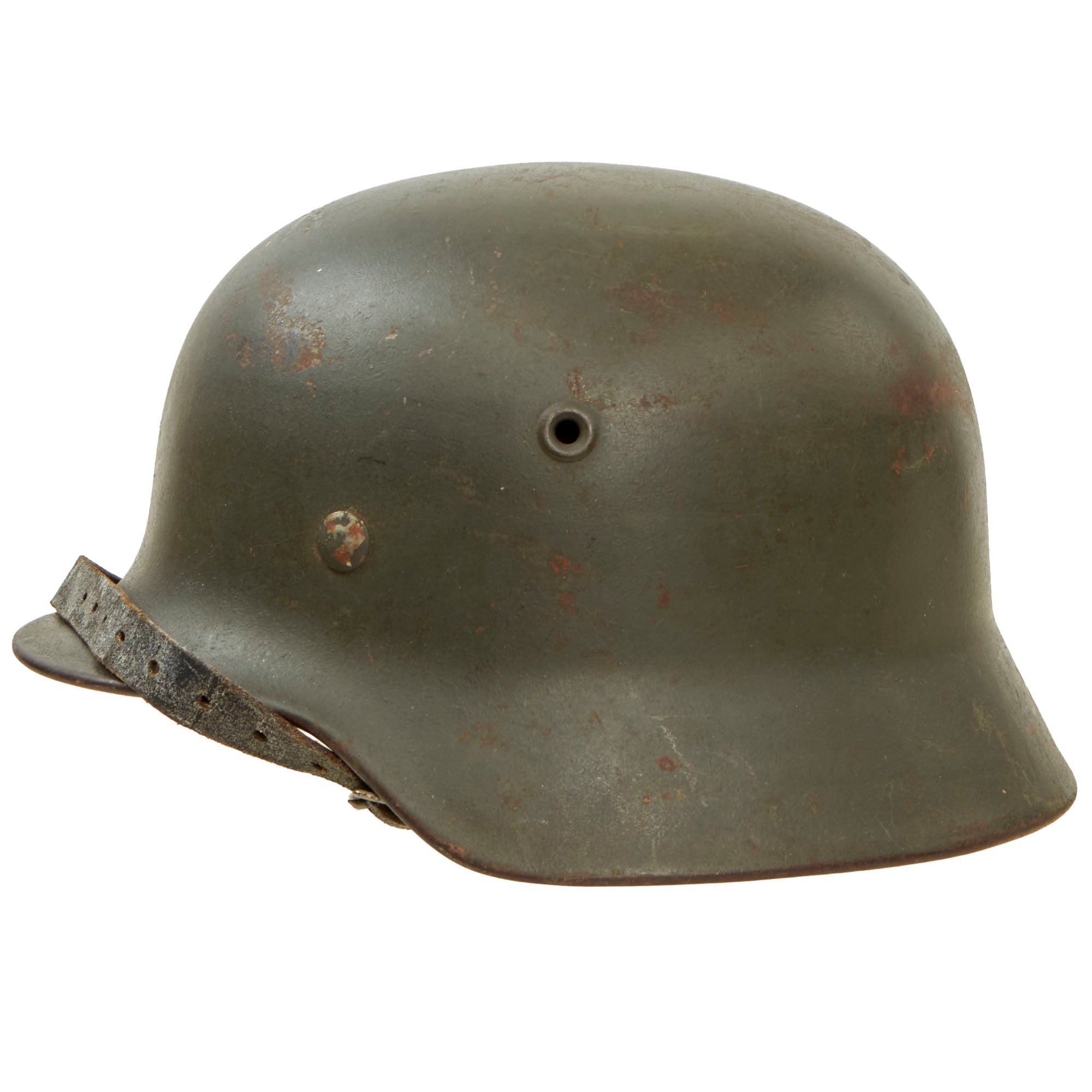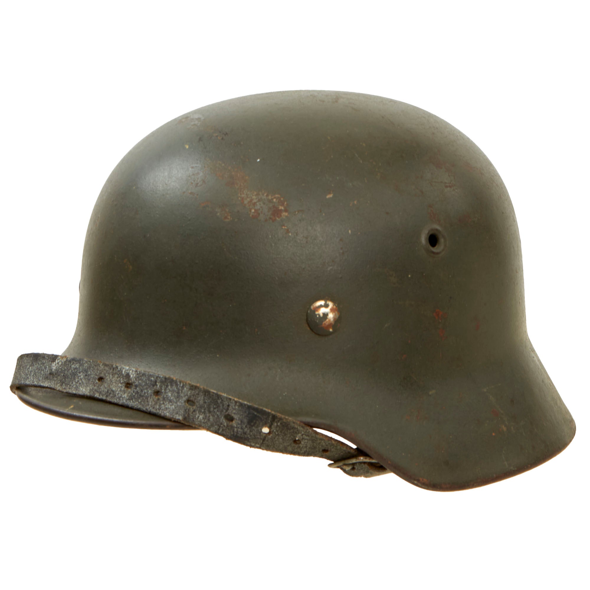 This is an incredible ultra rare all original example of a Model 1940 M42 German WWII helmet, with a single ᛋᛋ Doppelte Siegrune (Double Sig/Victory Rune) decal on the right side of the helmet. This was the symbol used by the SS throughout their existence, and many of the SS units also utilized the old Germanic Runic alphabets as a source of insignia. Earlier in the war the Waffen SS used two decals, with an NSDAP party shield on the left side, however this was dropped as the war progressed. Unlike the other armed branches, the Waffen SS had their branch insignia on the right side of the helmet.