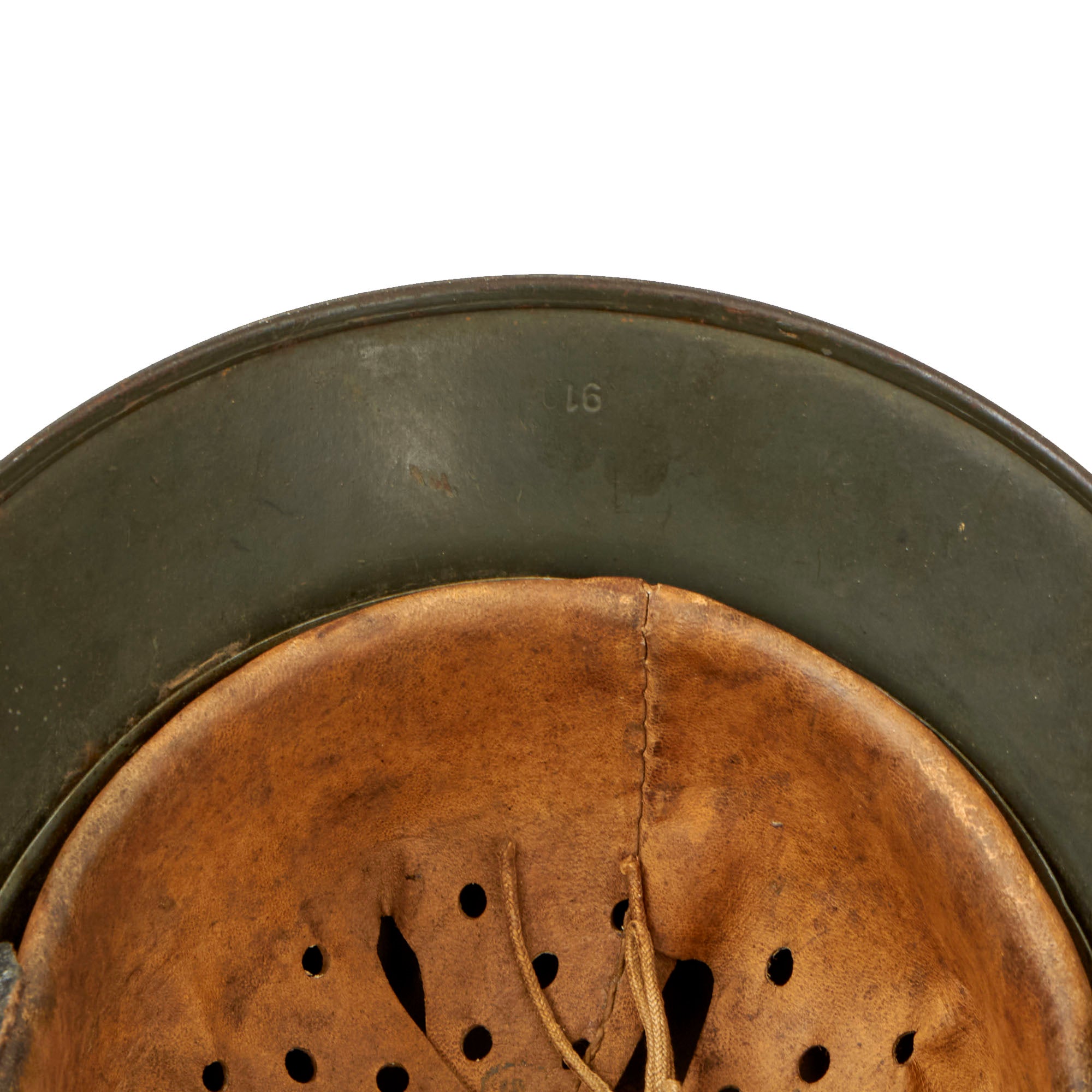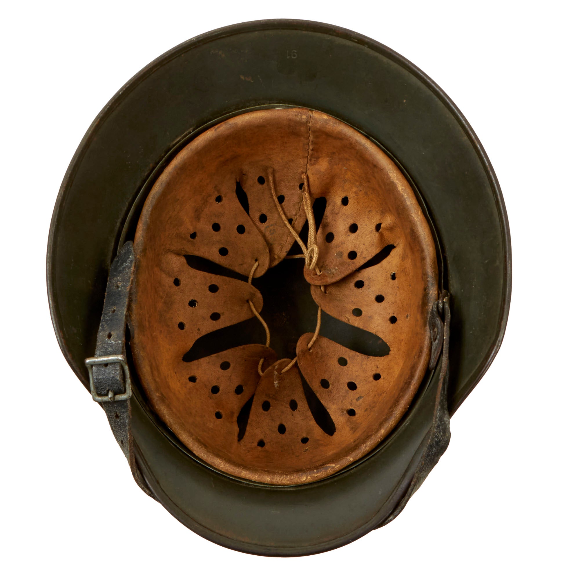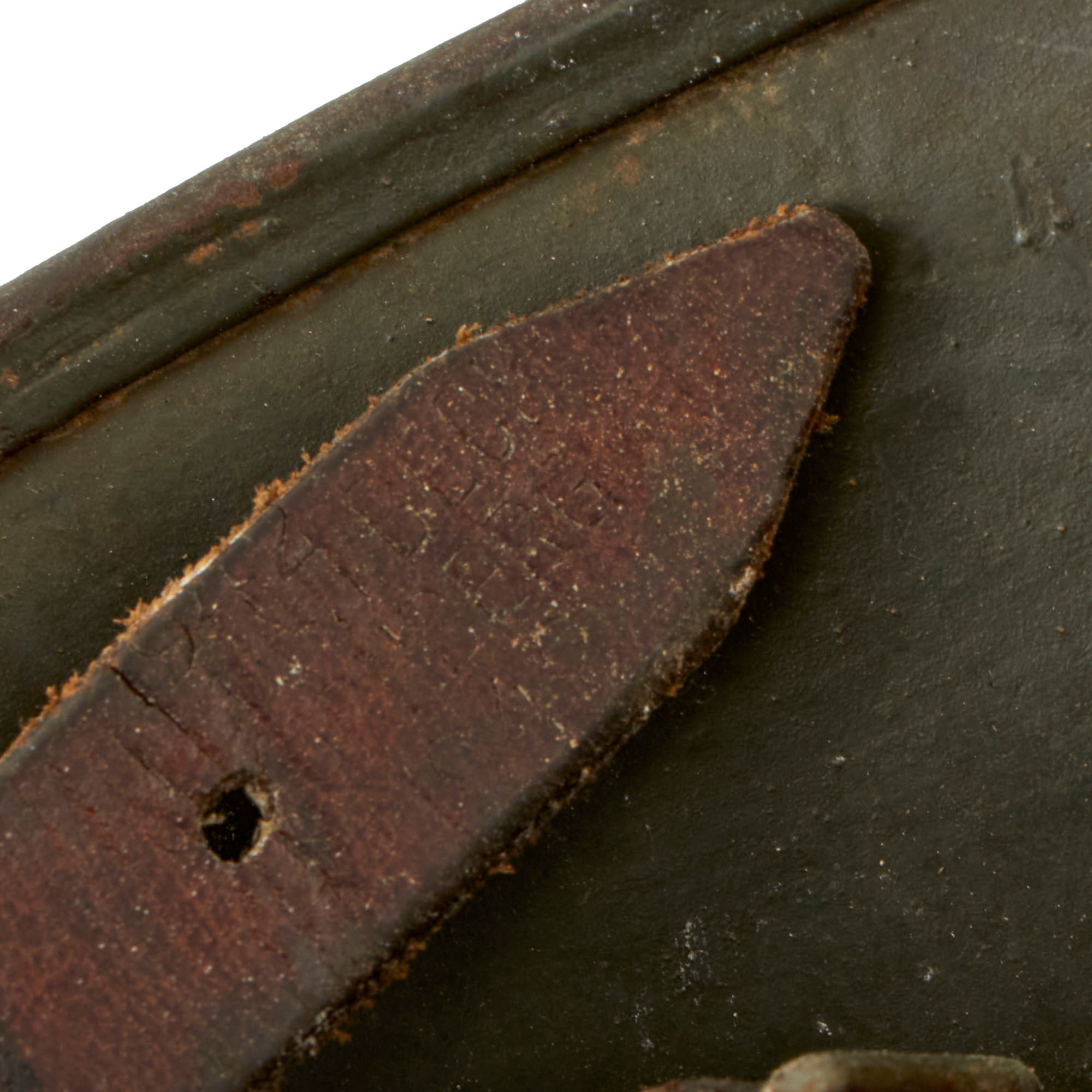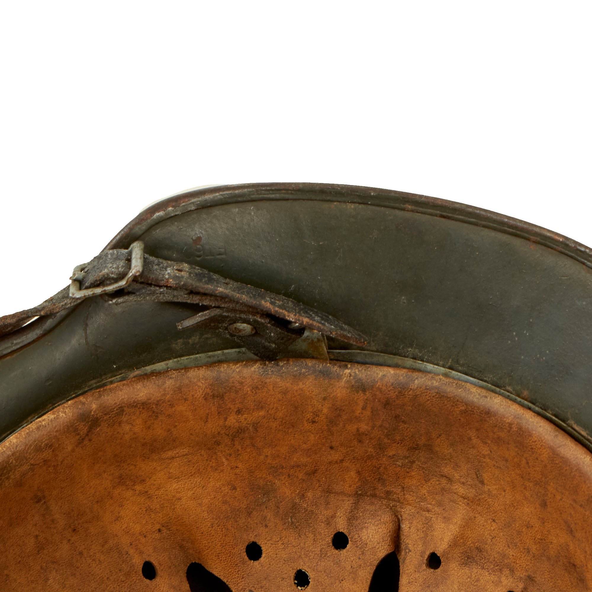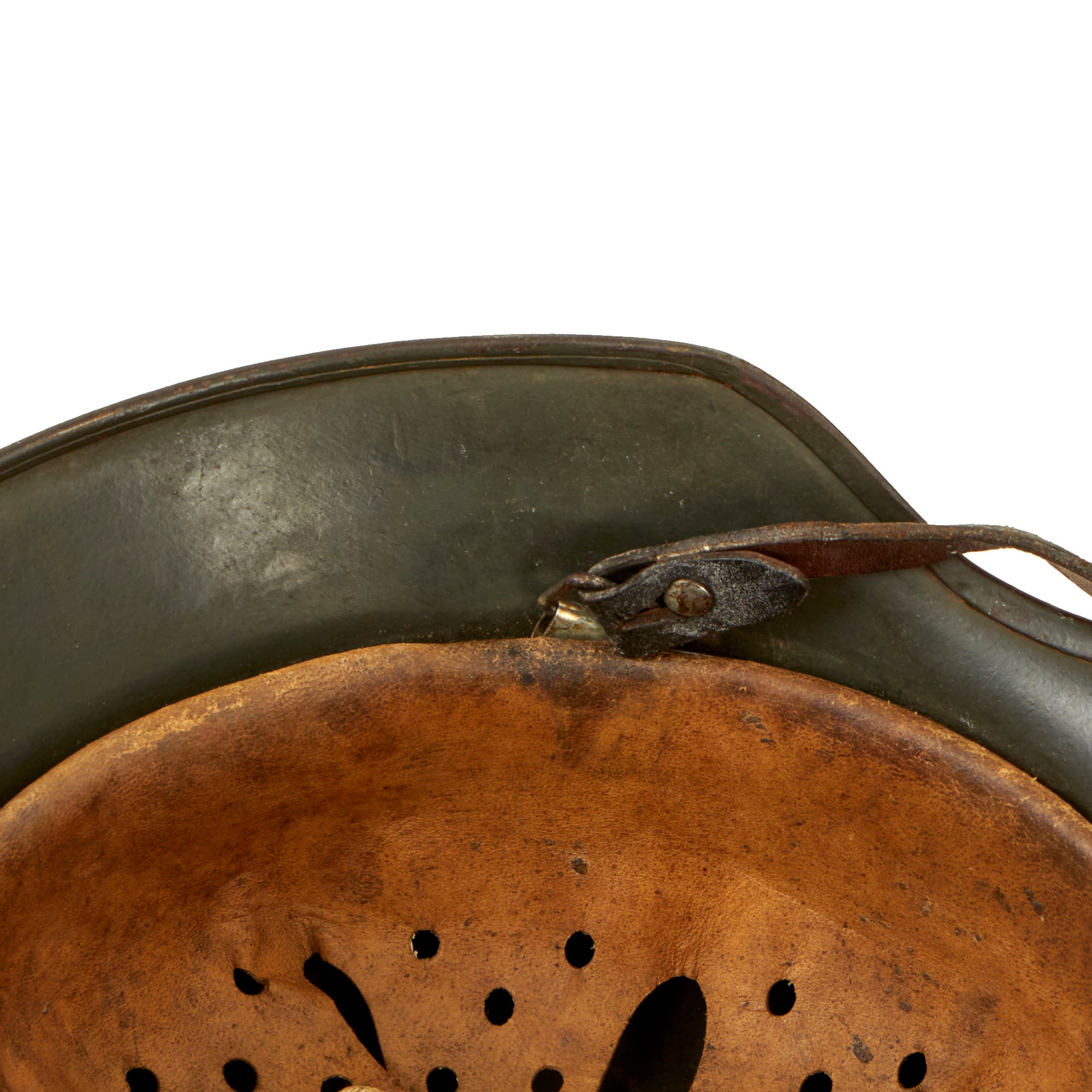 The liner is still fitted with an original leather chin strap with a steel buckle, retained by the correct galvanized steel studs. It is fully intact with the leather still relatively supple, and does not show any major damage such as tears or splits. It even has a maker on the end of the long section, which reads LEON H. BECK / NÜRNBERG / 1942.