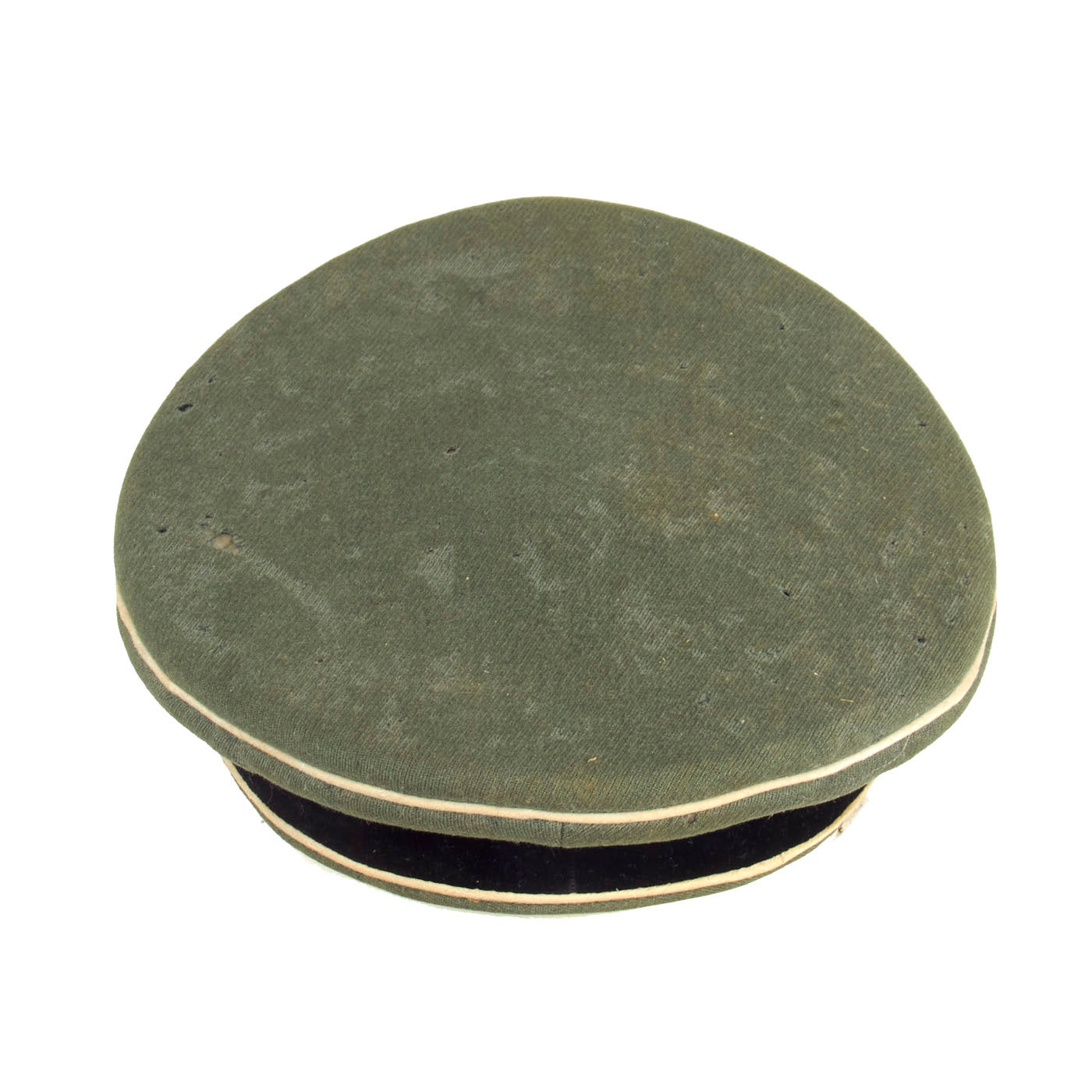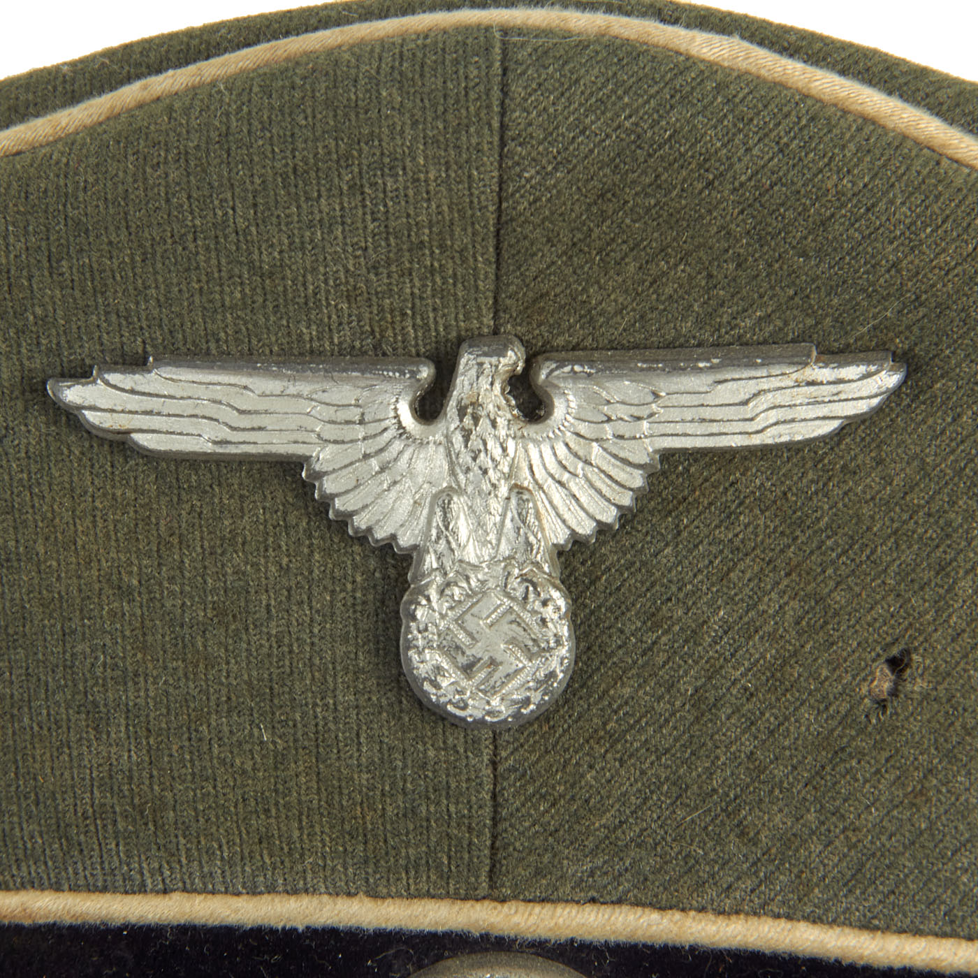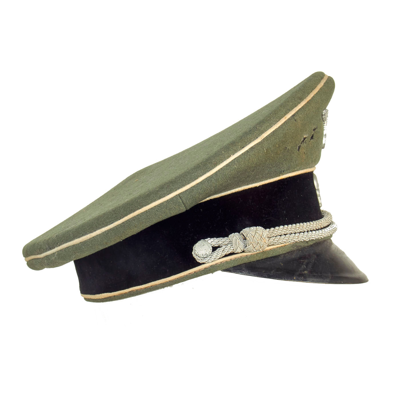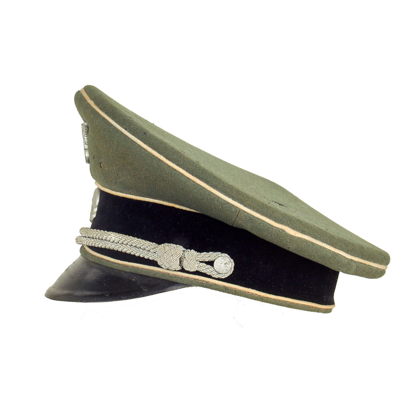 The visor cap (Schirmmütze) was an important part of the headgear worn by German uniformed military, civil, paramilitary and political organizations during the Third Reich. This was the standard cloth headgear worn as a part of the service uniform. Visor caps were worn outdoors as well as indoors, and were often required to be worn by all personnel on duty. Visor caps were made in versions specific to each organization and were often further differentiated through the use of insignia, colored piping, or style of chin cord, to indicate rank, role or branch. The insignia used on these caps ranged from simple stamped metal emblems, to elaborate hand embroidery. Visor caps were issued to enlisted soldiers and NCOs in the military and in some other organizations. Officers had to purchase their own hats, and lower ranks could choose to purchase caps that were of a higher quality than the rather basic, issue examples. The private purchase caps were generally made in very high quality, with fine materials. A wide variety of fabrics were used, from Trikot and doeskin, to heavy wool, or even lightweight white fabric for summer wear. In the military, issue of these caps was generally suspended shortly after the outbreak of the war, but they continued to be worn by some troops until the end of the war.