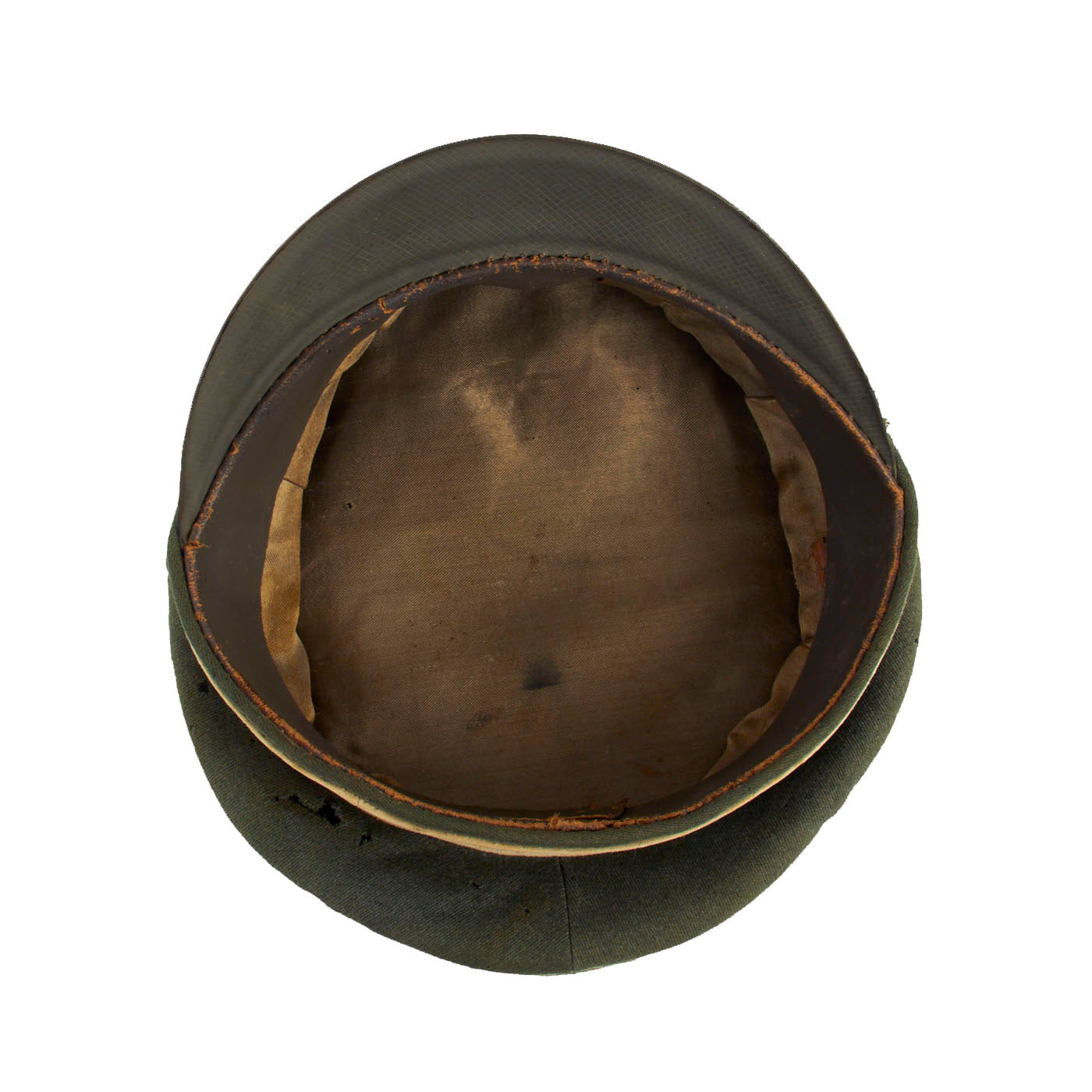 This is an very good condition extremely rare German Waffen SS Officer's Schirmmütze (Visor Cap), with the original shape fully retained! It still has the original front and crown stiffener installed, so the top has not slumped down on the rear and sides. The cap shows high quality fabrication, made with typical army type feldgrau (Field Gray) green / gray "whipcord" weave wool with a black felt band and a traditional high front. The Weiß (white) wool triple piping is still in great shape, and does not have much "age toning" at all, still showing a vibrant color. As with the Heer, this is the SS Waffenfarbe (Corps Color) for Infantry, Motorized infantry, and Panzergrenadier troops.