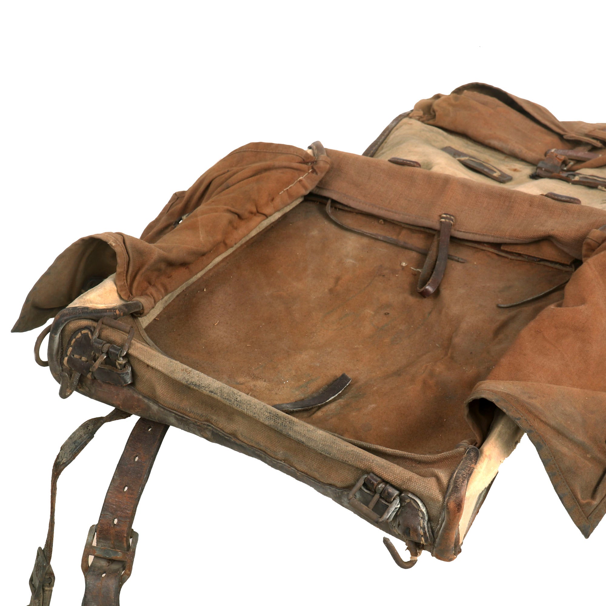 Original Item: Only One Available. Here is something that we have not had before! This is a lovely "salty" service worn example of the very rare Imperial German WWI rucksack was known as the Tornister (Knapsack) Model 07/13. Based on the original M85/86 version, the 07/13 was simplified to make it lighter. These packs were Issued to every infantryman for carrying personal kit and rations. Throughout the war many variations were produced in Brown and Grey canvas, with and without Pony fur, and so forth.