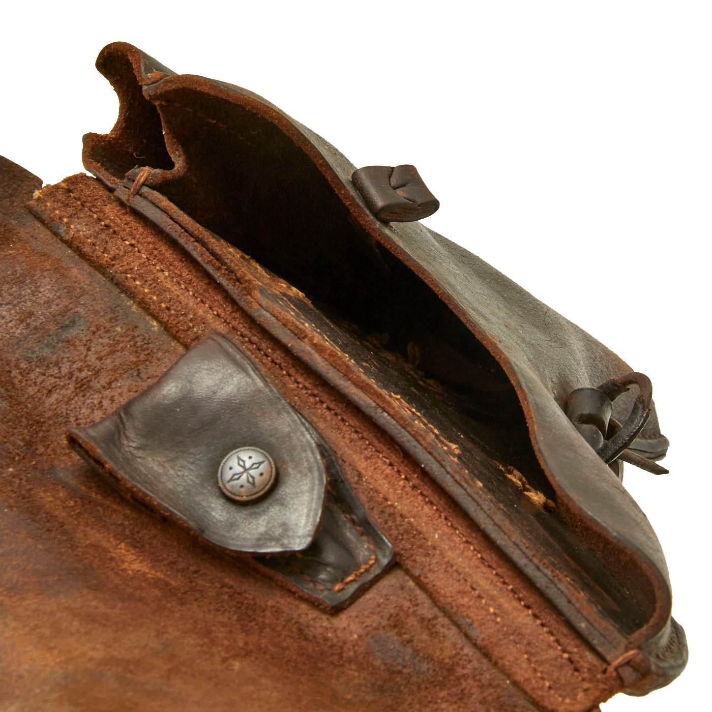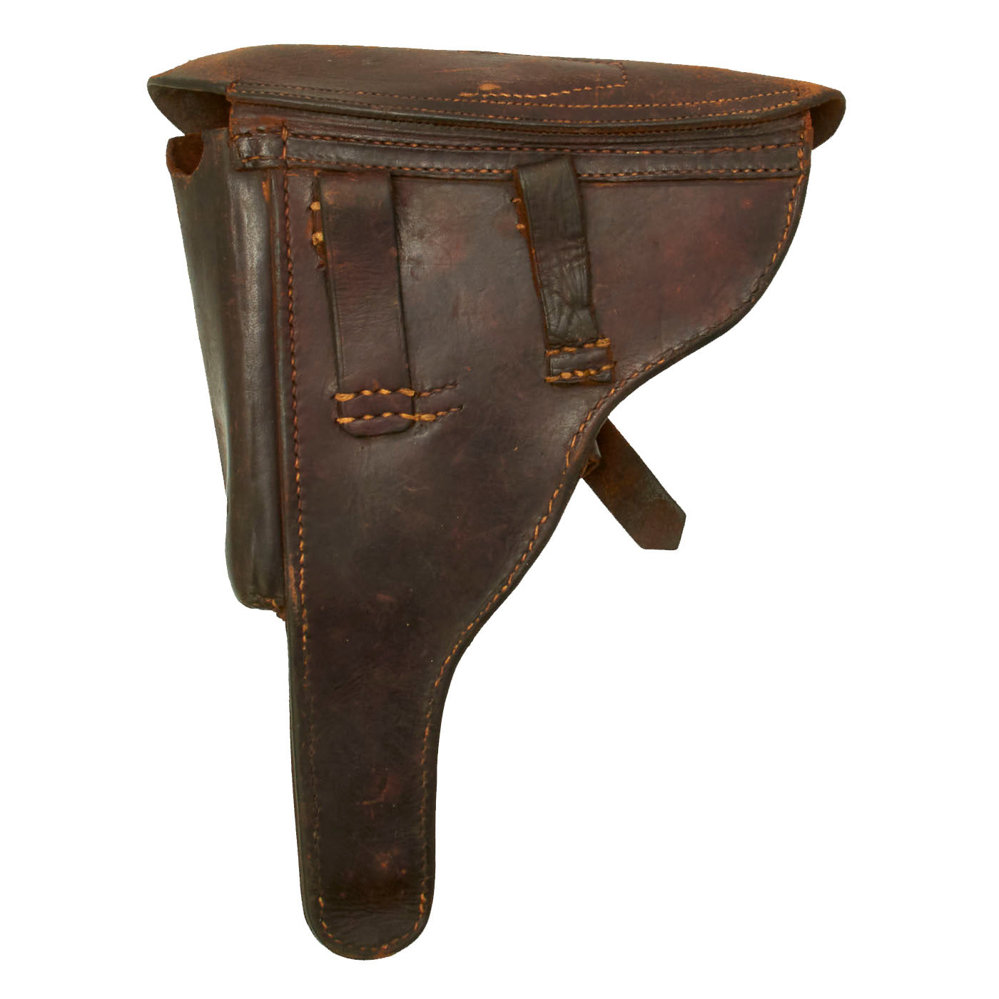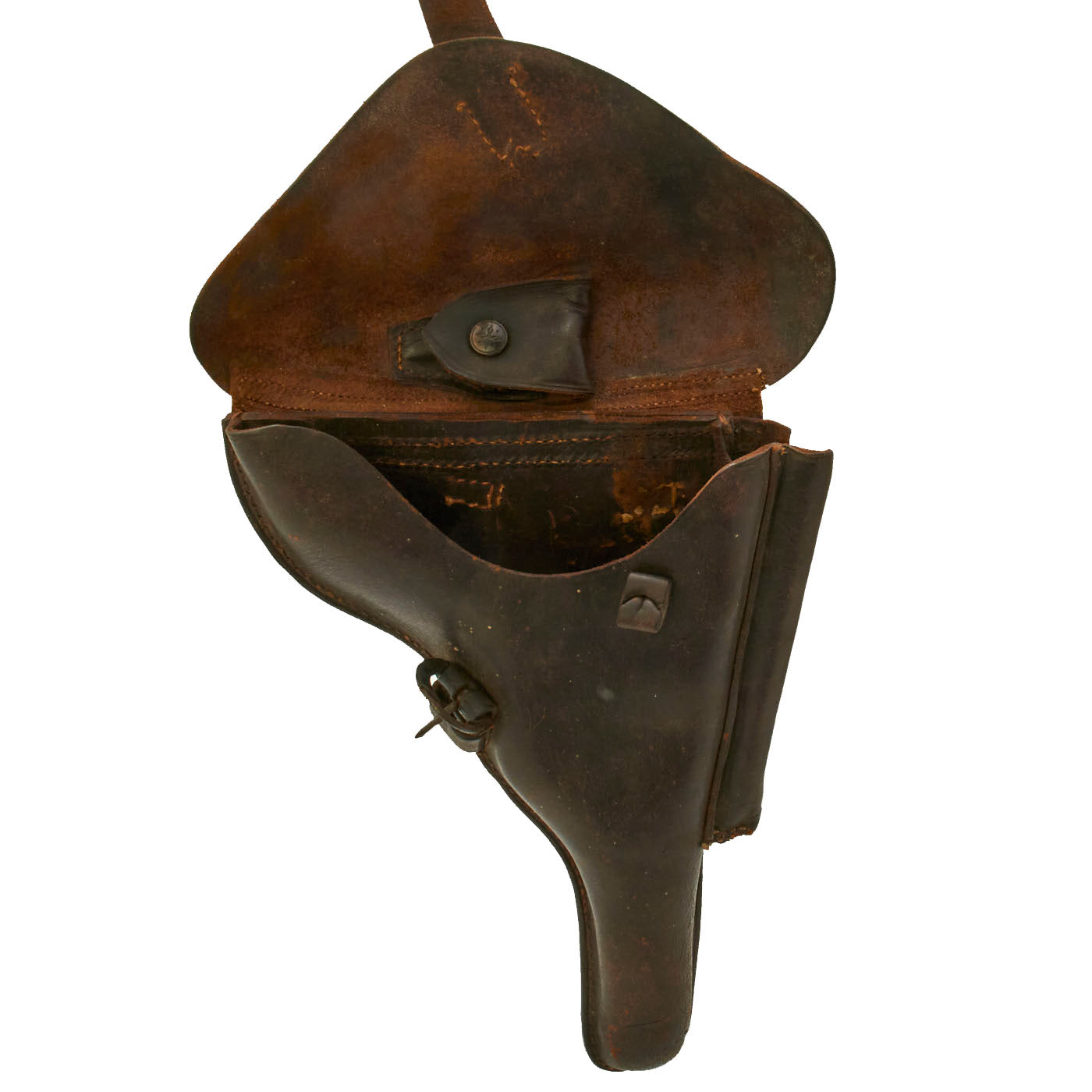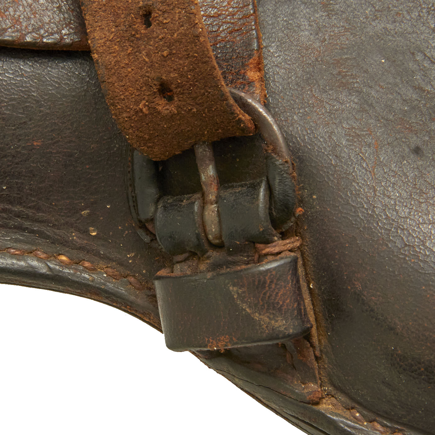 The stitching is tight and serviceable. Leather is supple and pliable. Leather covered buckle is missing some of the original leather covering. Internal Loading tool compartment features a German cross pattern snap, which is still functional. The original leather lifting strap is still intact as well. There are no maker's marks on this holster. Offered in “as found” condition. One could increase the appearance of this holster with a little bit of work if one desired. However, we will leave that determination to the next owner.