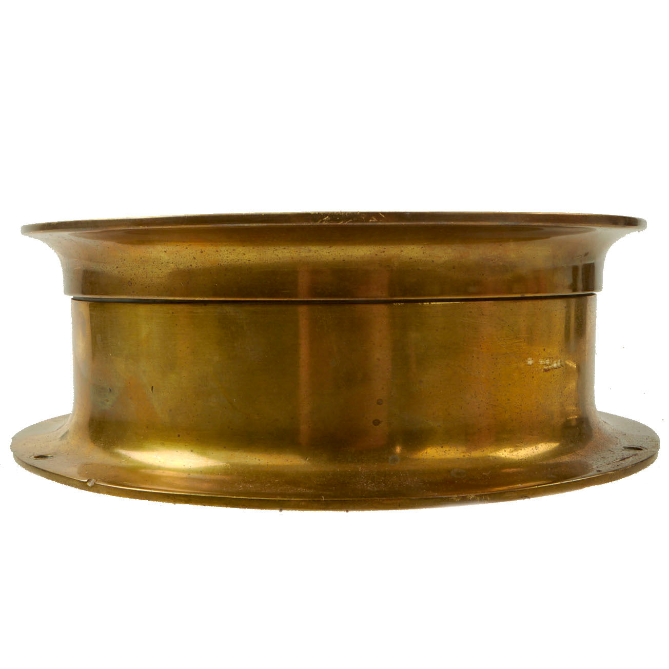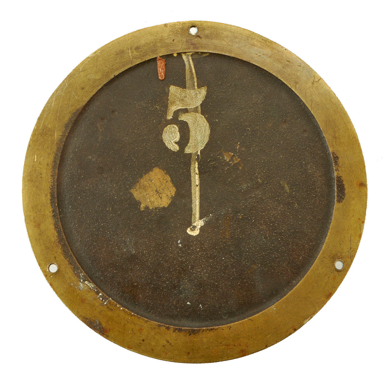 These types of ship clocks were the common clock that was typically mounted on a bulkhead on a ship’s bridge, quarter deck, or in a wardroom. It has a 6 inch black over brass dial with a 5 1/2” viewing area, and heavy forged bronze case of Pre-World War Two vintage which is the standard deck clock case of that era. The case measures 7 3/4" in diameter, with a height of 2 5/8". The spade hands hands are gun metal black with iridescent green points. The sweep second hand is the same. A lever type fast/slow regulator is at the 9 O’clock position.