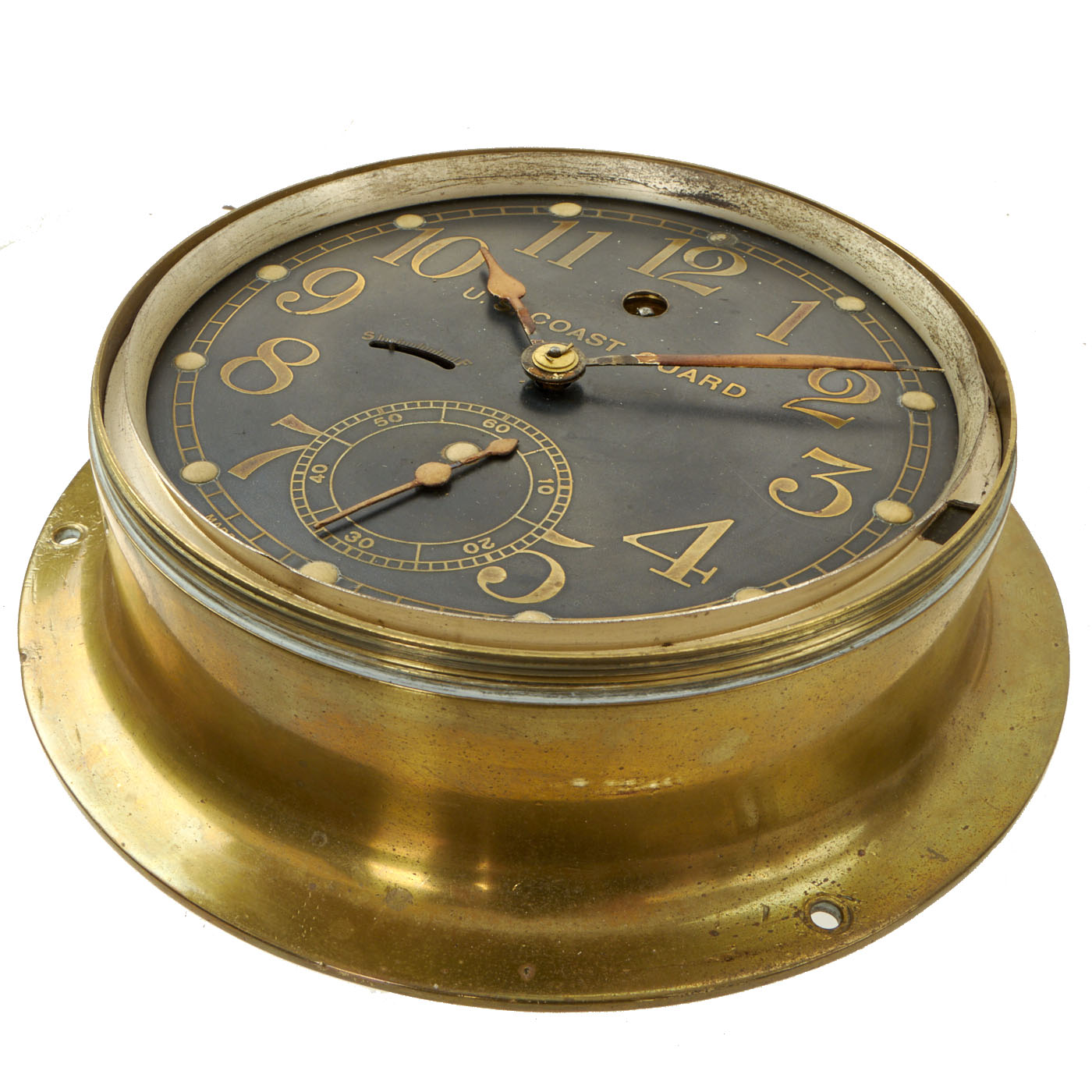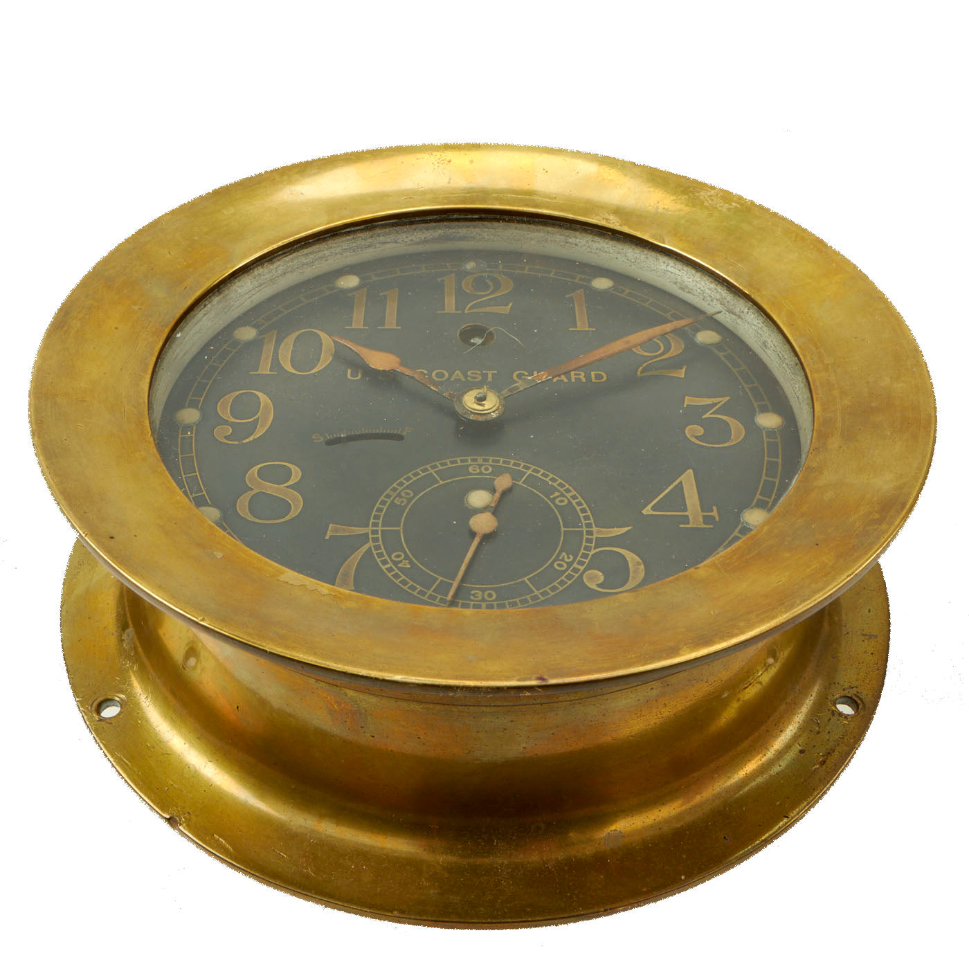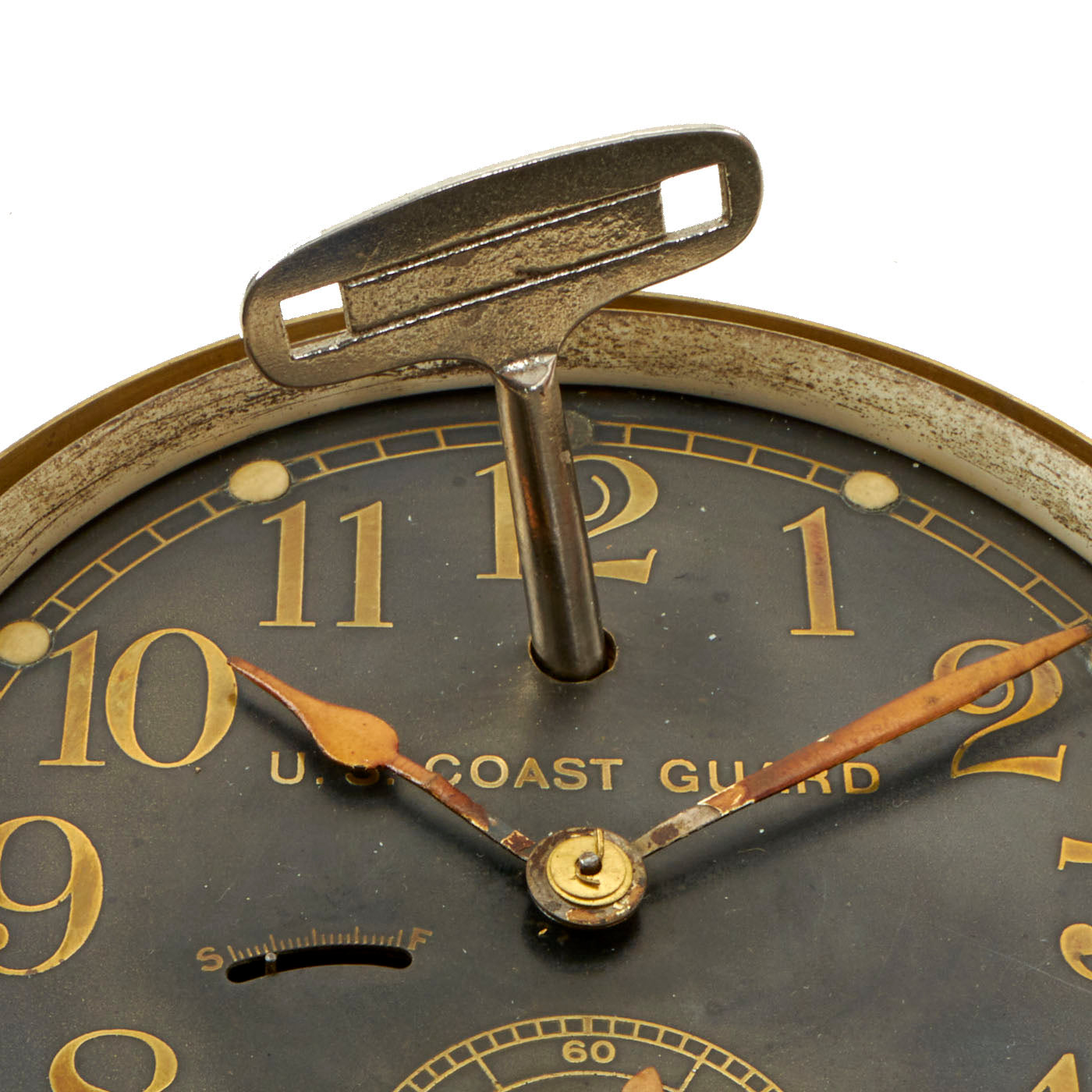 Nicely marked “Made by Seth Thomas in U.S.A.”, is silk screened below the “6“ o’clock position. “U.S. Coast Guard” is above the center arbor. There are no numbers or marks on the back of the case. Comes with the original winding key.