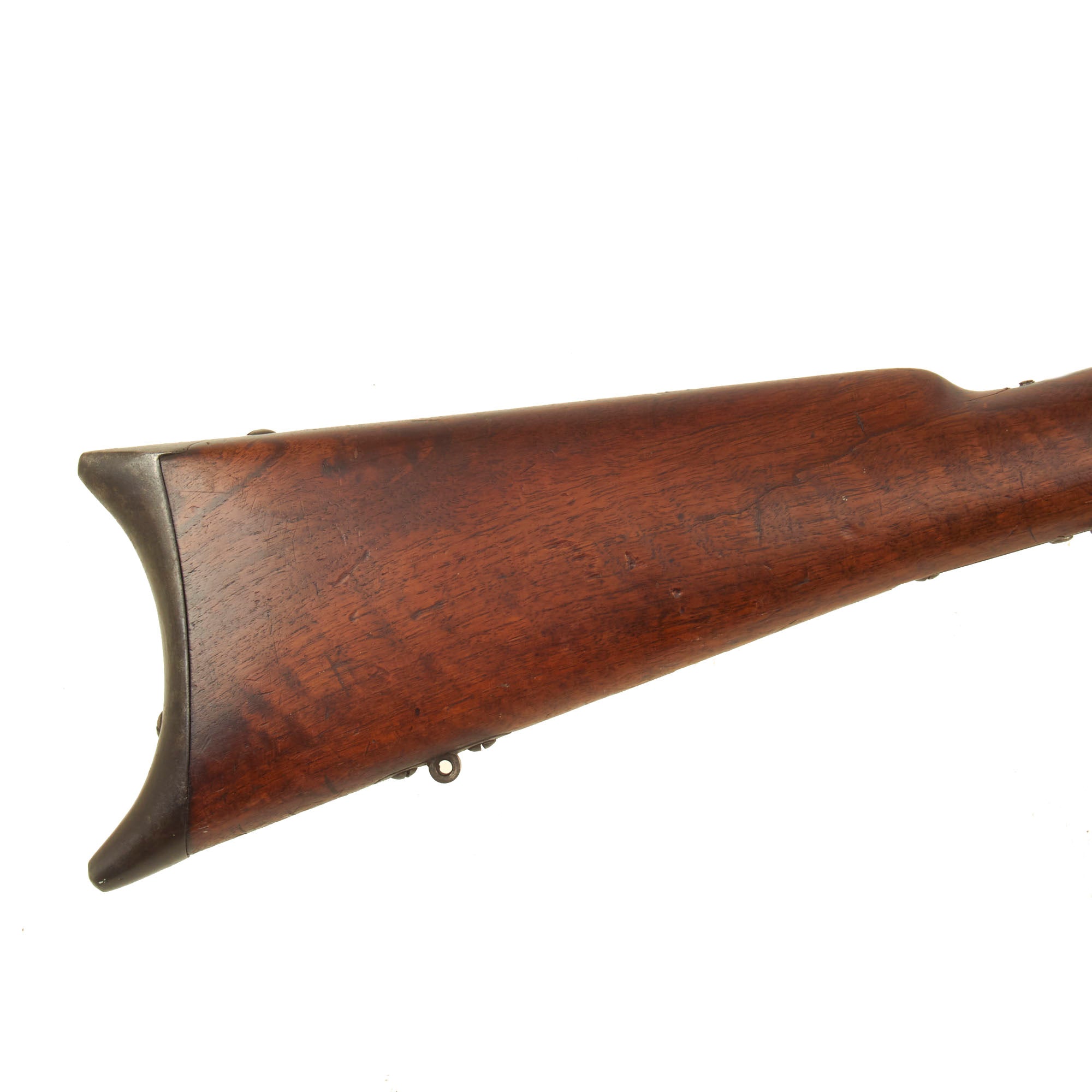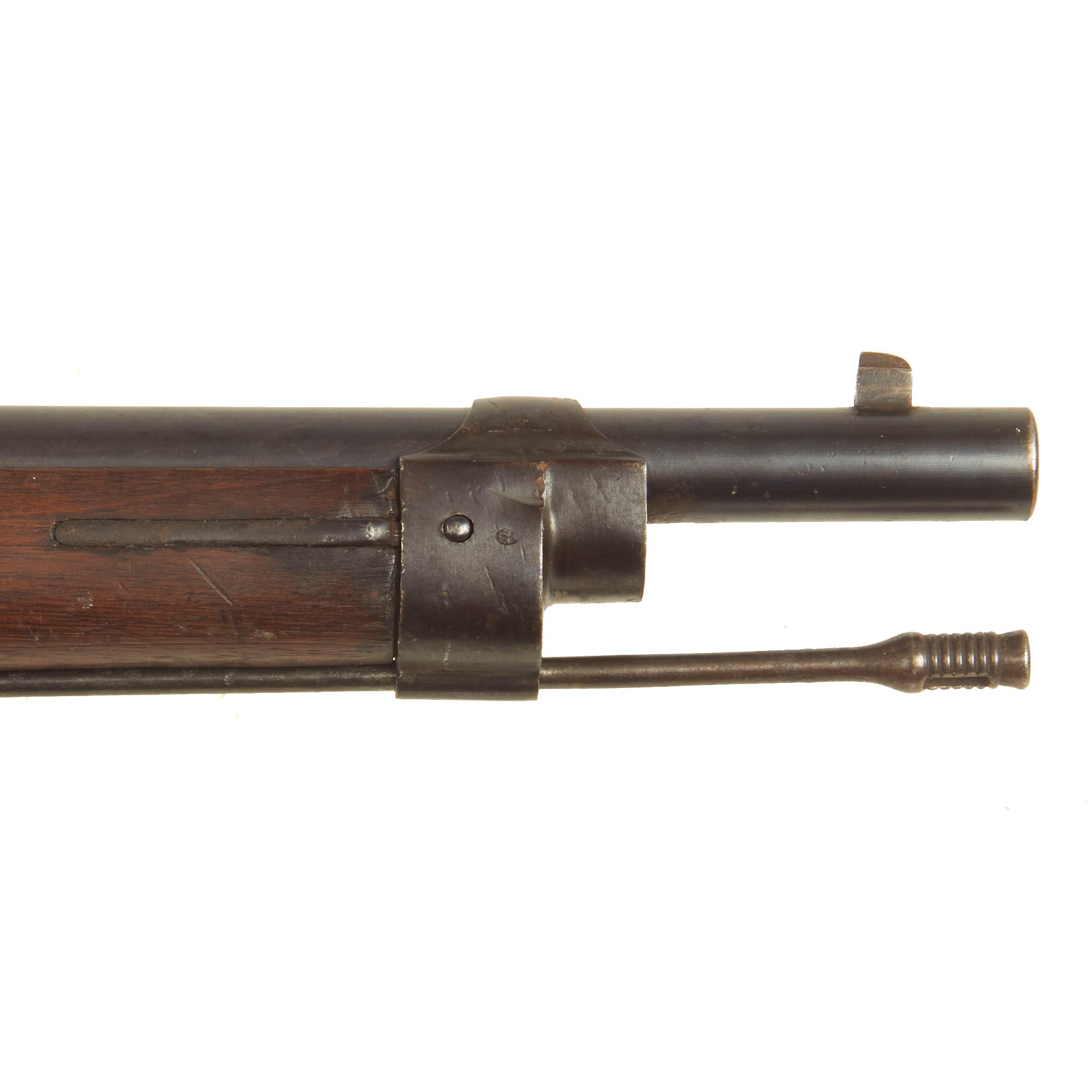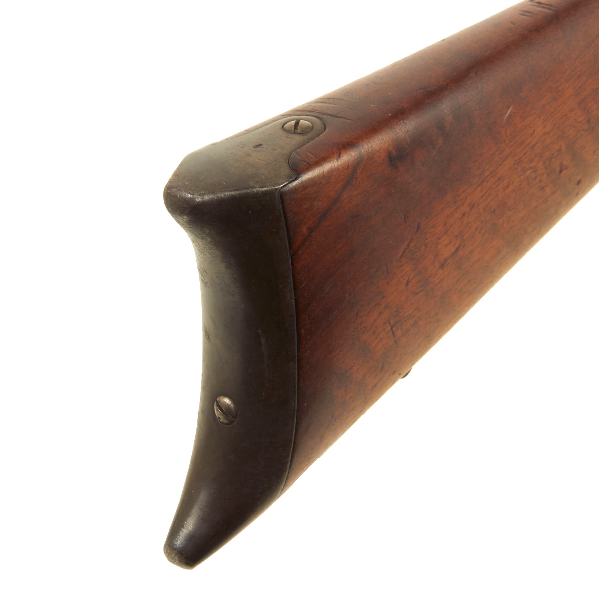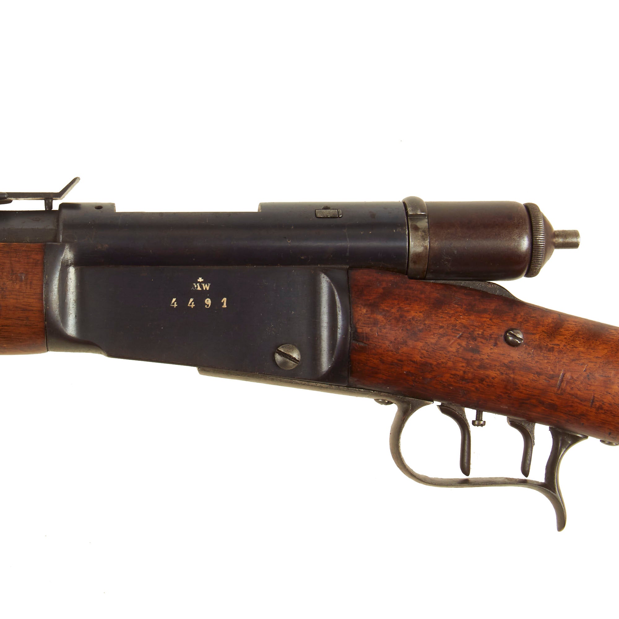 Offered in very good condition, this was a rifle serving at the time of Britain's legendary Martini-Henry Single Shot Rifle, also introduced in 1871 and not replaced with a magazine rifle until 1888. The wood stocks are in very good condition, showing the expected wear from service and age. The butt stock has some lovely curl to the grain, however it also does have a crack on the top running back from the receiver tang on the right side. There are still Swiss proof marks stamped in various places. The rear sight works correctly, however both sling swivels have been removed.