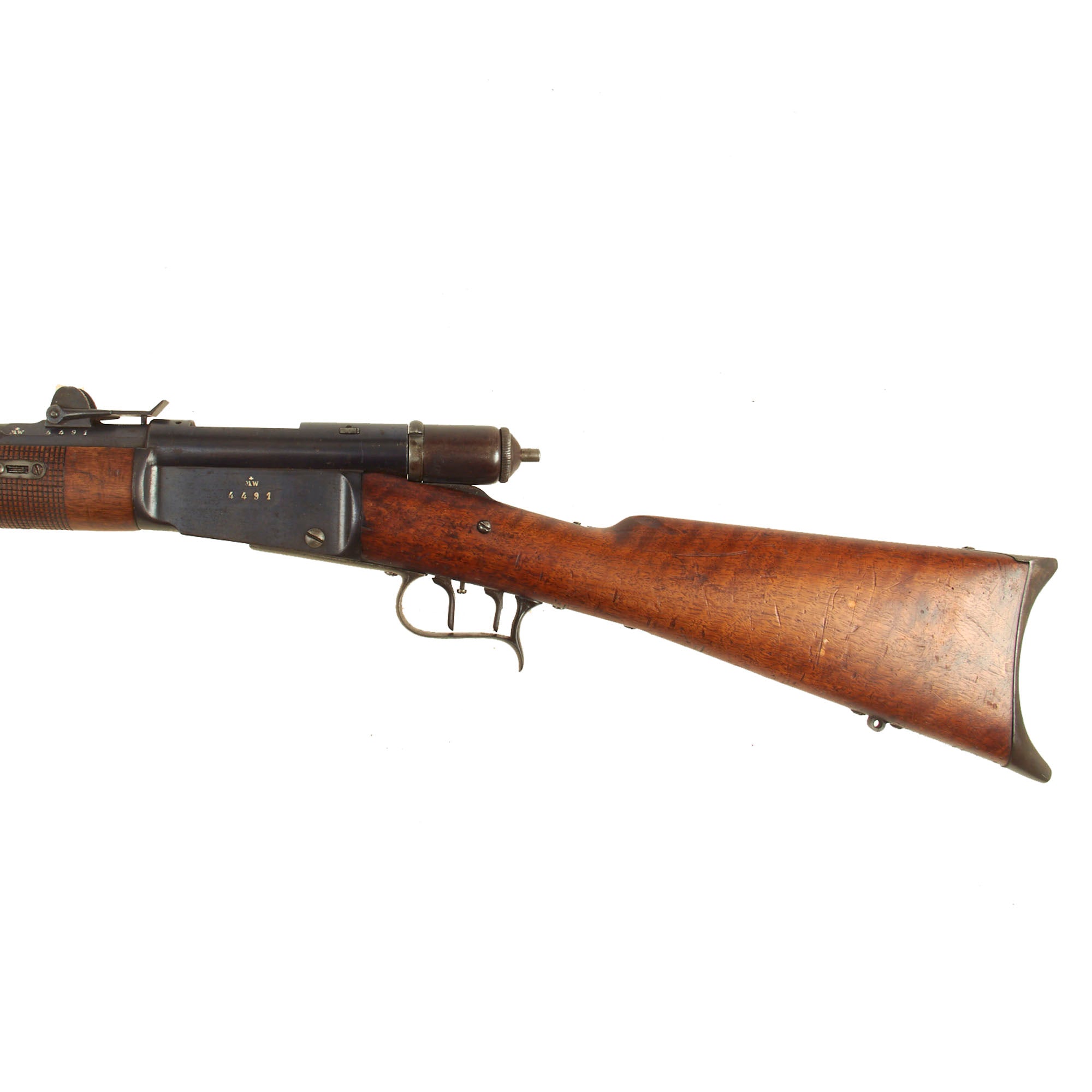 Original Item: Only One Available. Introduced in 1867, the Swiss version of the Vetterli rifle system utilized the "Winchester" tube magazine system for cartridge storage under the barrel. The original 1867 model had an external hammer, like a Winchester, but in 1868 this was changed to an internal cocking bolt spring. The cleaning rod was moved to the side of the rifle, but this proved problematic, so the model of 1869 moved it back to the under barrel position. In 1871, the loading gate cover on the right side of the receiver and the magazine cutoff on the left side were deemed to be redundant, so a new model 1871 was introduced without them. It also featured strengthened barrel rings and a much thicker and sturdier rear sight leaf. Later models after this changed over to the box Magazine found on most rifles of the WWI era.