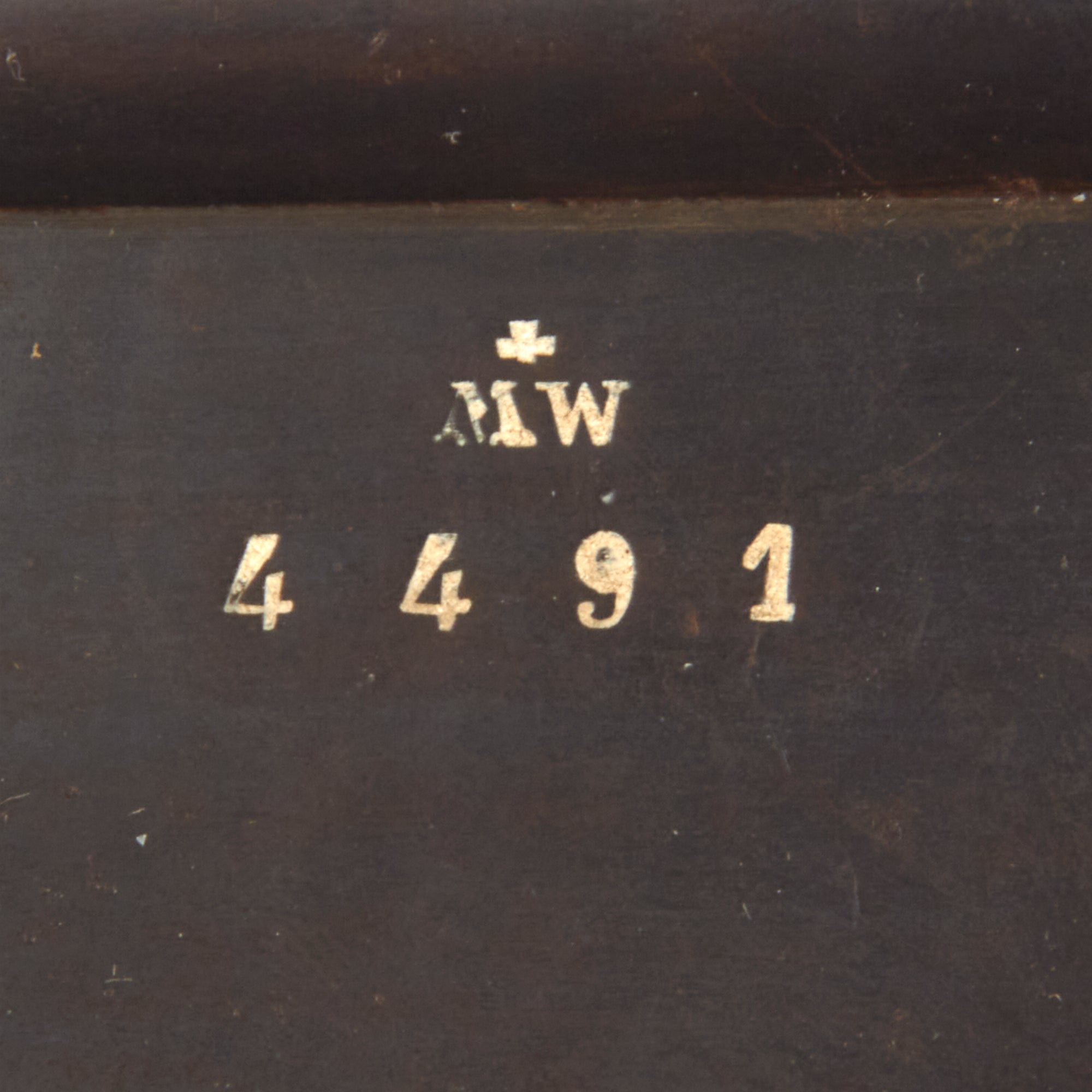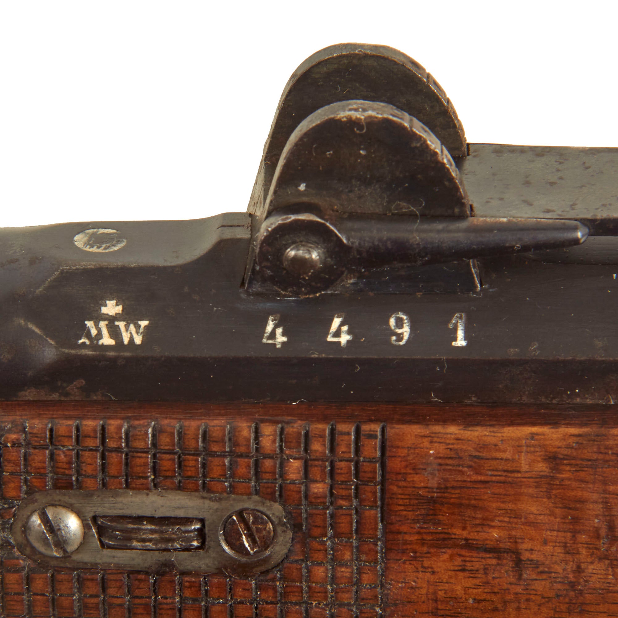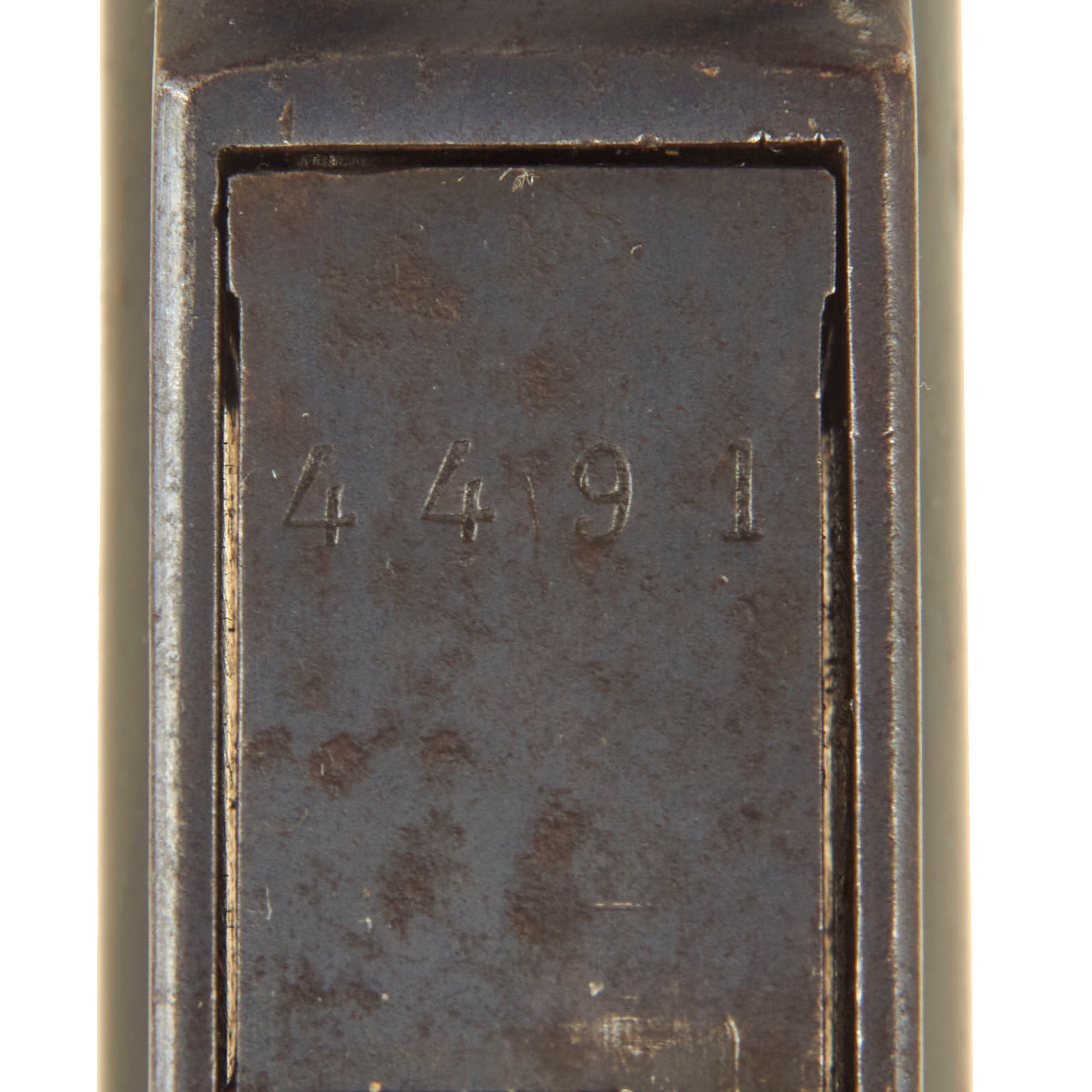 Serial number 4491 is found on the receiver below the maker mark, as well as on the chamber end of the barrel and on the bottom of the carrier block. There is also shortened number 491 on the back of the sight leaf. The maker mark indicates production by Eidgenössische Montier-Werstätte (Federal Assembly Workshop in Bern, Switzerland. They were an early Federal armorer / factory that produced approximately 8900 Vetterli M1869 & M1871 weapons between 1869 and 1874. They were one of many contractors employed before the completion of Waffenfabrik Bern. This is only the second example of this rare maker that we have seen. There are additional proof marks on metal components of the rifle, as well as some on the stock.