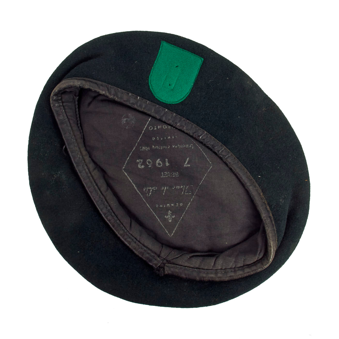 Original Item: Only One Available This is an excellent example of an early issue Special Forces Beret with a cut-edge Felt Flash denoting the wearer was a member of the 10th Special Forces Group. Following the 1961 official authorization of the beret, the US Army sourced Berets from Canada until the U.S. military contracted to have their own Berets made. Before 1961, berets were sourced within Europe. This beret is one of the earliest issue berets that was sourced from Canada, and is dated 1962.