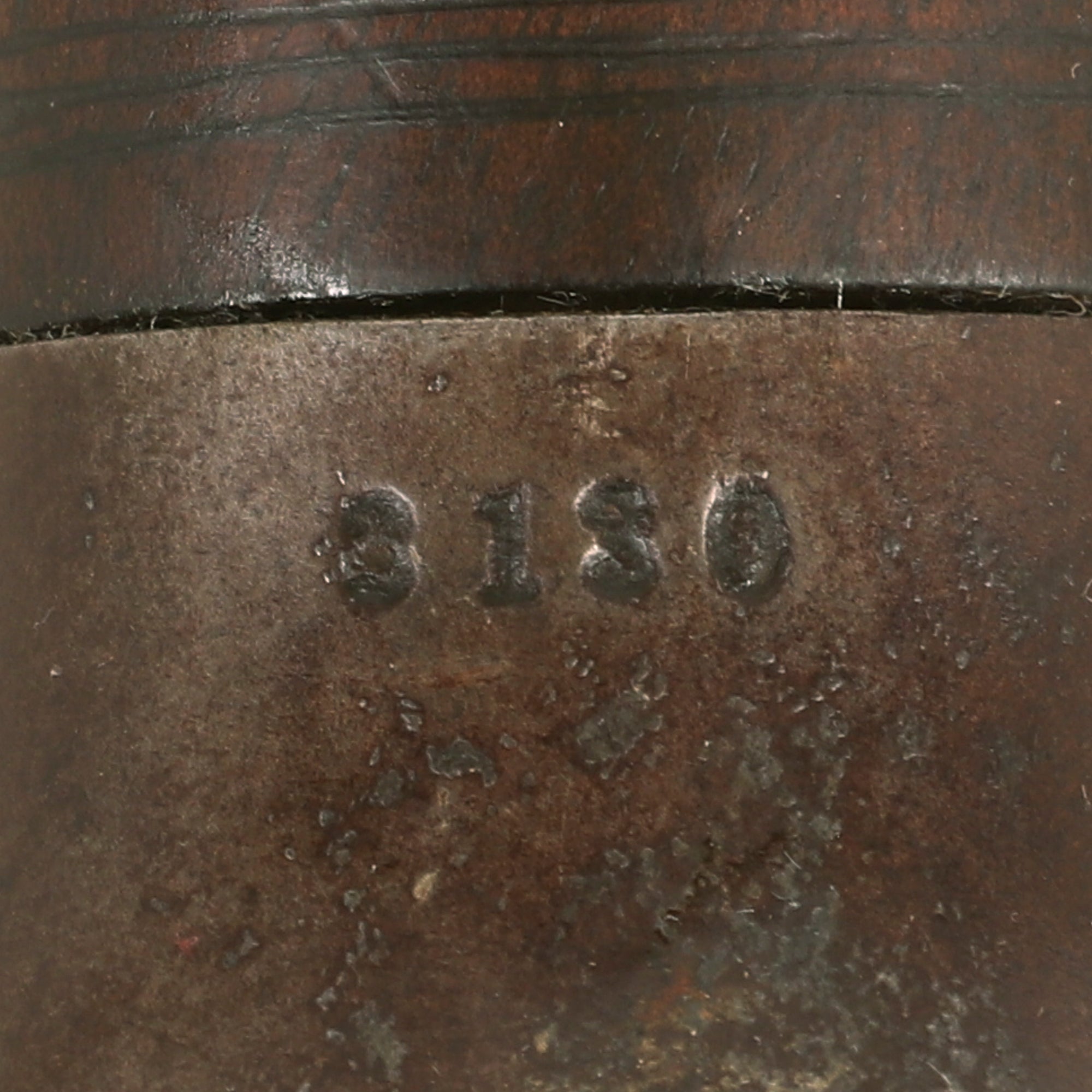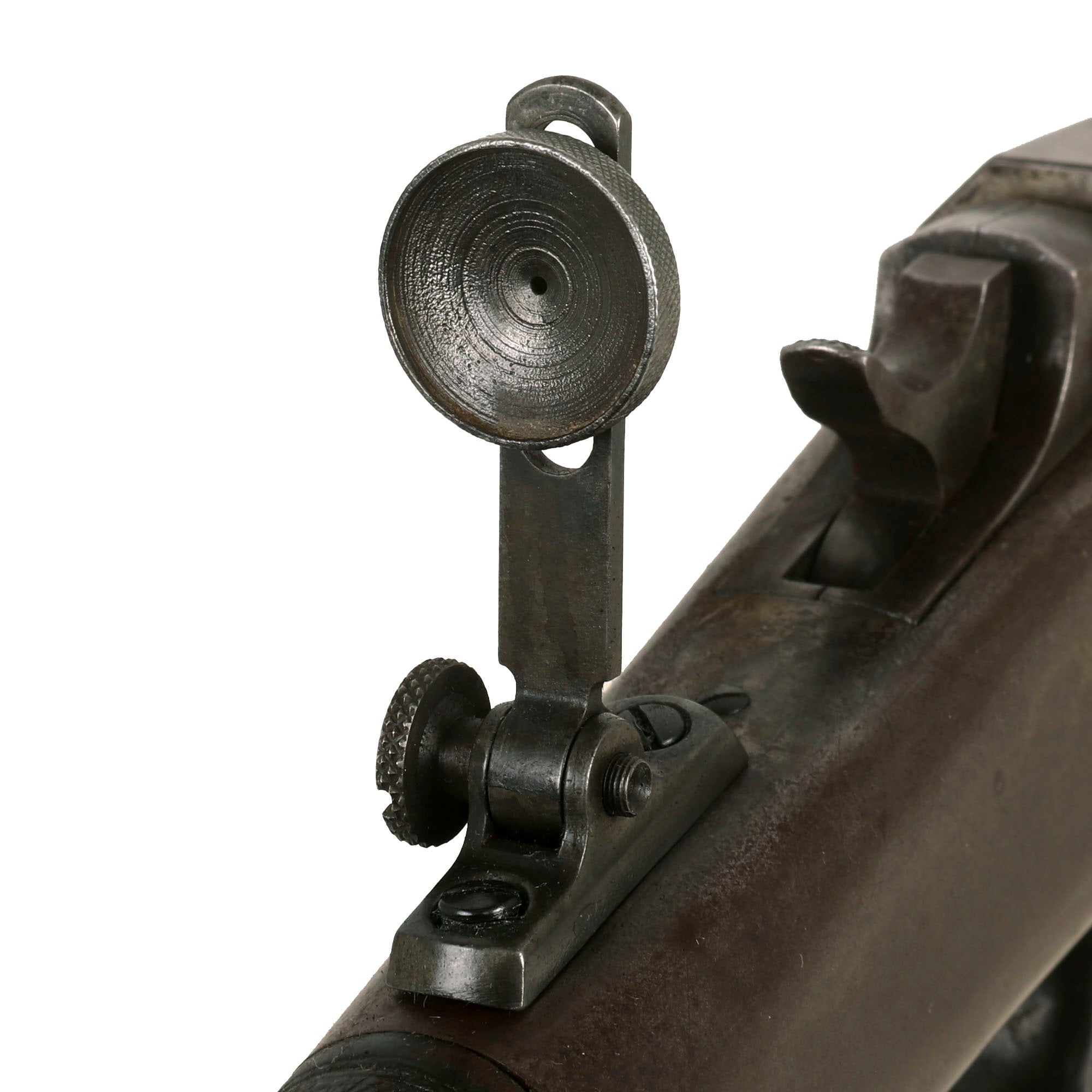 The action functions well, and we did not notice any mechanical deficiencies. The rear of the receiver is fitted with a lovely long range "peep" sight, which works well with the blade front sight. The bore however does show quite a bit of use, so the owner of this definitely enjoyed their match shooting.