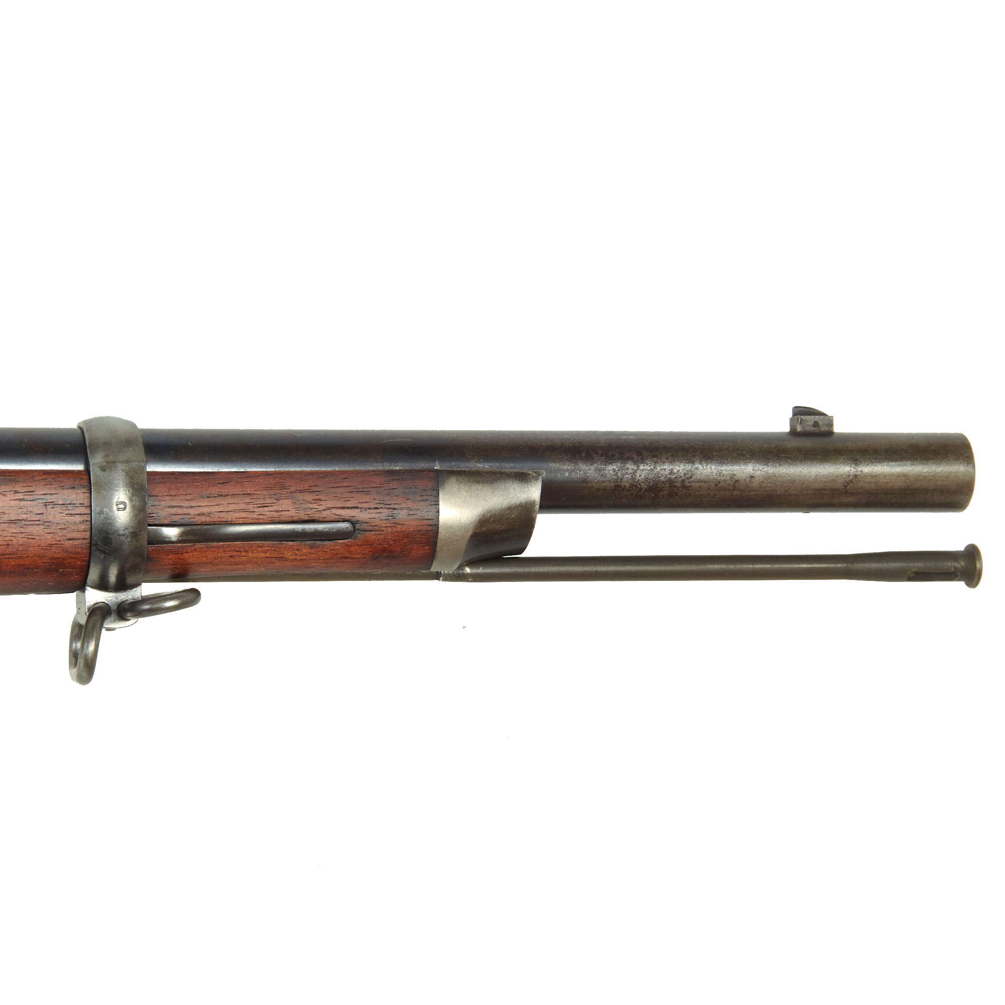 The rifle appears totally complete including its original cleaning rod, and is still in very good condition, with much of the original bluing still retained on the metalwork. There is definitely some wear towards plum and gray in areas, but for a rifle that saw naval service, it's definitely in great shape. There is staining, but no peppering or major oxidation present. The Buffington sight is functional, however there is a crack through the right bottom of the sight leaf by the hinge. The stock has a lovely color and no major damage, just the usual dents, scratches, and other wear consistent with long service.