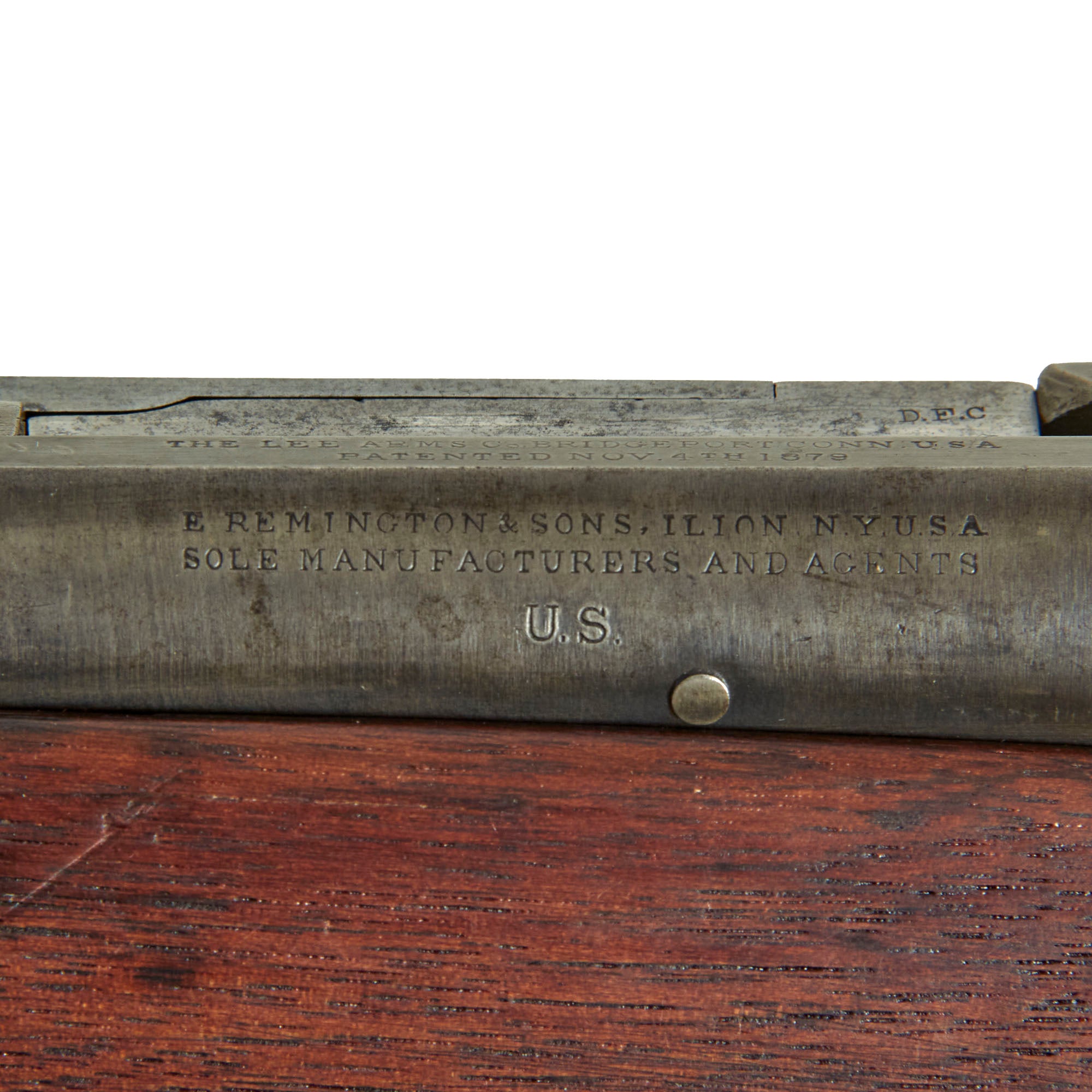 This lovely example is one of the ONLY 750 Model 1882 rifles received by the U.S. Army as part of their trials contract. It is marked correctly for an Army issued rifle, with U.S. next to V / P on the barrel nocks form, with a D.F.C. stamp on the left side of the barrel. This is for Army ordnance sub-inspector David F. Clark, who worked from 1861-1886, and is specifically noted for inspecting Remington-Lee rifles. He also inspected a wide variety of other small arms during his long tenure, even including some Colt Gatling Guns. His stamp is also seen on the magazine well, the receiver, and the bolt.