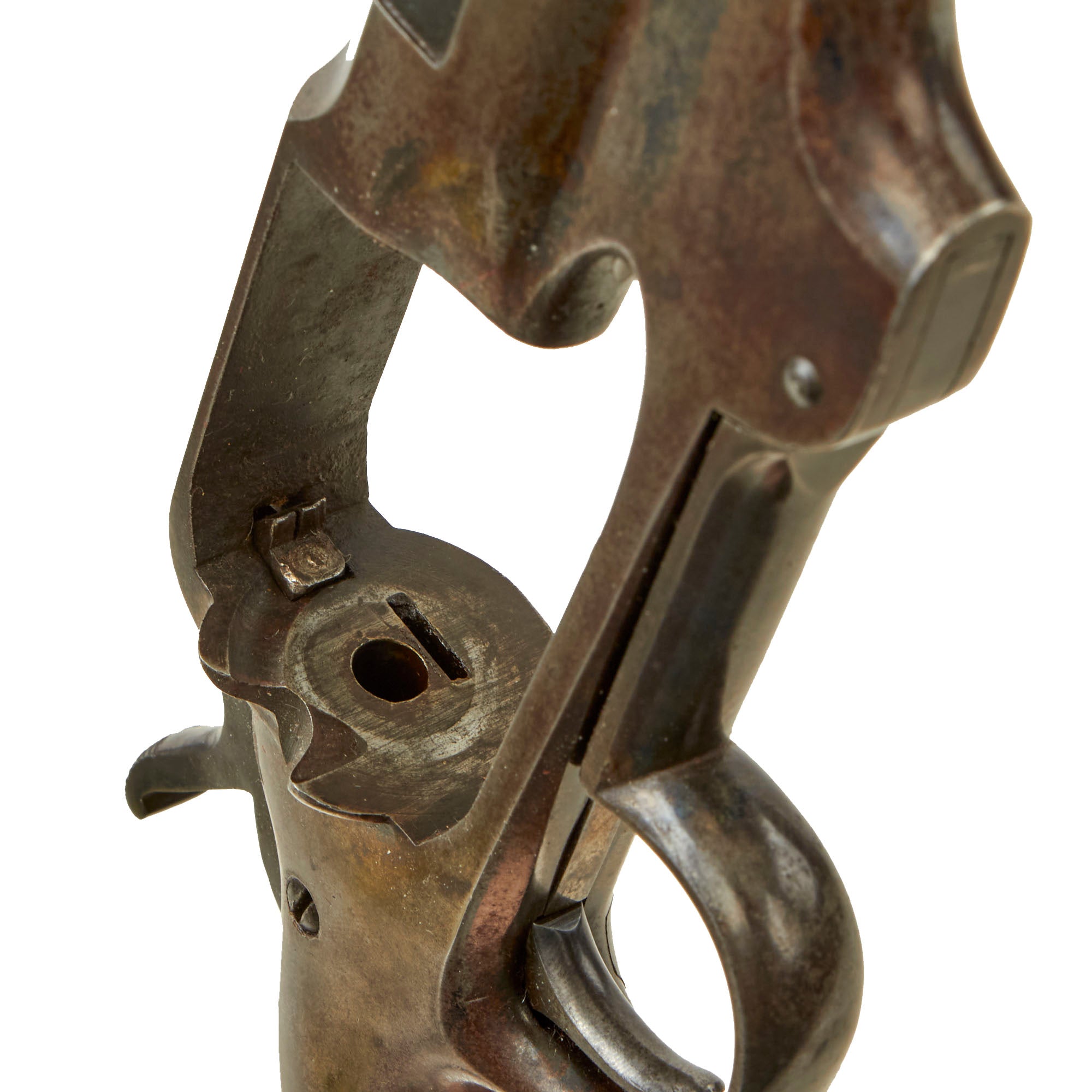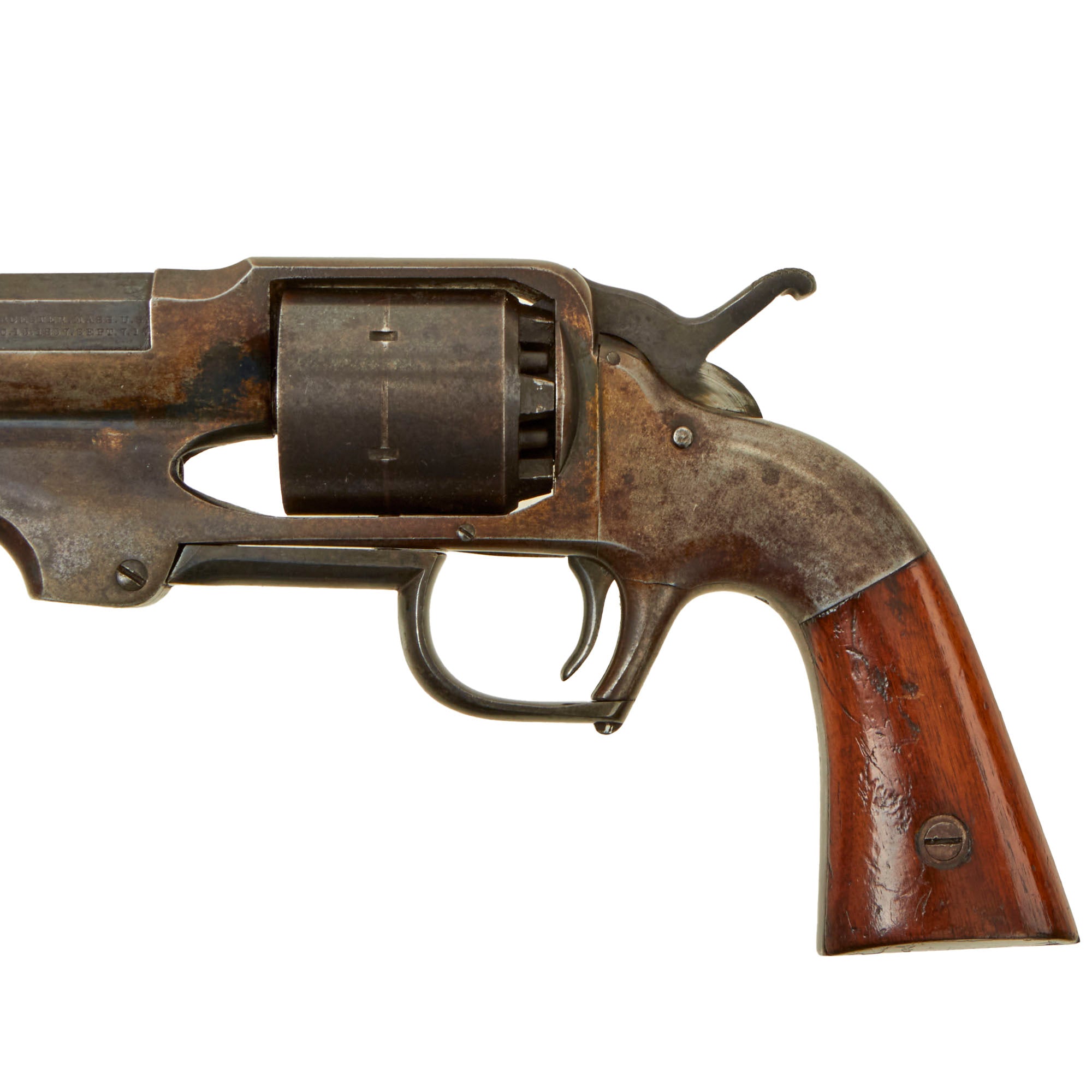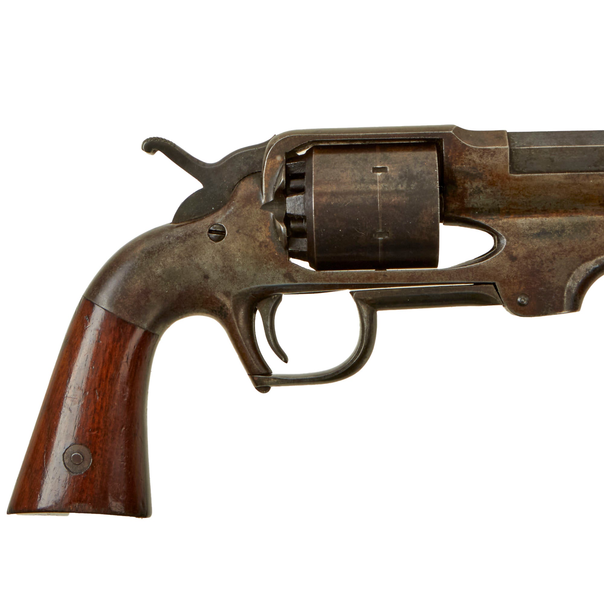 Other examples we have seen also have the ends of the markings removed or covered, as it looks like the markings were stamped prior to milling the front of the barrel round and fitting the barrel into the frame. As the "ALLEN & WHEELOCK" trade name was used from 1856 to 1865, this revolver definitely falls right into the civil war period. According to Flayderman’s Guide to Antique American Firearms only an estimated 700 of these rifles were produced in period 1861-1862, making every example very rare! This also puts it firmly into the early Civil War period, and it most likely was put into service during the conflict.