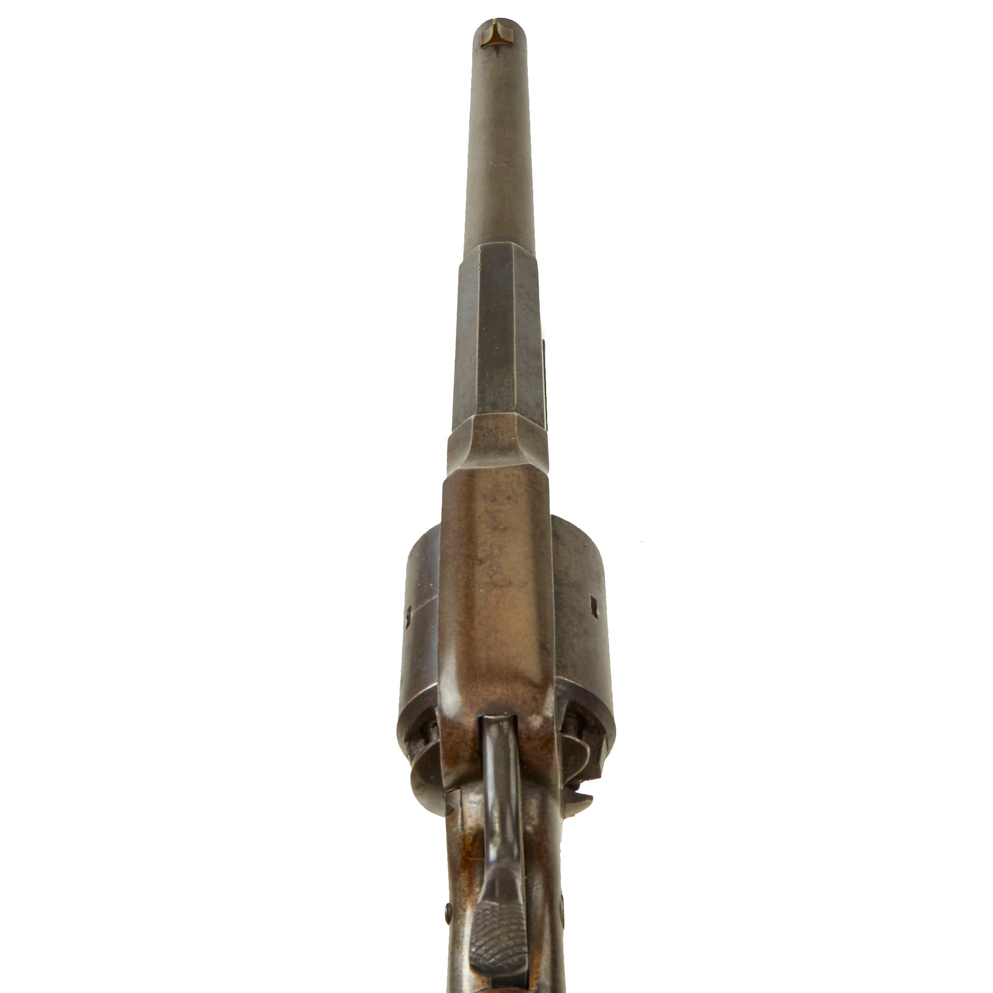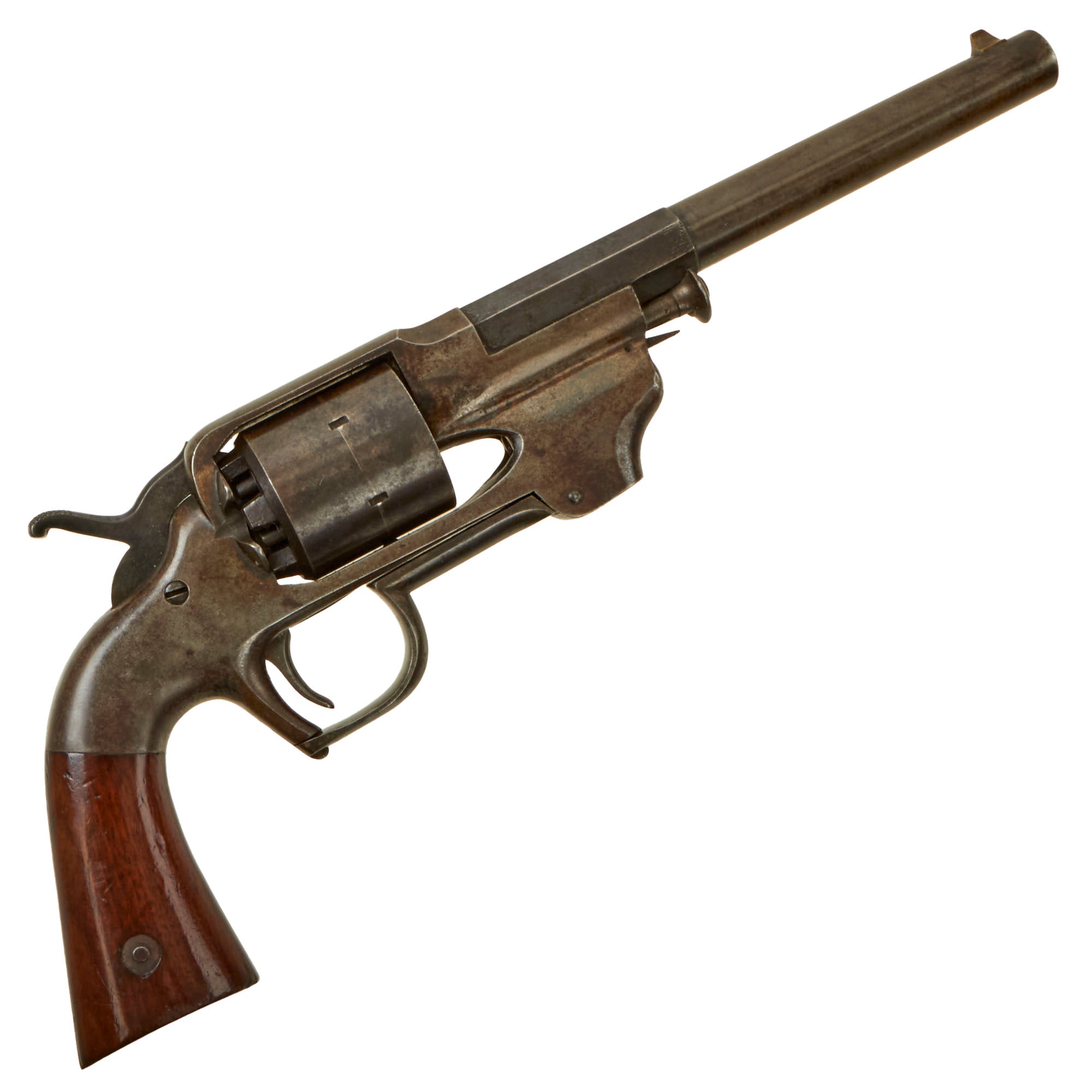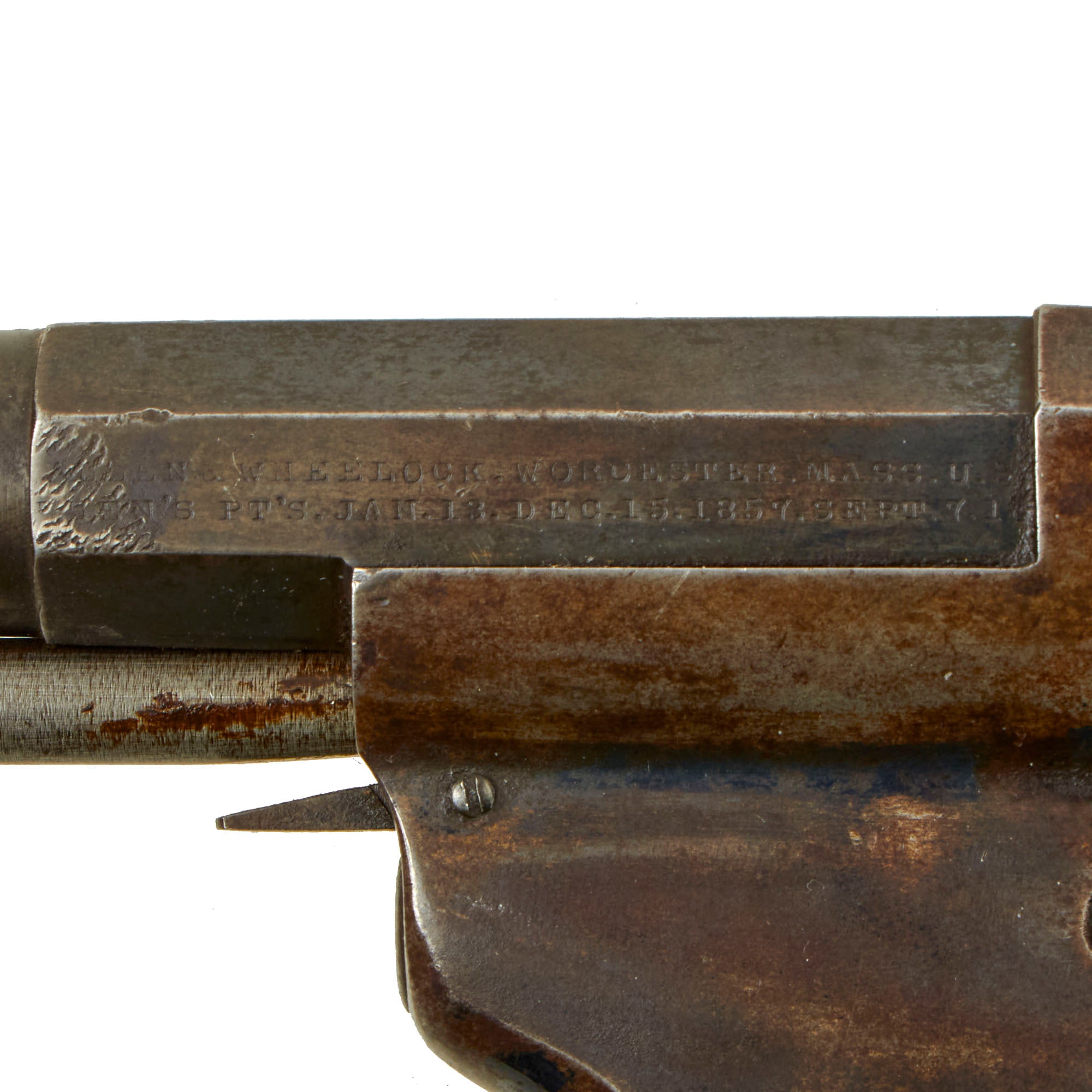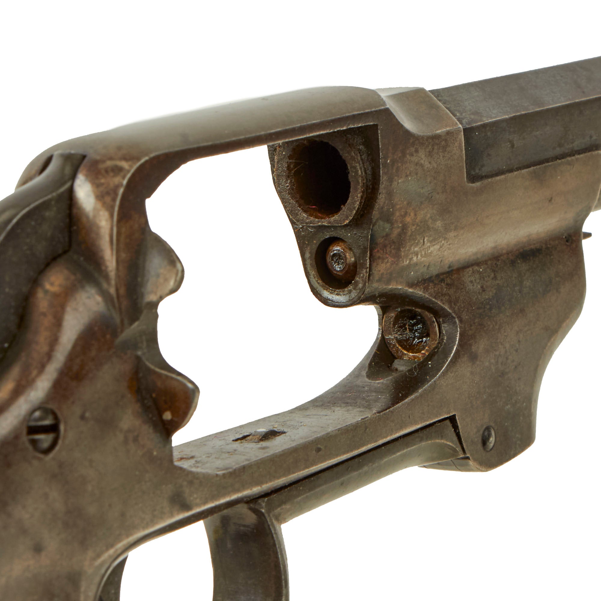 Other examples we have seen also have the ends of the markings removed or covered, as it looks like the markings were stamped prior to milling the front of the barrel round and fitting the barrel into the frame. As the "ALLEN & WHEELOCK" trade name was used from 1856 to 1865, this revolver definitely falls right into the civil war period. According to Flayderman’s Guide to Antique American Firearms only an estimated 700 of these rifles were produced in period 1861-1862, making every example very rare! This also puts it firmly into the early Civil War period, and it most likely was put into service during the conflict.