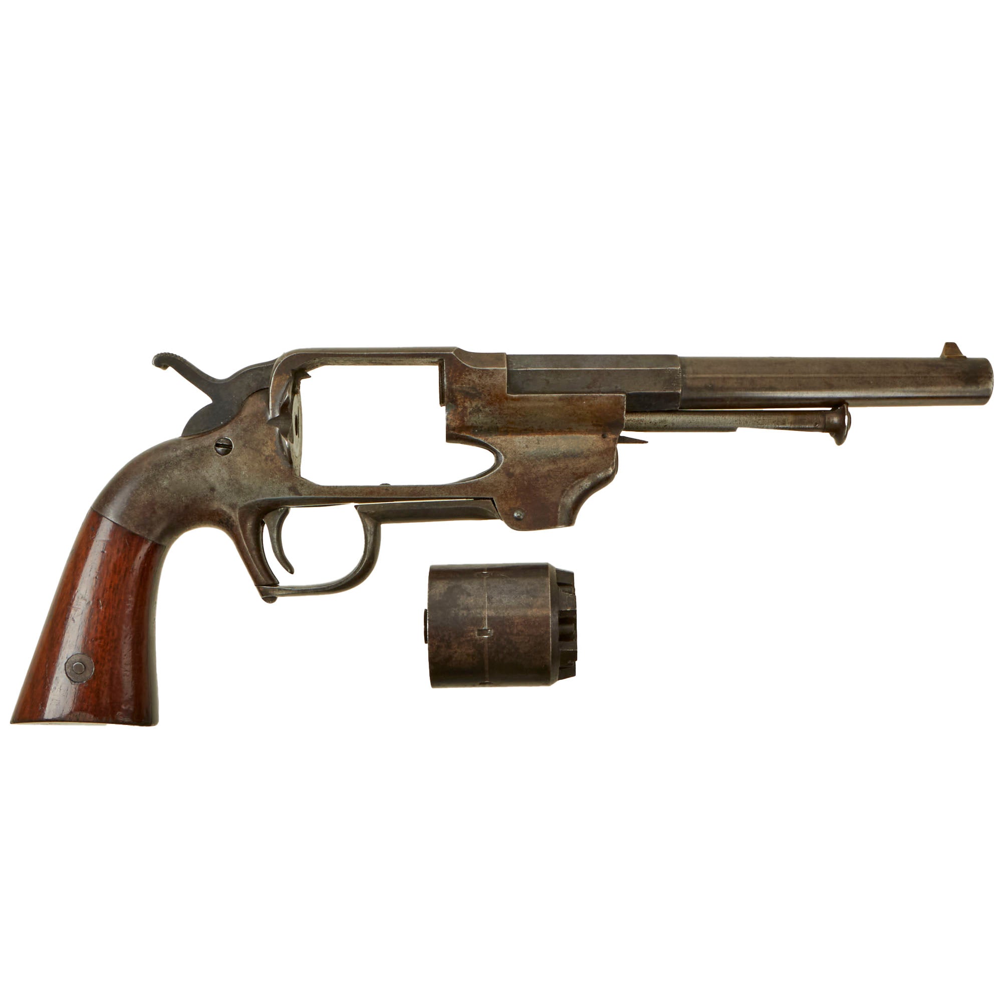 Original Item: One of a Kind. This is a great example of the rare .44cal "Army" version of the "Center-Hammer" Percussion Revolvers made by Ethan Allen and his brother-in-law Thomas Wheelock in Worcester, Mass. Allen was involved in a series of different partnerships, which makes the firearms relatively easy to place in time. The right side of the octagonal barrel is just a bit marred, and the original patent markings are still mostly legible: