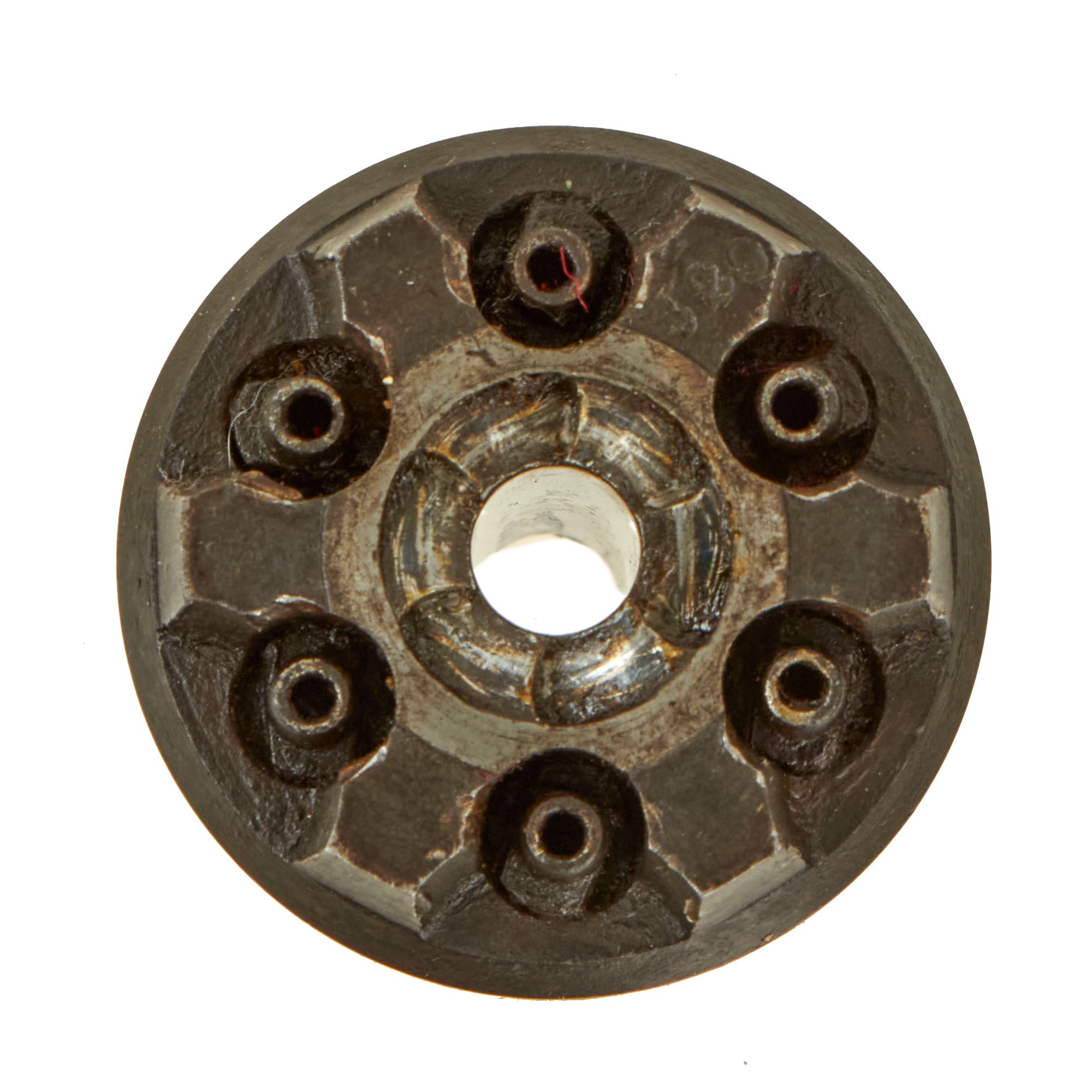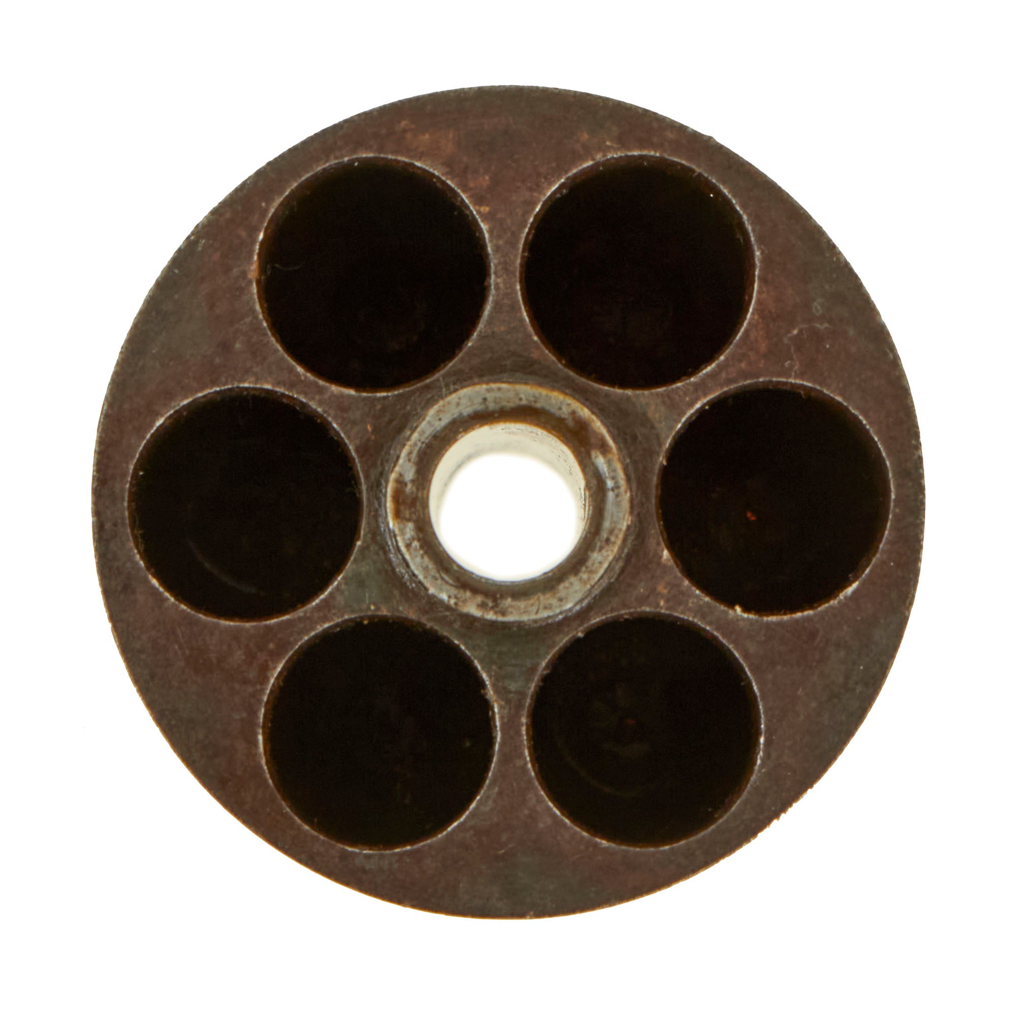 The revolver functions beautifully, with a strong smooth action and a strong mainspring. It indexes correctly with a solid cylinder lockup, and a crisp dry fire. We have not noticed any of the usual "finicky" behavior of the action on this revolver. The loading rammer is functional, and the cylinder arbor pin pulls out easily. releasing the cylinder for cleaning and reloading. The bore is in excellent condition, showing a bright finish with crisp lands and grooves. This revolver does not look to have seen much use at all, and was definitely cleaned after it was fired, leaving it as a fantastic example. The cap nipple cones are all clear and in very good condition, showing some powder burn on the exterior, but no major damage or mushrooming from hammer strikes. There is some grease in the chambers that can plug up the ignition channel, but that is easily cleaned away.