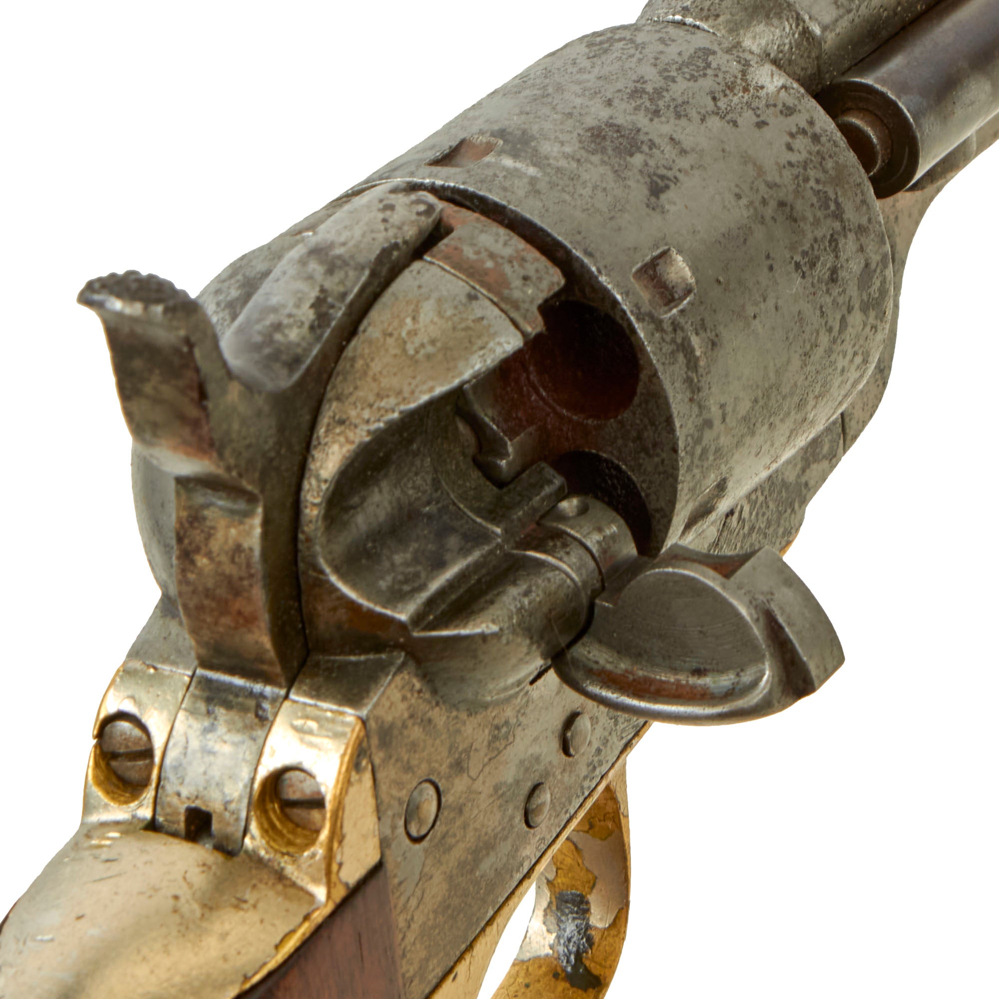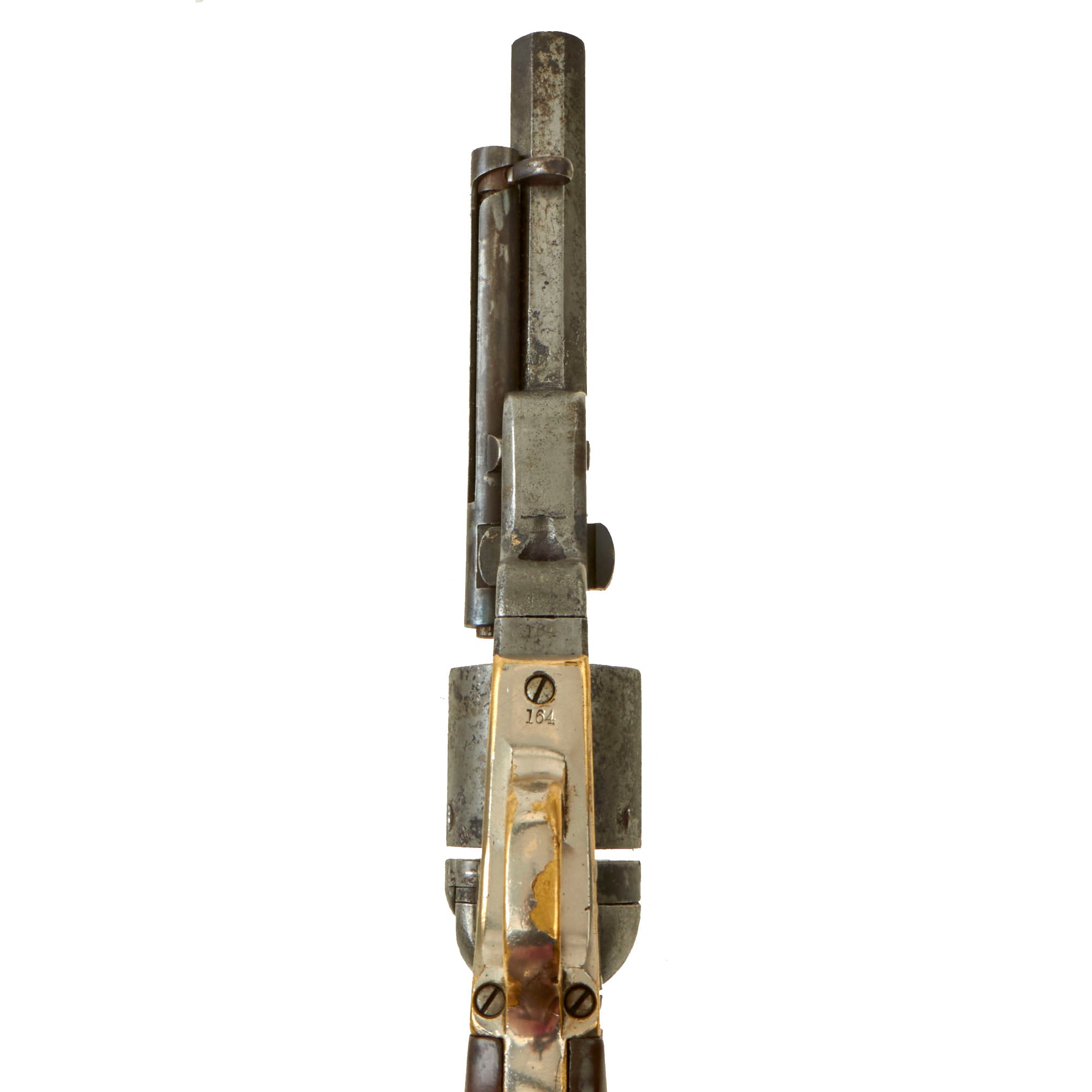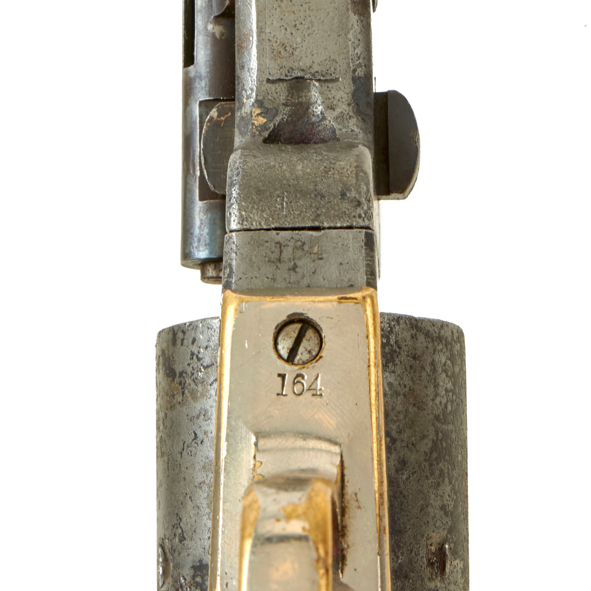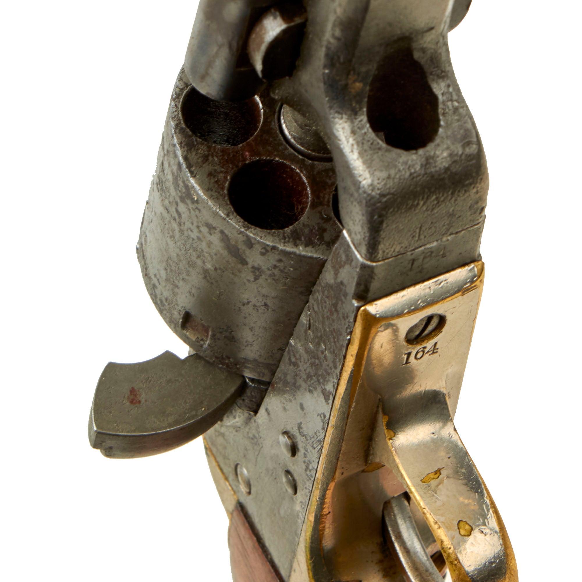 This is one such example, which unlike others we have seen looks to have used leftover parts from the Colt Navy Model 1851 Percussion Revolver in .36 caliber. It bears a very low serial number 164, which is almost certainly not part of the Model 1851 serial sequence, and was instead added to parts used to make this factory converted revolver. It looks to have been made mostly from modified parts, not utilizing any purpose built parts like some later examples.