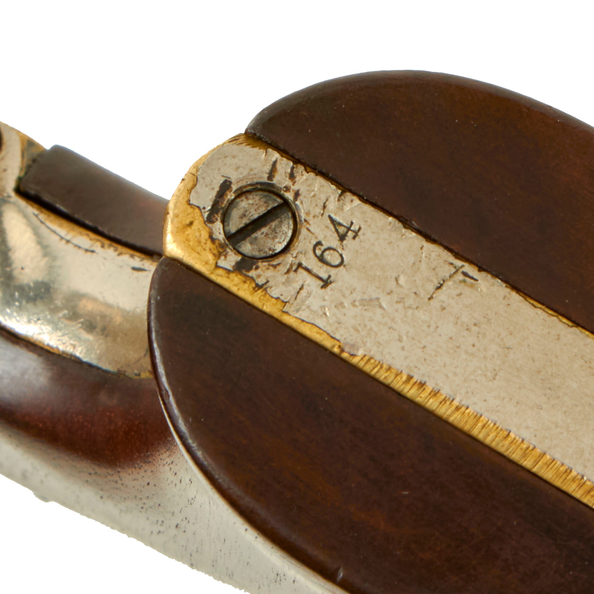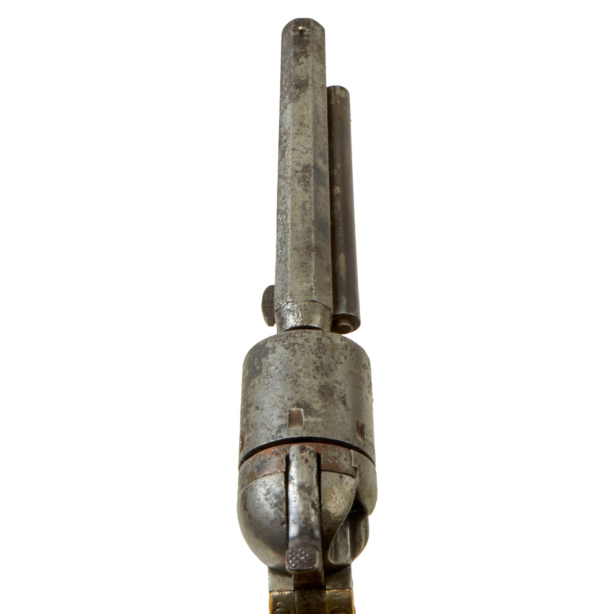 This example is in very nice patinated condition, looking to have seen long service, probably out on the western frontier. It has serial number 164 on the barrel, frame, grip, and trigger guard. The address marking on the top of the cylinder is almost completely worn away, with only remnants such as "COL" still visible. We also cannot see any markings on the cylinder, and the barrel wedge is stuck tight, so we were not able to check the arbor pin or other components for numbers. The cylinder has had the original "Stagecoach Holdup" scene completely removed from the exterior, along with the "PATENT" marking. The COLTS / PATENT markings on the left side of the frame is still faintly visible, and the 36CAL marking on the left side of the trigger guard is present as well.