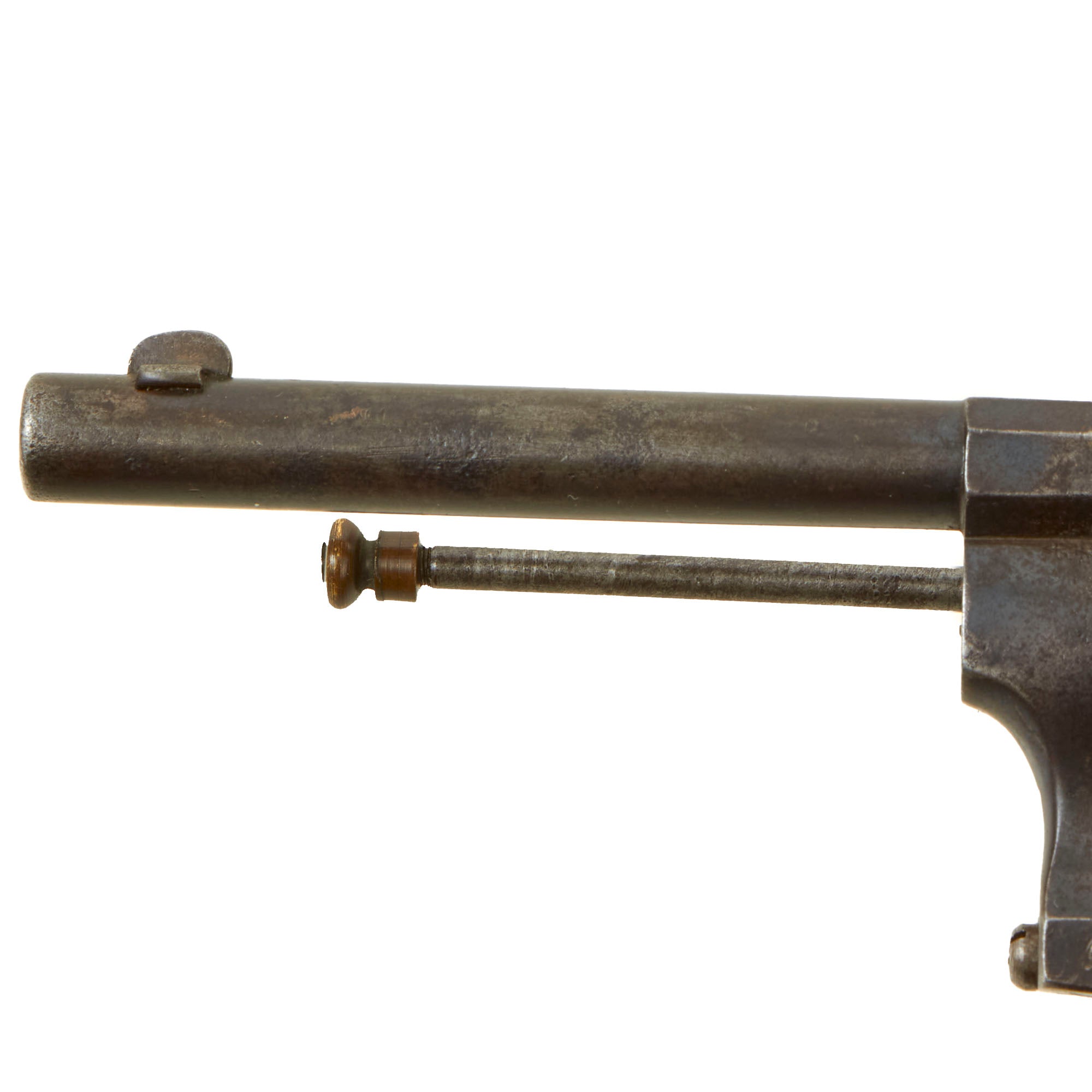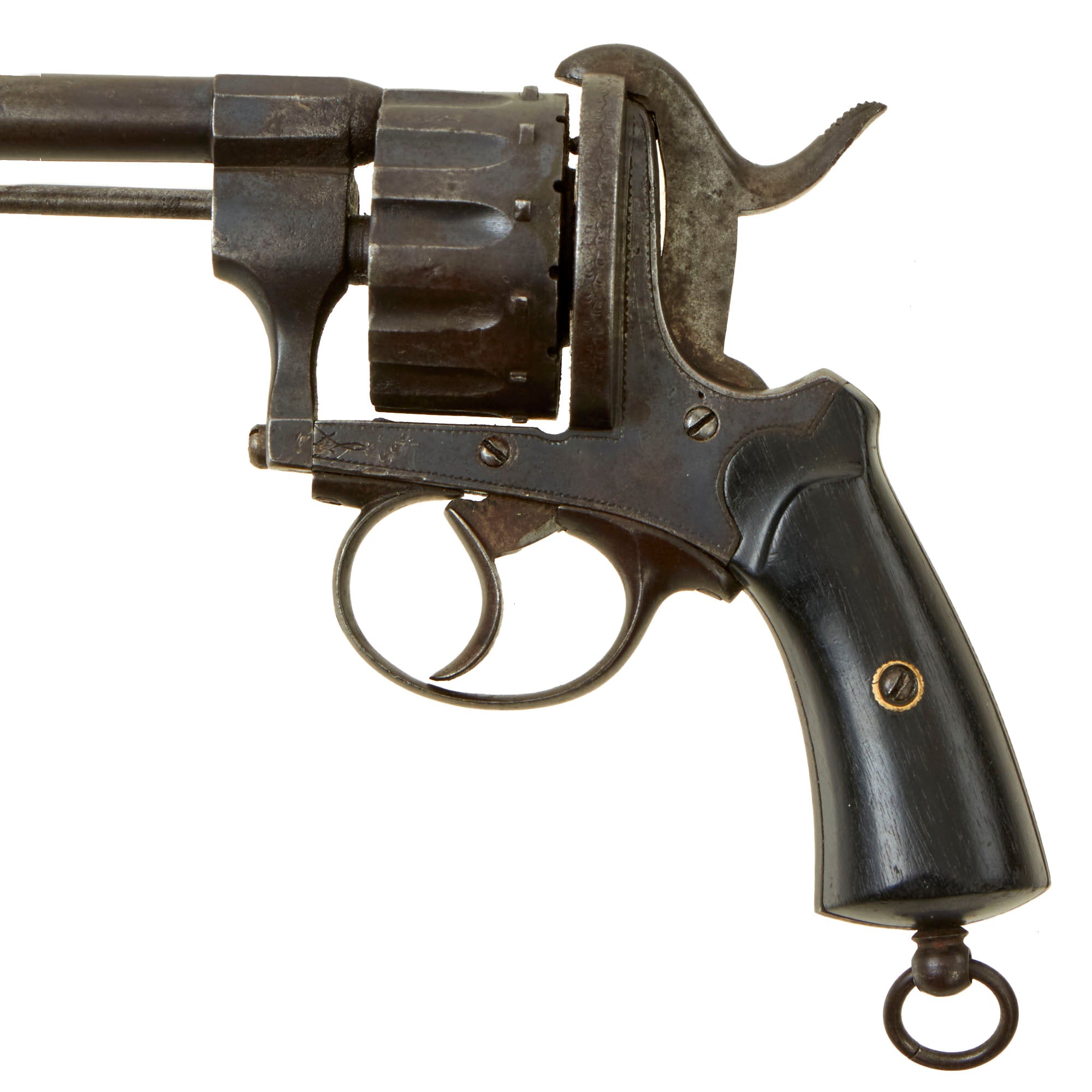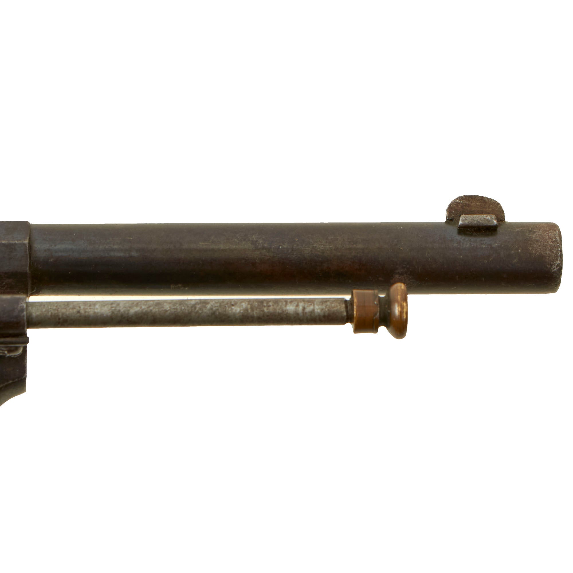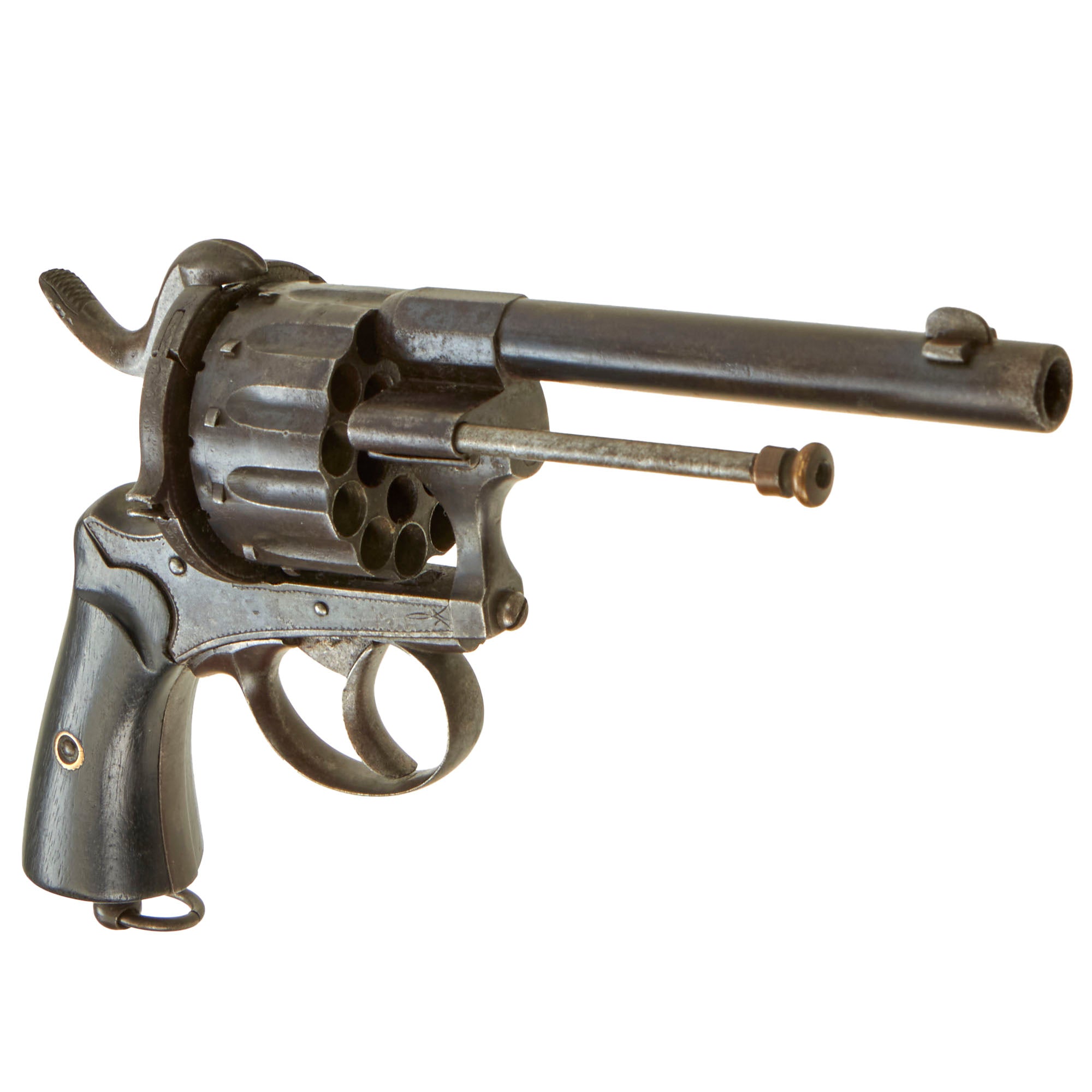 Original item. Only One Available. This is a really fantastic and rare U.S. Civil War era French 7mm pinfire revolver, with a MASSIVE TWELVE ROUND CYLINDER! Apparently the solution to not having to reload as often was this, resulting in a very impressive (and heavy) revolver. It was originally produced in the less common 7mm Lefaucheux pinfire chambering, and functions in both double and single action. At some point after the Civil War period, a spring and firing pin were added under the hammer so it could take center fire ammunition, but if this was removed and the hold plugged, it could easily be returned to its original state.