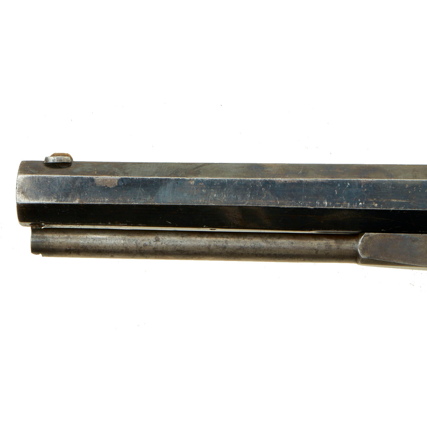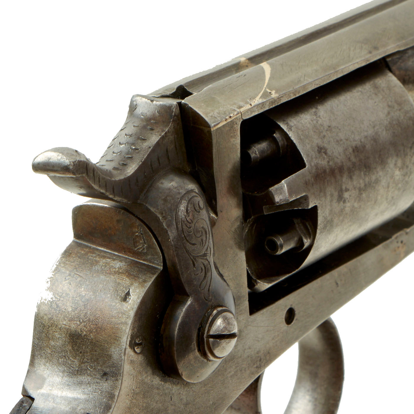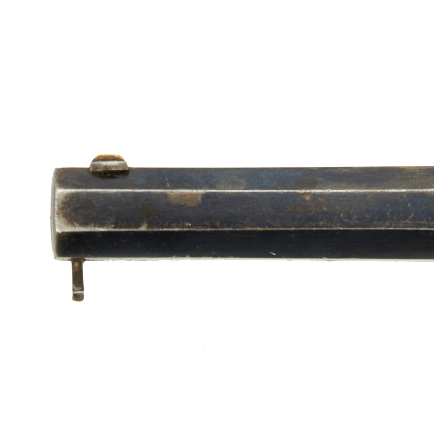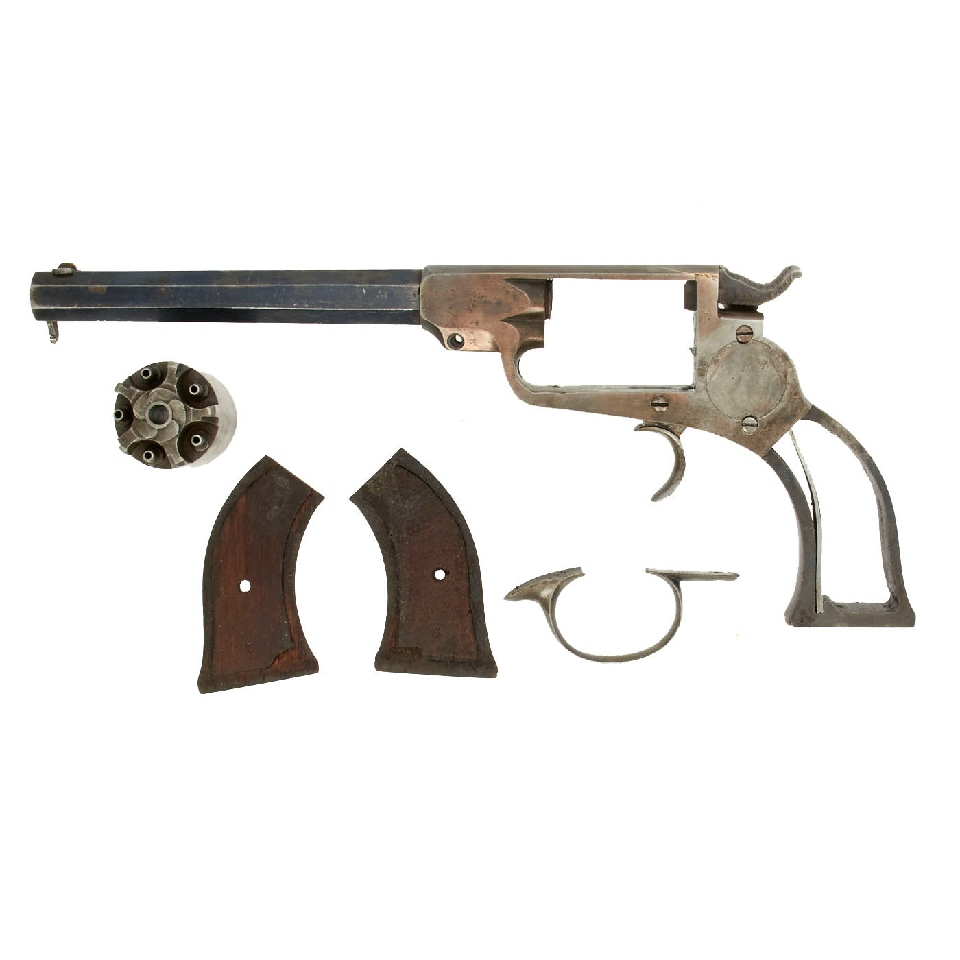 Our expert gunsmith team has improved upon the old repairs making it mechanically sound (though we do not recommend firing it) and aesthetically pleasing. This example has no visible markings aside from the serial number 5 on the barrel, loading lever, inside of the trigger guard, left side of the toe, and inside of the grips and an "F" on the right side at the toe. The hammer and trigger guard bow are scroll engraved, but the rest of the gun is plain.