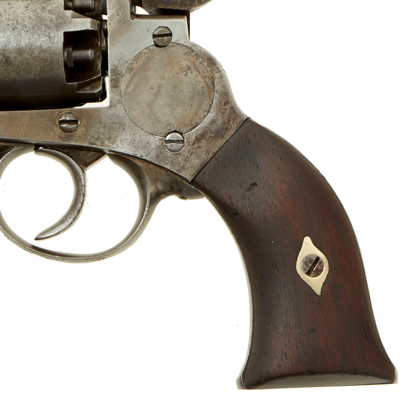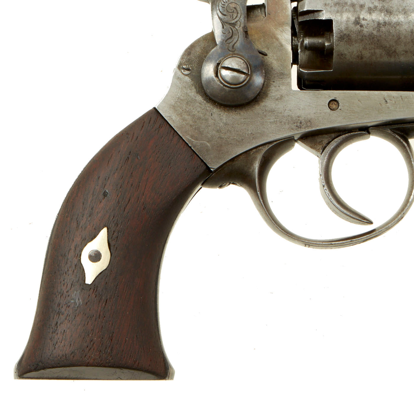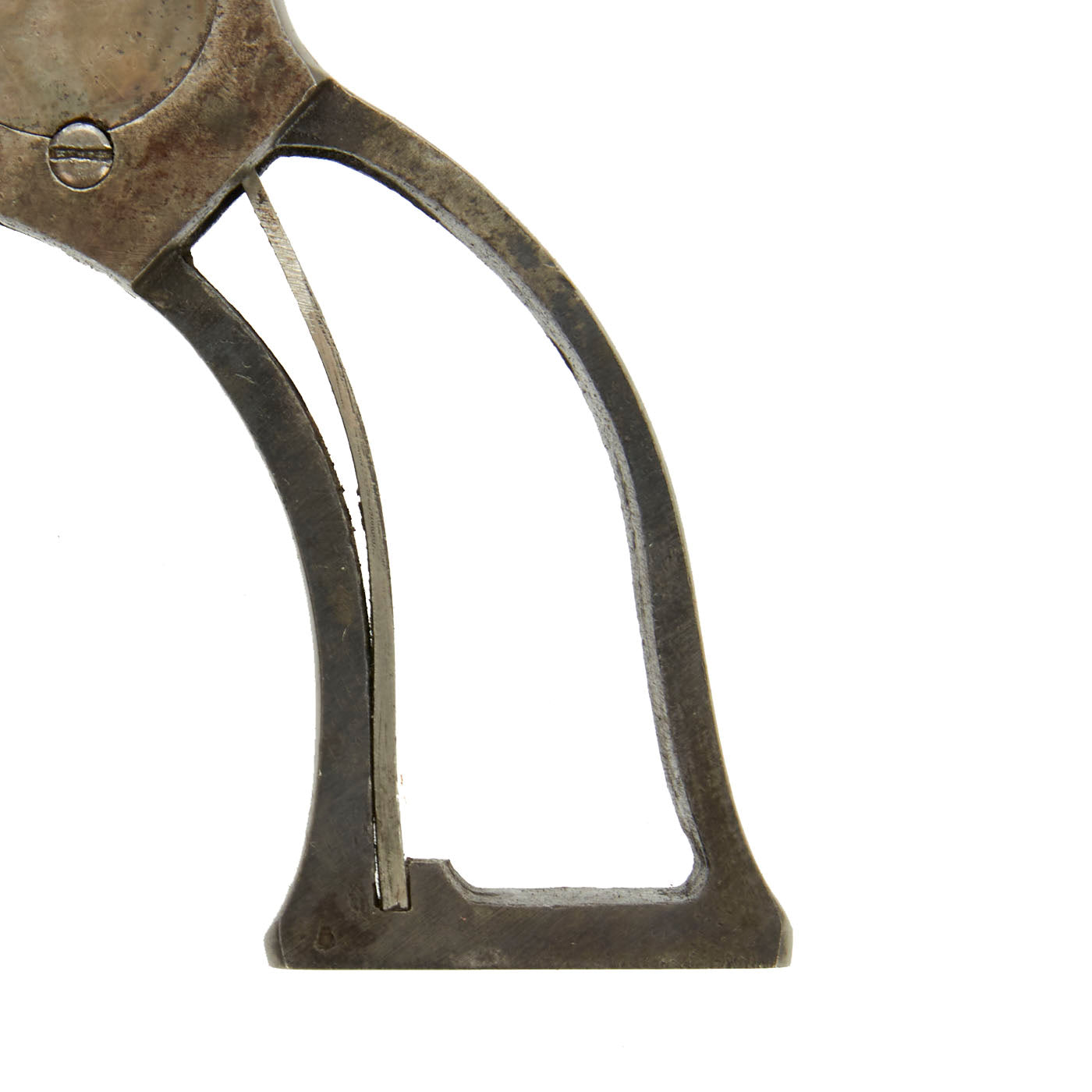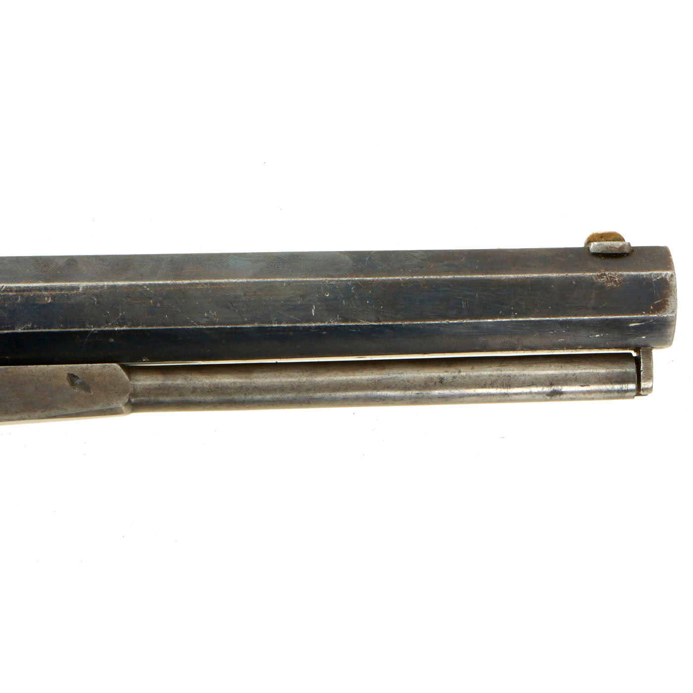 Our expert gunsmith team has improved upon the old repairs making it mechanically sound (though we do not recommend firing it) and aesthetically pleasing. This example has no visible markings aside from the serial number 5 on the barrel, loading lever, inside of the trigger guard, left side of the toe, and inside of the grips and an "F" on the right side at the toe. The hammer and trigger guard bow are scroll engraved, but the rest of the gun is plain.