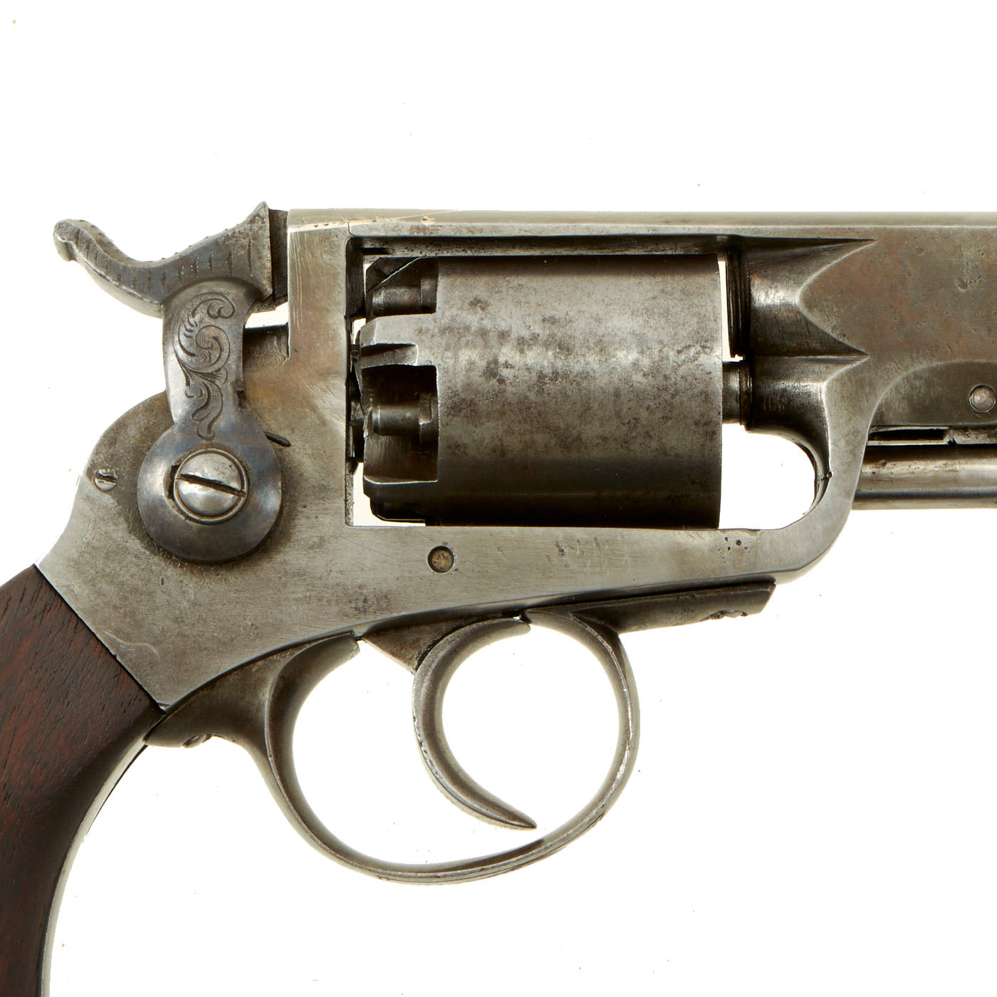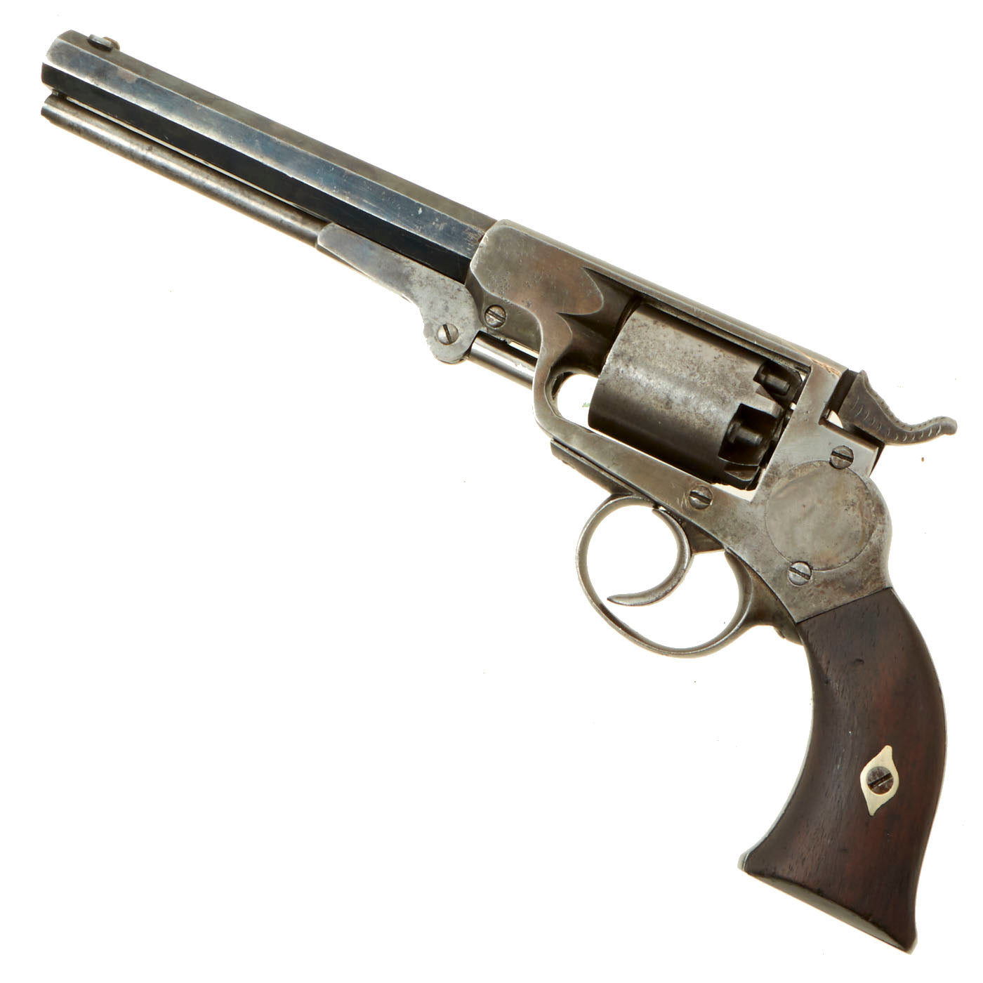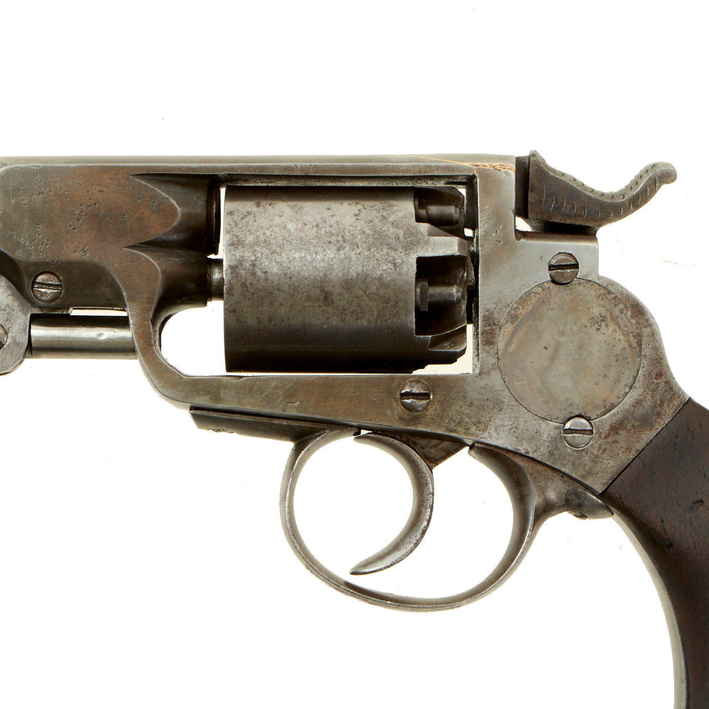 Like most percussion revolvers of the mid-19th century, the guns were produced in two basic frame sizes; a .31 caliber “pocket” size and a .36 caliber “navy” size. Both versions were produced in two design variants. All models were five-shot, double action revolvers with Colt-style under-barrel loading levers. The lever catch was a uniquely machined piece that engaged mirror image machining on the face of the lever. This was a simple and artistic way to lock the lever in place without relying upon any kind of spring loaded catch or mechanism; the catch was based entirely upon geometry and friction. It appears that blued finishes with color casehardened hammers and loading levers were standard. Most known examples have frames engraved with New York style foliate arabesque scrolls and the two-piece smooth walnut grips were varnished. One of the more interesting features of the larger, “navy” sized revolver was a removable circular sideplate on the left side of the frame that allowed access to the revolver’s mechanism.