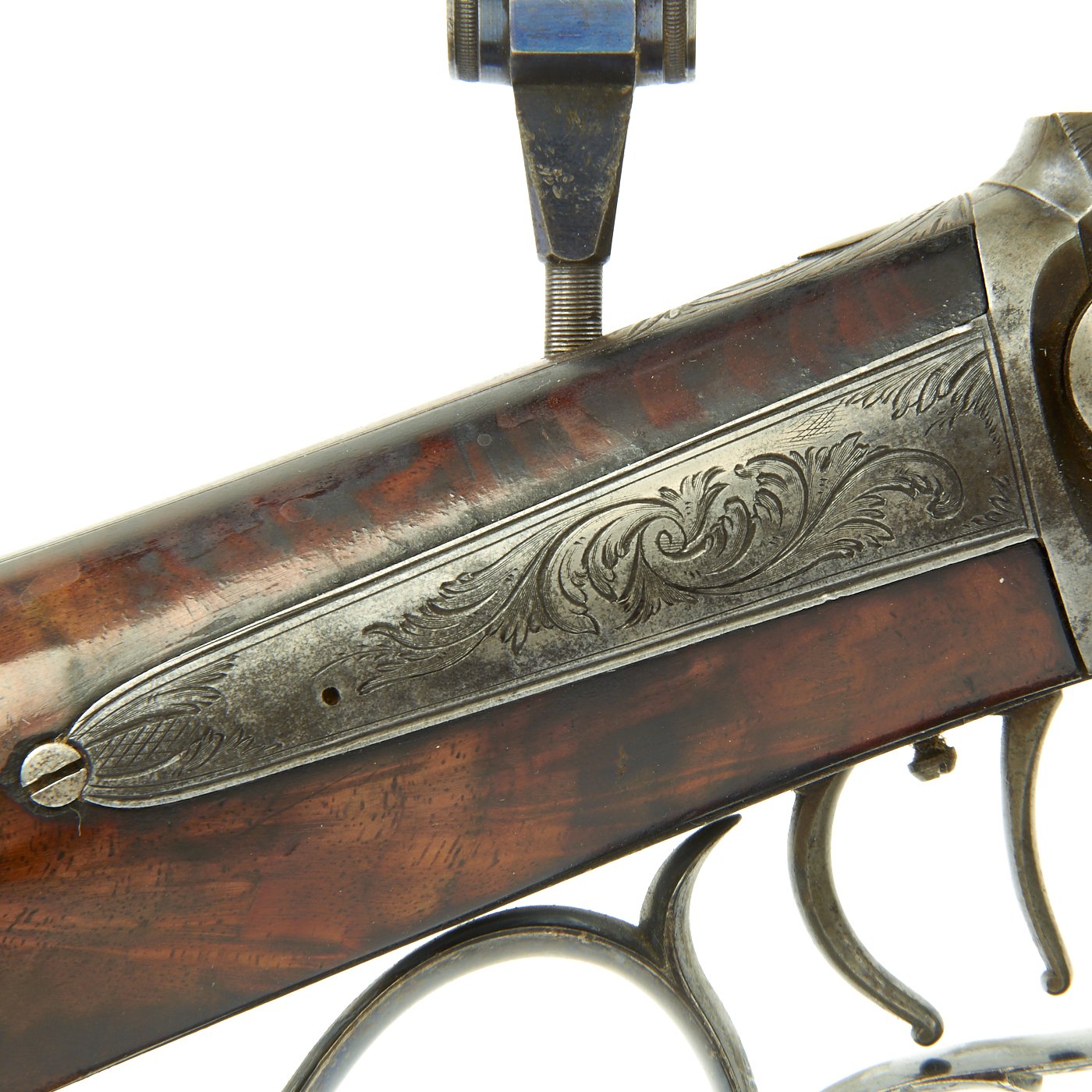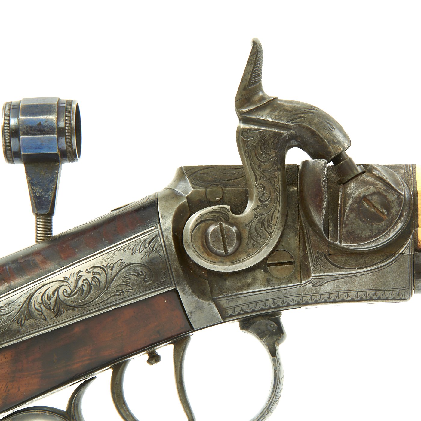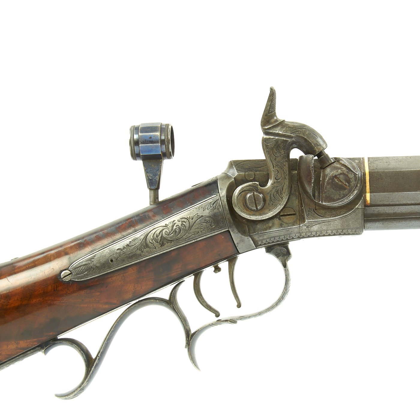 The Rifle is fitted with an engraved back action percussion lock, mounted in the fully engraved frame of the Rifle. The engraved intricate multi finger rest trigger guard encloses double set triggers. The tang directly behind the barrel features a screw in elevated Peep Sight surrounding a very small aperture hole. Not designed for any sort of wood Forend, the Octagonal Barrel is intricately engraved on the top flat Wesson Hartford Conn and supports an iron front tubular fore sight cover containing a vertical blade surmounted by a circle for accuracy. There is a small socket under the rifle’s chamber with a square nut inside, which may be for adjusting the height of the sight. We unfortunately do not have a square key that fits, so we unfortunately have no way to test it out.