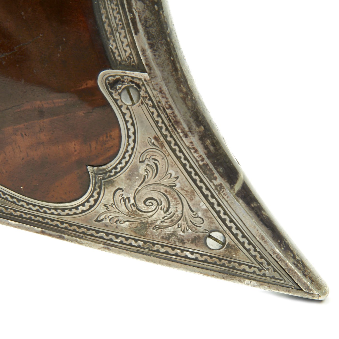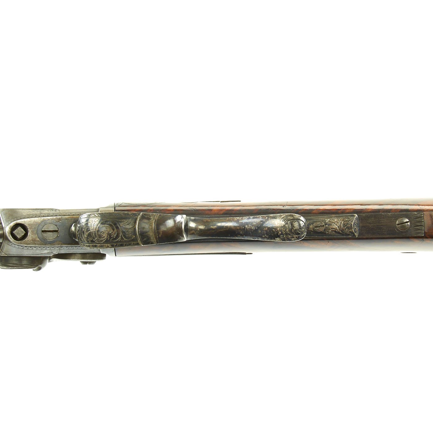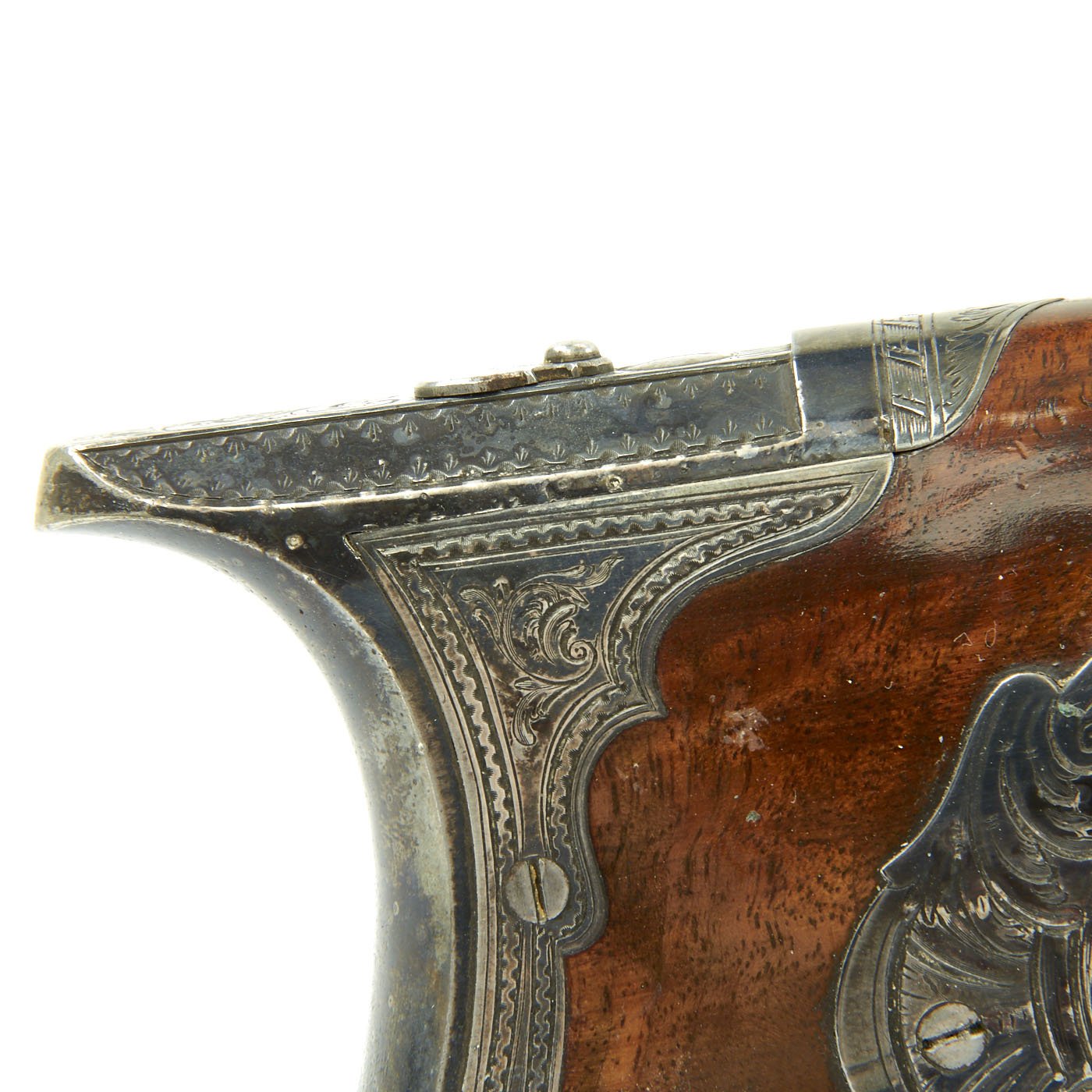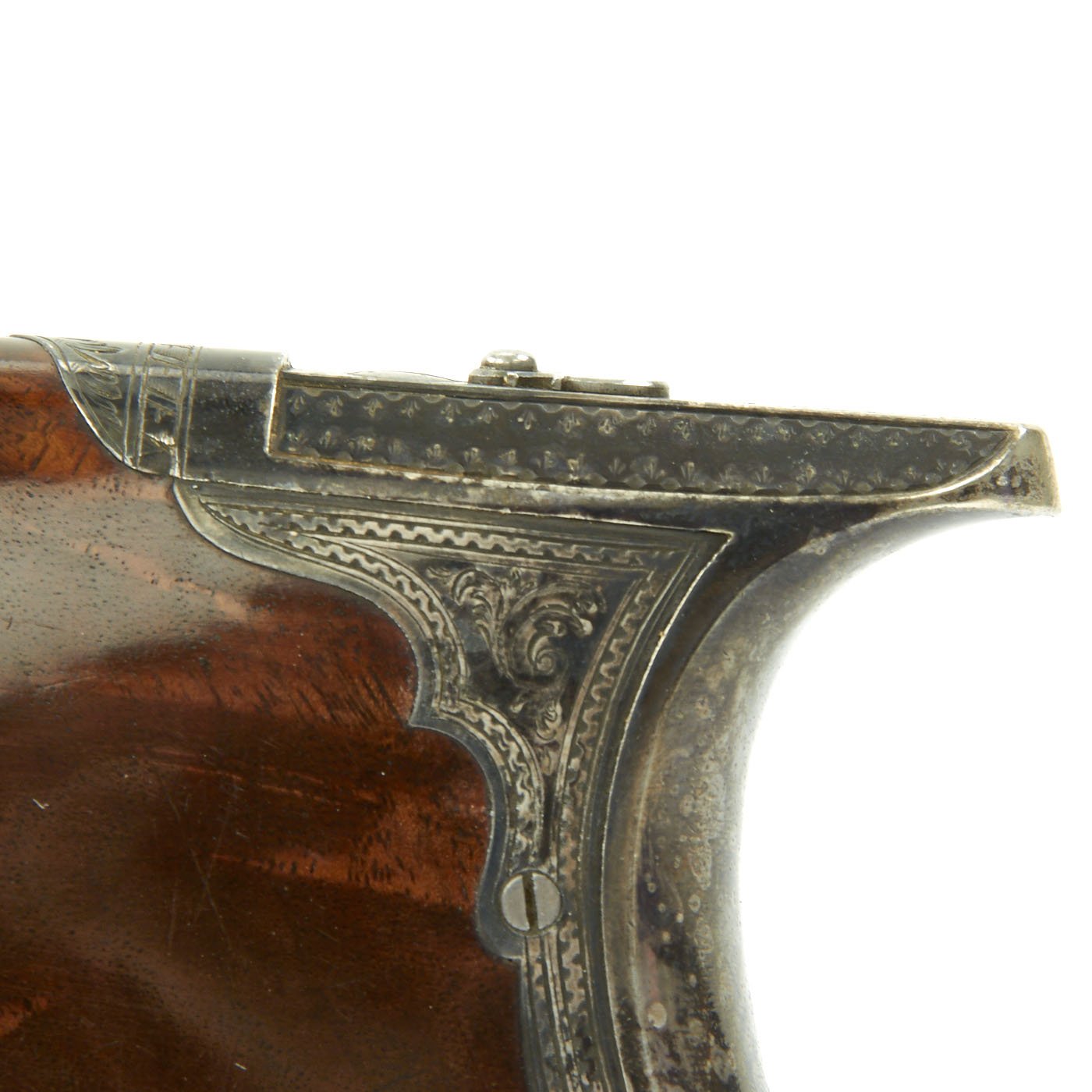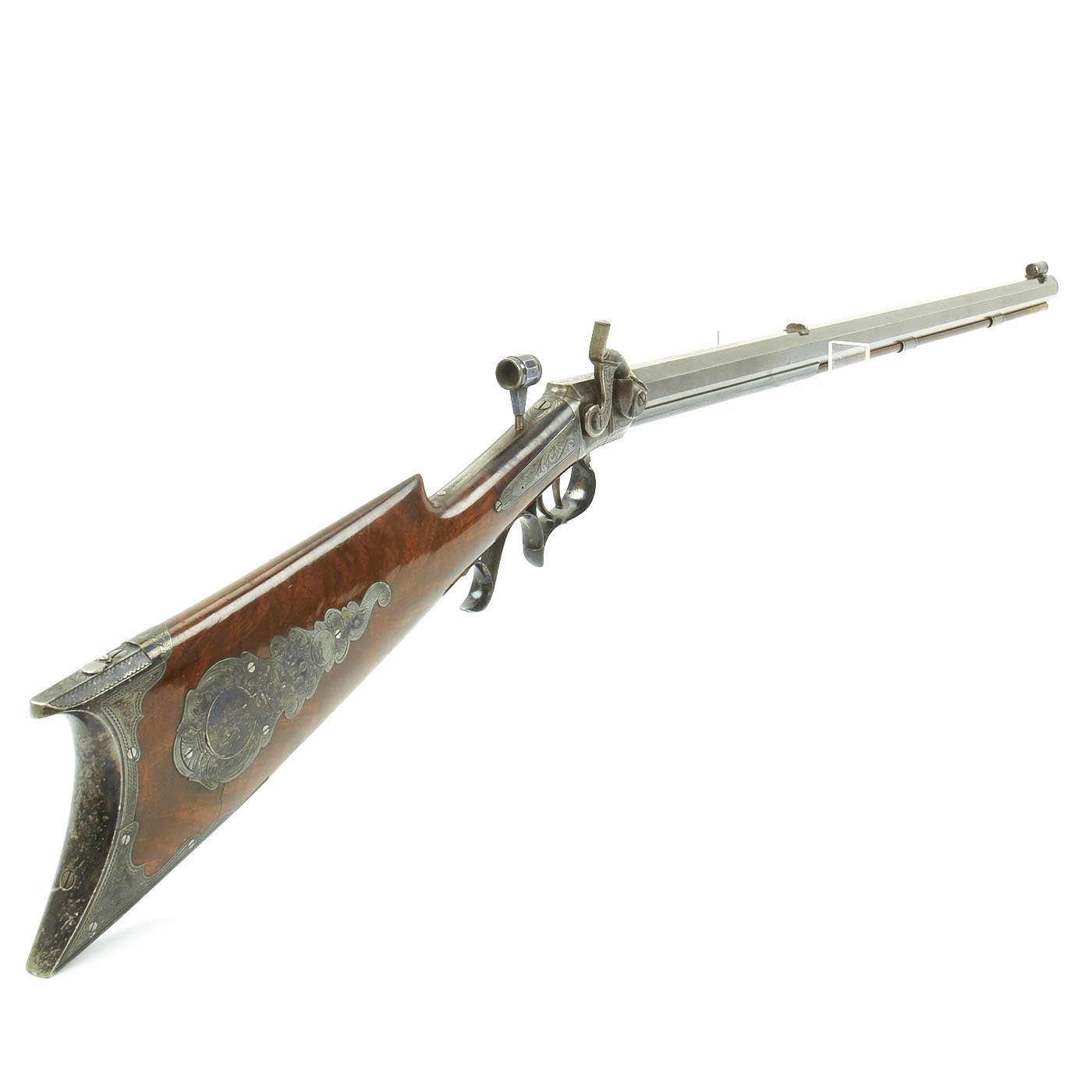 These EDWIN WESSON Match Rifles are extremely RARE and this example is, we feel, the finest in existence today, being close to mint, and is of the highest quality production with all Silver engraved mounts in the best possible original condition. We have left it as found, making no attempt to polish the tarnished silver, with a patina of over a century.