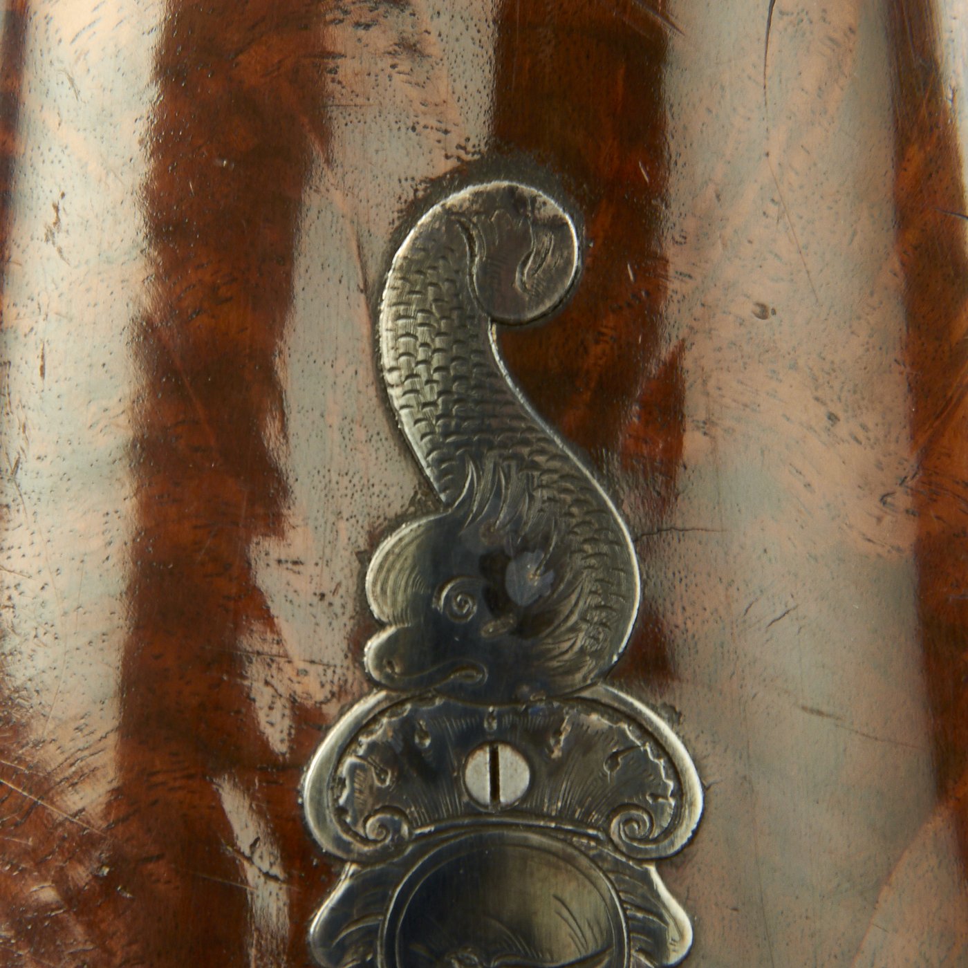 The rifle is fitted with a very high quality KENTUCKY STYLE burl wood hooked butt stock, with ALL SILVER fully engraved mounts. This includes a lovely Silver Patch box, fully engraved featuring a Stag's head and other game animals, which still contains a wad for loading. The wrap around Silver butt plate has a lidded vertical compartment on the top strap. which contains a specialized brass mounted wood barrel cleaning jag with a threaded attachment to the rear. This is intended to be used with the horn tipped figured wooden ramrod. The inner side of this rod has a brass screw cover, under which is a “worm” screw attachment for removing a stuck wad or ball. This screw however can be removed, allowing the jag to screw in. A truly high end cleaning set for this incredible rifle.