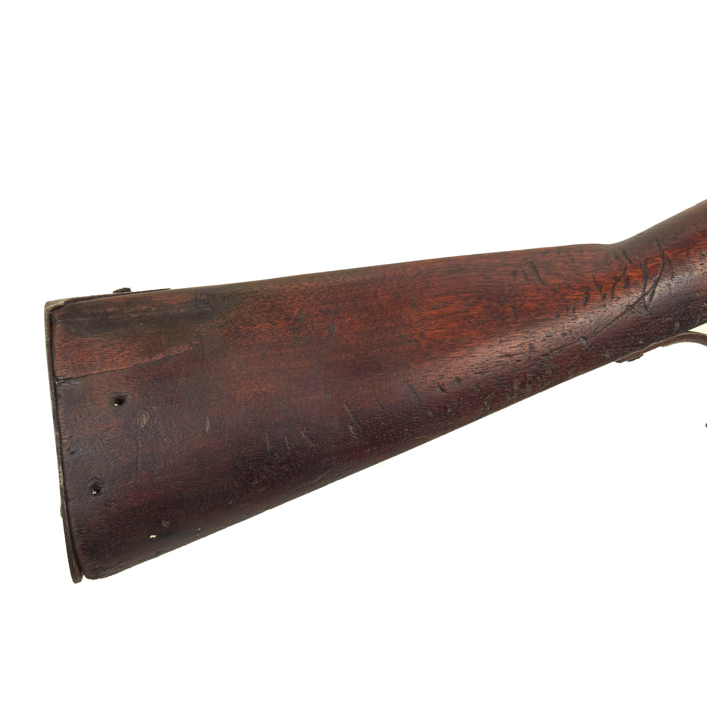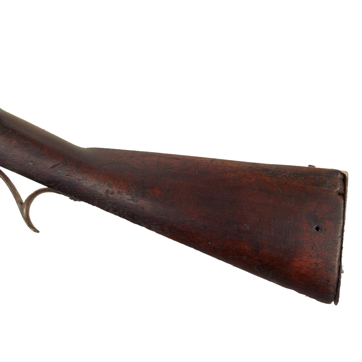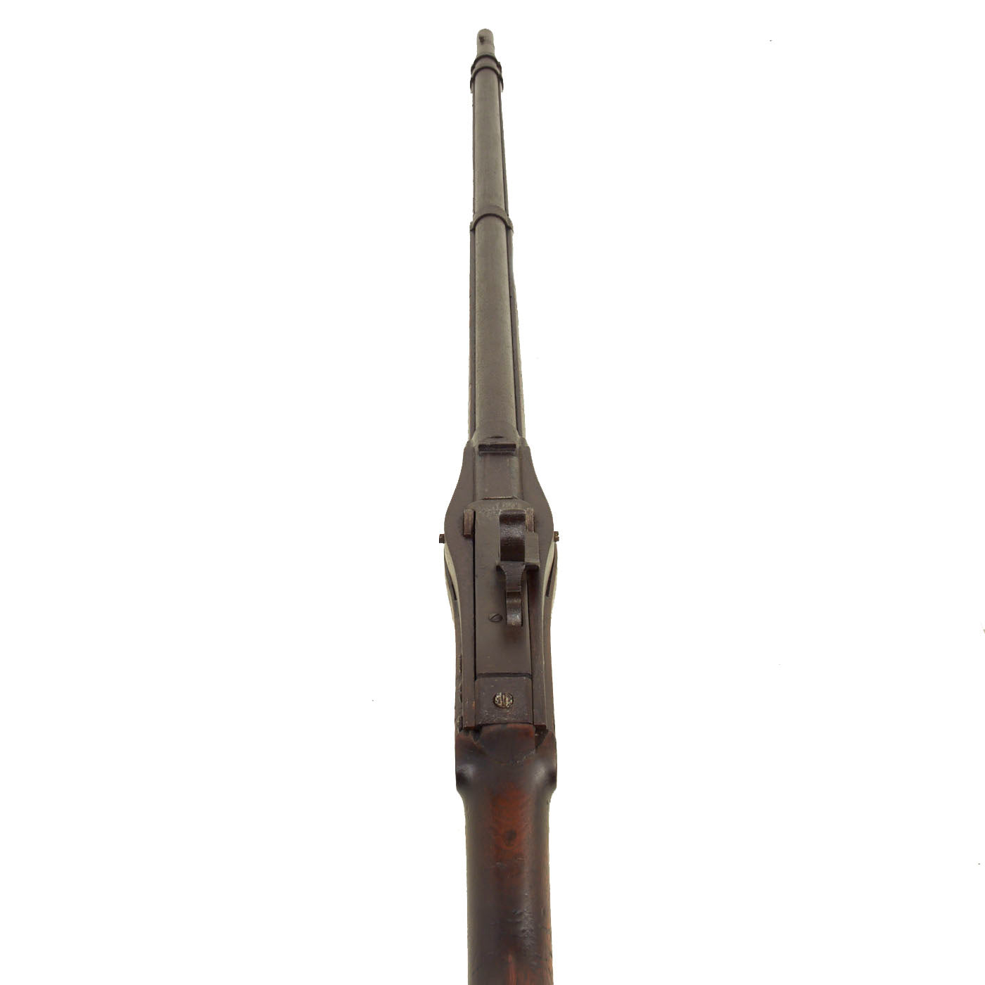 Our example is in very good condition, with mostly legible markings on the breech block, and a lovely aged oxidized patina on the metalwork. The stock is in very good condition, with a lovely dark red-brown color from age and wear. We have noted a a repaired crack just to the rear of the breech, which looks to be common on these rifles due to the design. There are also some cracks next to the butt plate, as well as some on both sides of the stock near the breech mechanism. The large amount of wood removed unfortunately causes the stock to be somewhat delicate.