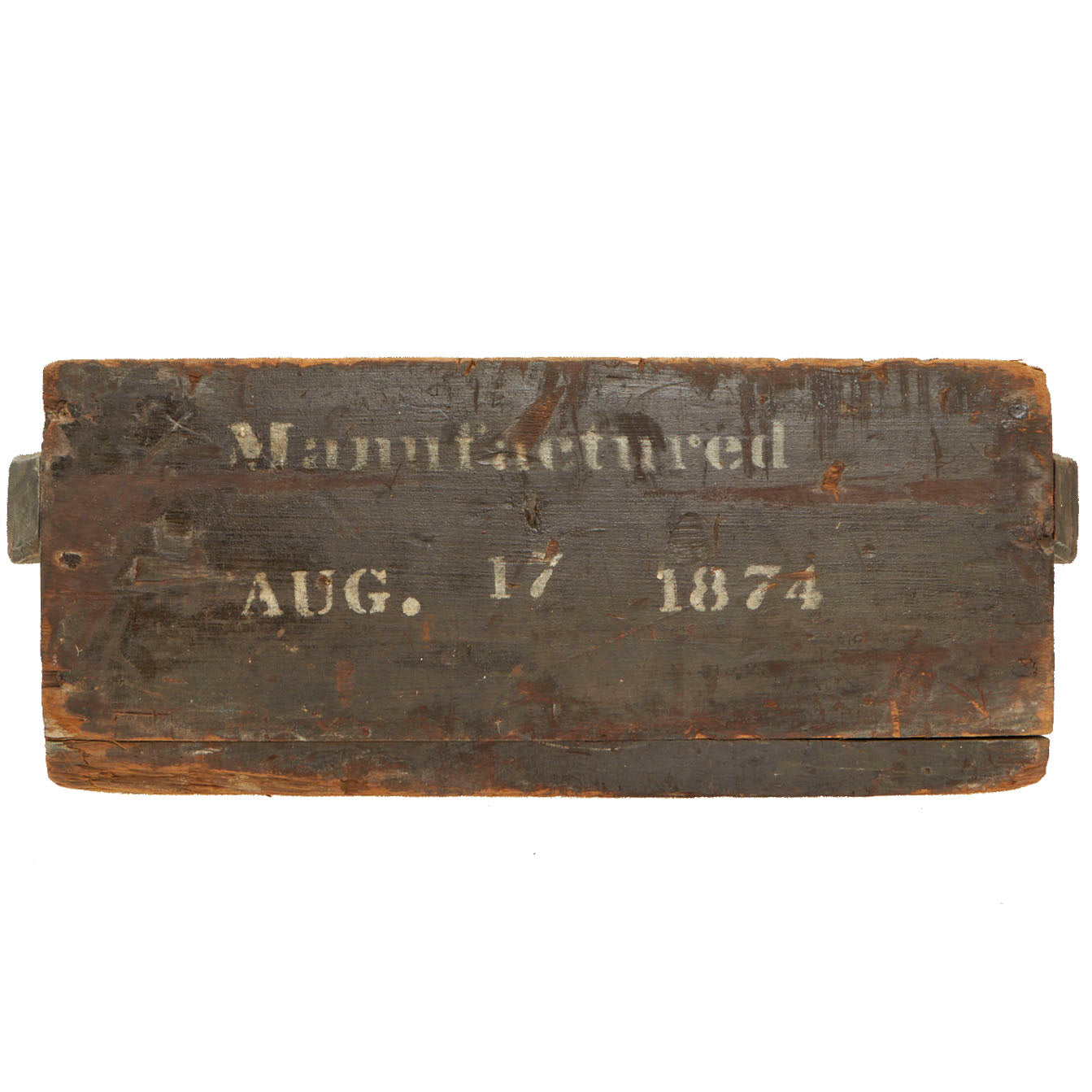 The crate still exhibits the original ordnance green paint, which has developed a pleasing patina over the last 130+ years. The bottom of the crate still has the two Frankford Arsenal Wax Seals on the bottom, which are miraculously intact after all these years. The wooden crate measures approximately 17" x 10 5/8" x 6 1/2" and weighs about 6 lbs.