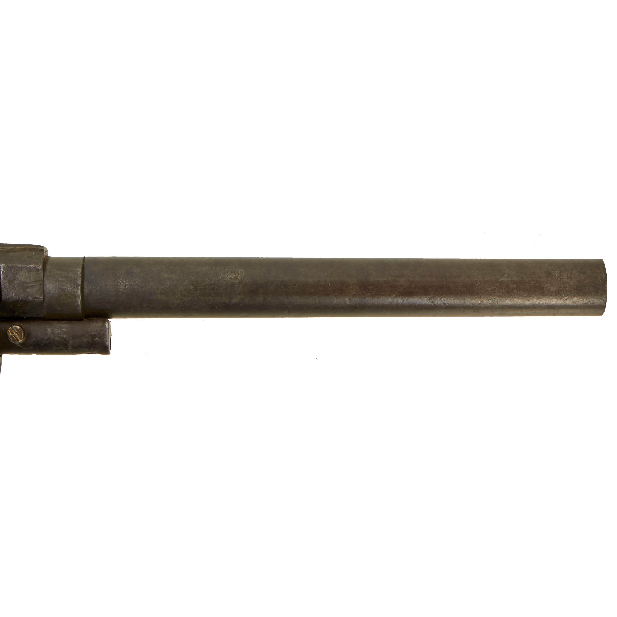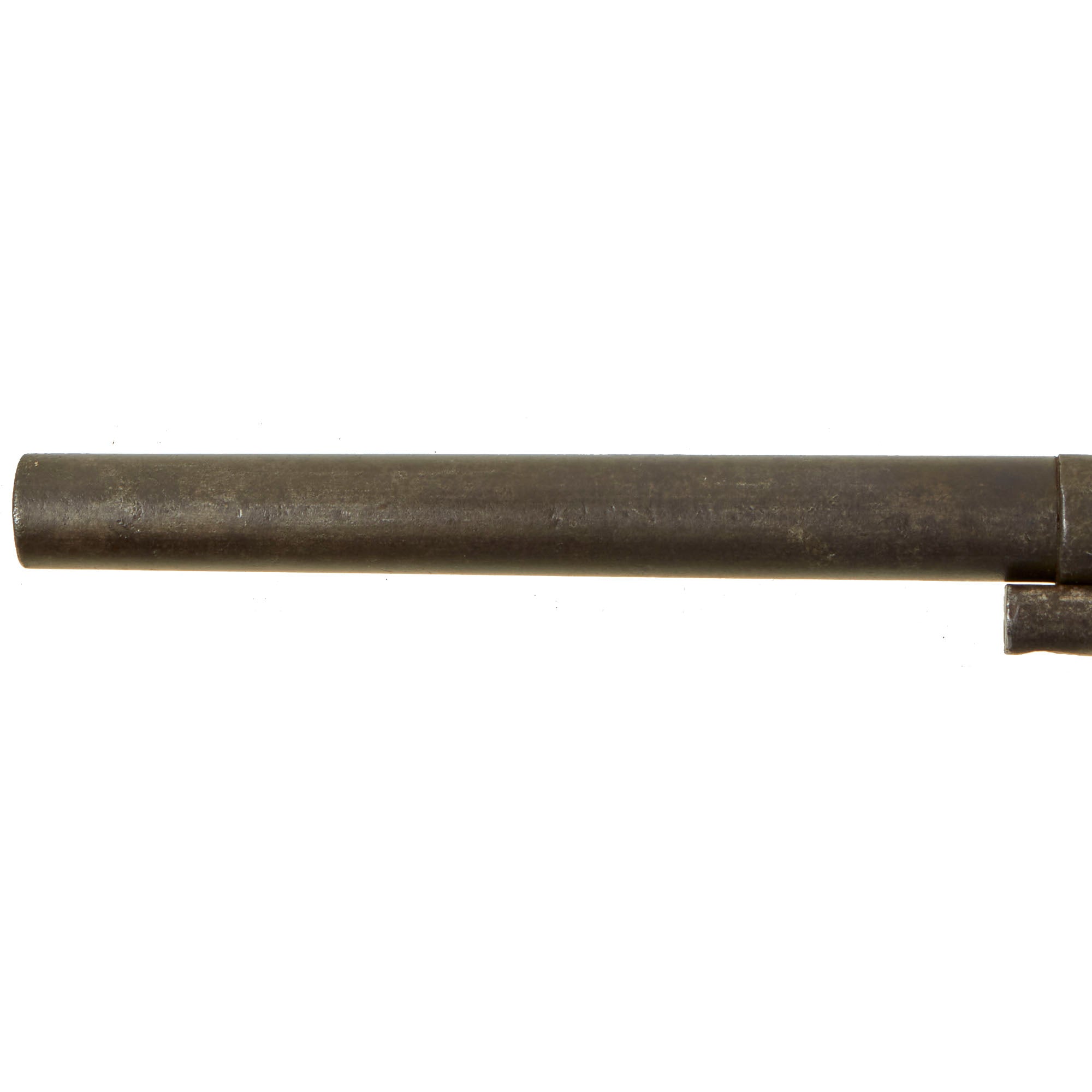 The revolver still correctly has the barrel tip up when the brass screw is removed, allowing cylinder removal. Please take care as some of the locking pins on the receiver are missing, so the cylinder tension and ratchet can fall out when the cylinder is removed. It does cycle with good indexing, though it definitely is finicky, and the trigger pull is quite stiff. The cylinder lockup is also not very strong. The bore shows strong 7 groove rifling, with a mostly bright finish. There is some oxidation and fouling in areas, but it does not look to have been fired much during its service life.