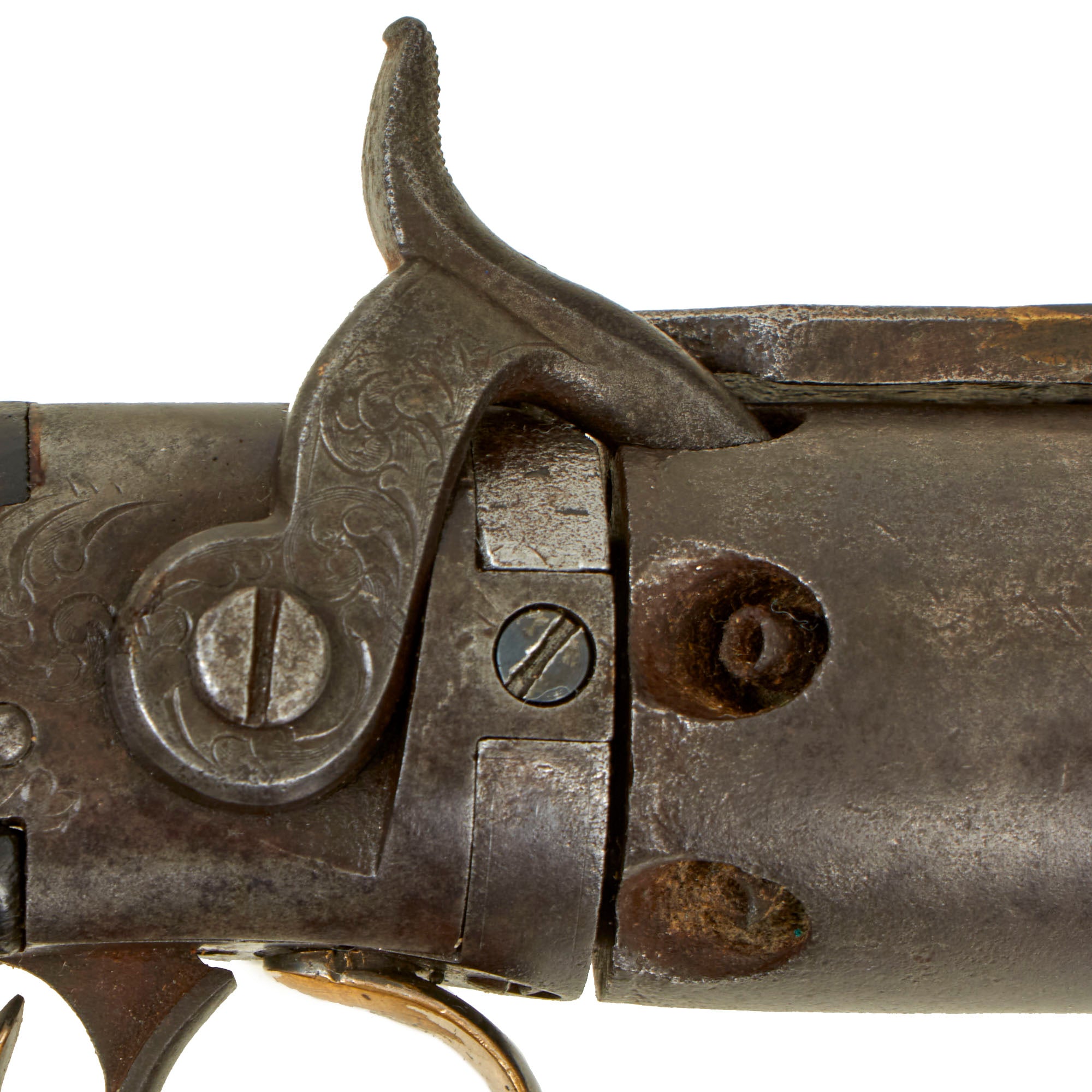 The design features a unique way of unhooking the barrel, which then folds upwards to allow the cylinder to be completely removed in order to be reloaded and then reassembled. It was apparently also considered that extra cylinders could be kept, already loaded, allowing a substantial rate of fire for the 1850s. This was originally accomplished by having a rotating hook around the barrel that went under the arbor pin, however it looks like that hook was removed on this example, so there instead is a screw that goes through the arbor pin securing the indexing wedge. It also looks like the top strap over the cylinder broke at one point, and then was brazed back together. Definitely some great history to this revolver!