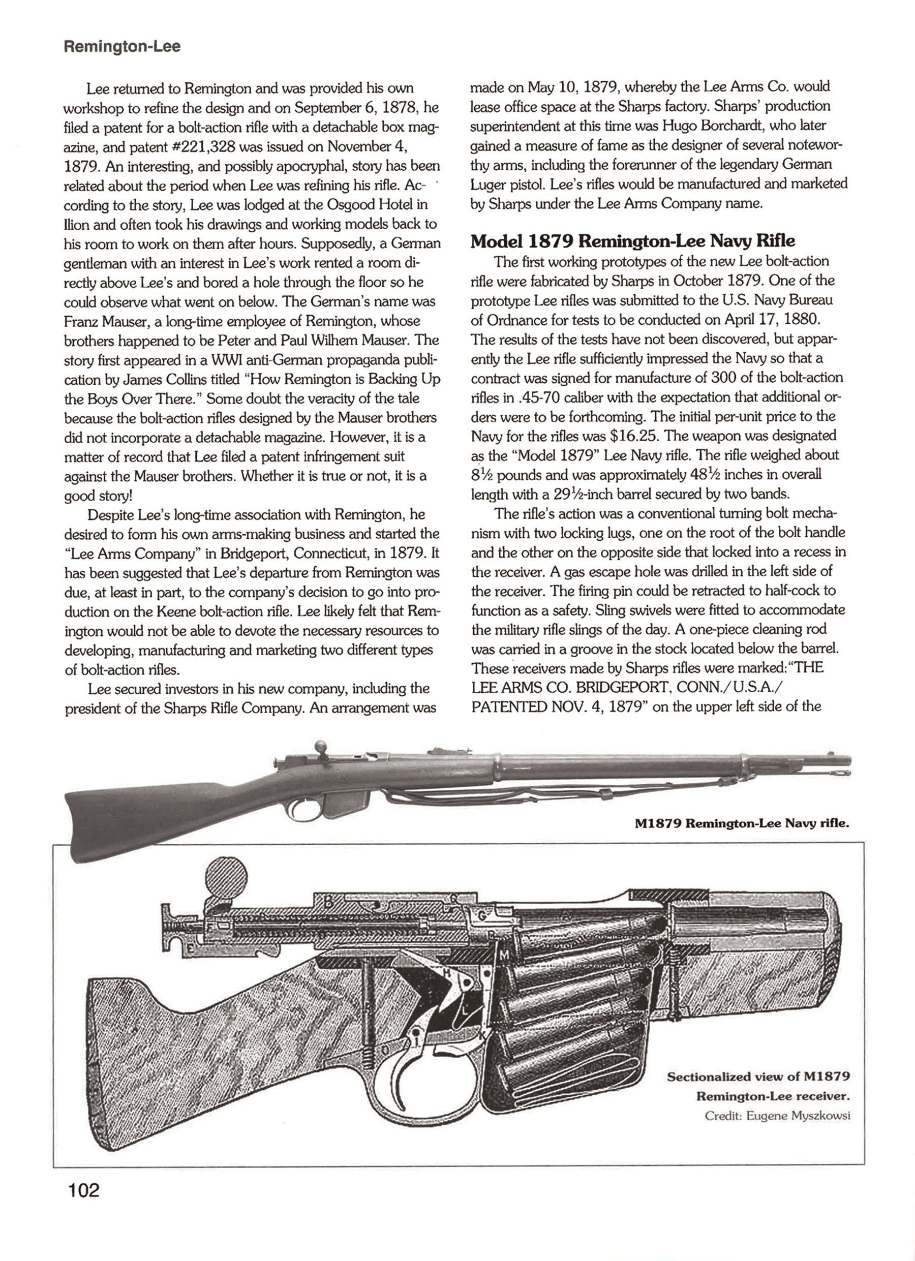 Unfortunately Remington had already produced the Remington-Keene, and were unlikely to want to produce another, so Lee started the Lee Arms Co. to market this design. He then entered into a contract with the Sharps Rifle Co. to use their production facilities, and was able to get a U.S. Navy Contract in 1882 for 300 Lee Model 1879 Rifles in .45-70. This also gave Lee access to designer Hugo Borchardt, who would himself design several noteworthy arms.